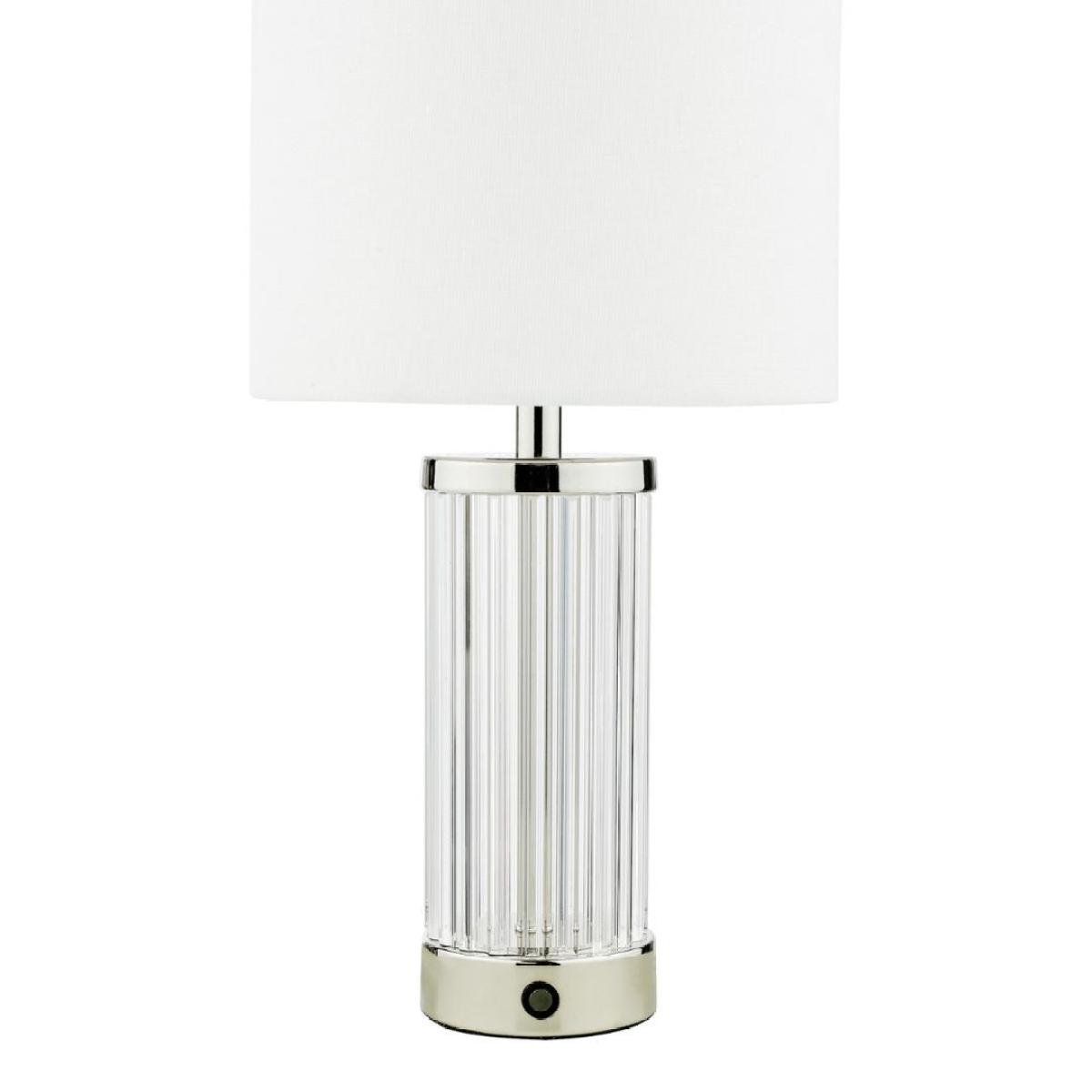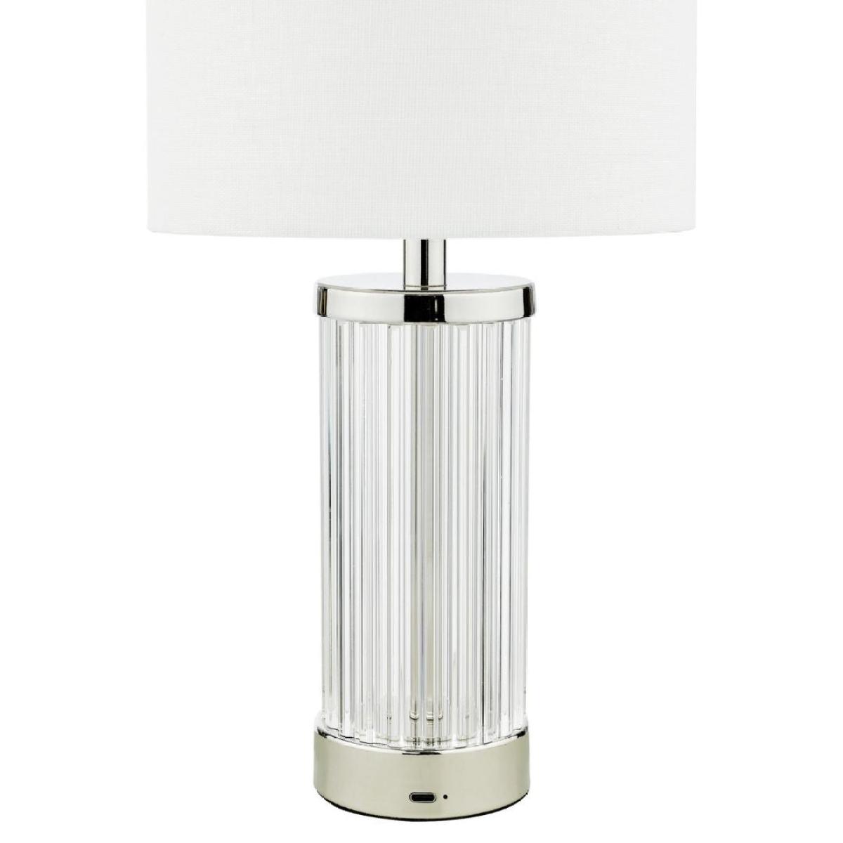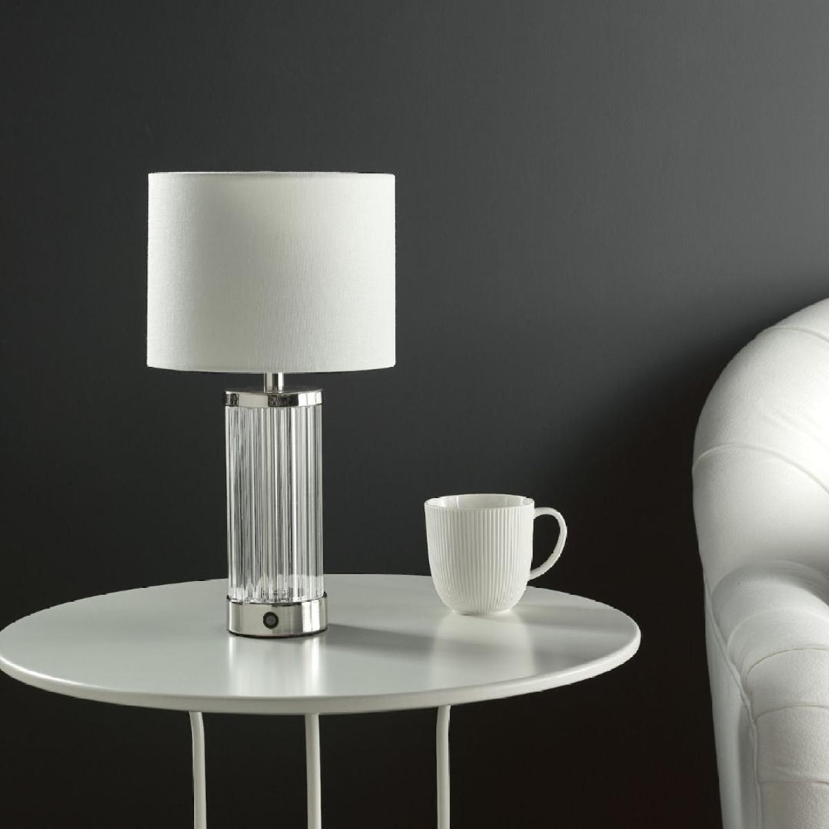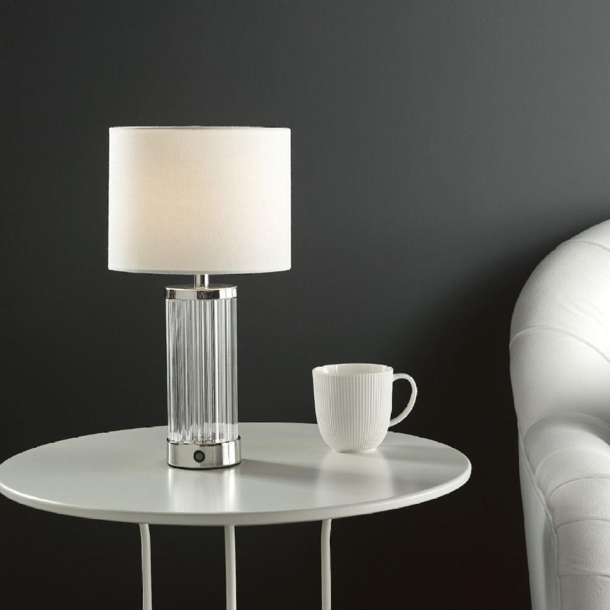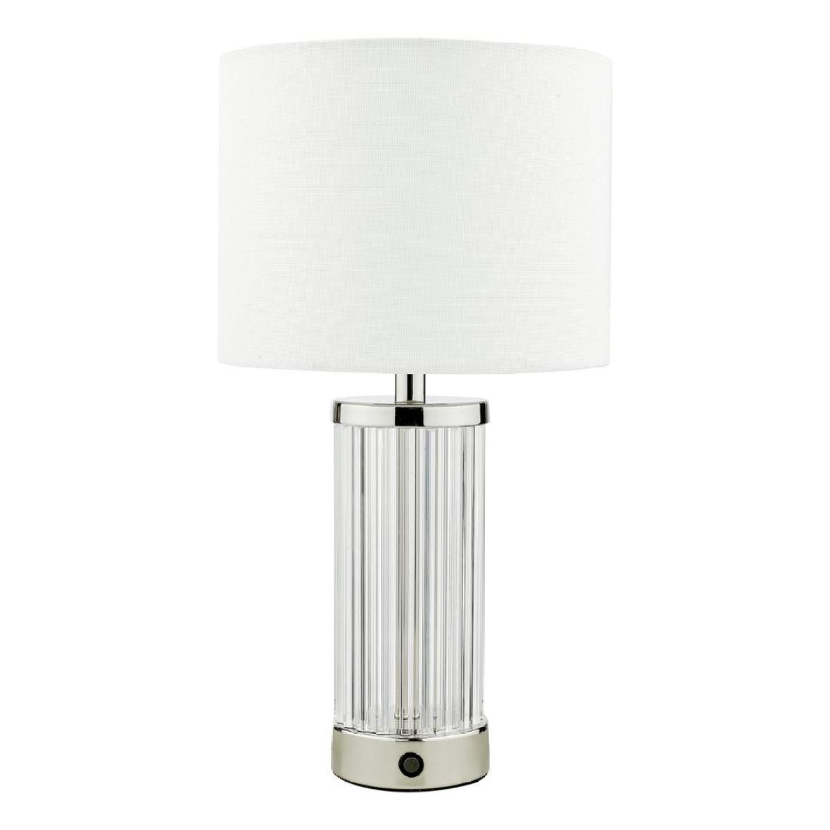 Enrico rechargeable LED table lamp with a polished nickel and ribbed glass base, white linen drum shade and touch dimmer function. A fusion of modern design and practical functionality, this lamp exudes contemporary elegance. Cordless and rechargeable, the Enrico lamp offers versatility and convenience. Perfect for illuminating any space without the constraints of wires, while the 3-stage touch dimmer function also allows you to adjust the brightness to suit any mood or task. Whether adorning a bedside table, desk or living room sideboard, the Enrico LED table lamp seamlessly integrates style and innovation into your home decor. Enrico rechargeable LED table lamp with a polished nickel and ribbed glass base, white linen drum shade and touch dimmer function. A fusion of modern design and practical functionality, this lamp exudes contemporary elegance. Cordless and rechargeable, the Enrico lamp offers versatility and convenience. Perfect for illuminating any space without the constraints of wires, while the 3-stage touch dimmer function also allows you to adjust the brightness to suit any mood or task. Whether adorning a bedside table, desk or living room sideboard, the Enrico LED table lamp seamlessly integrates style and innovation into your home decor.