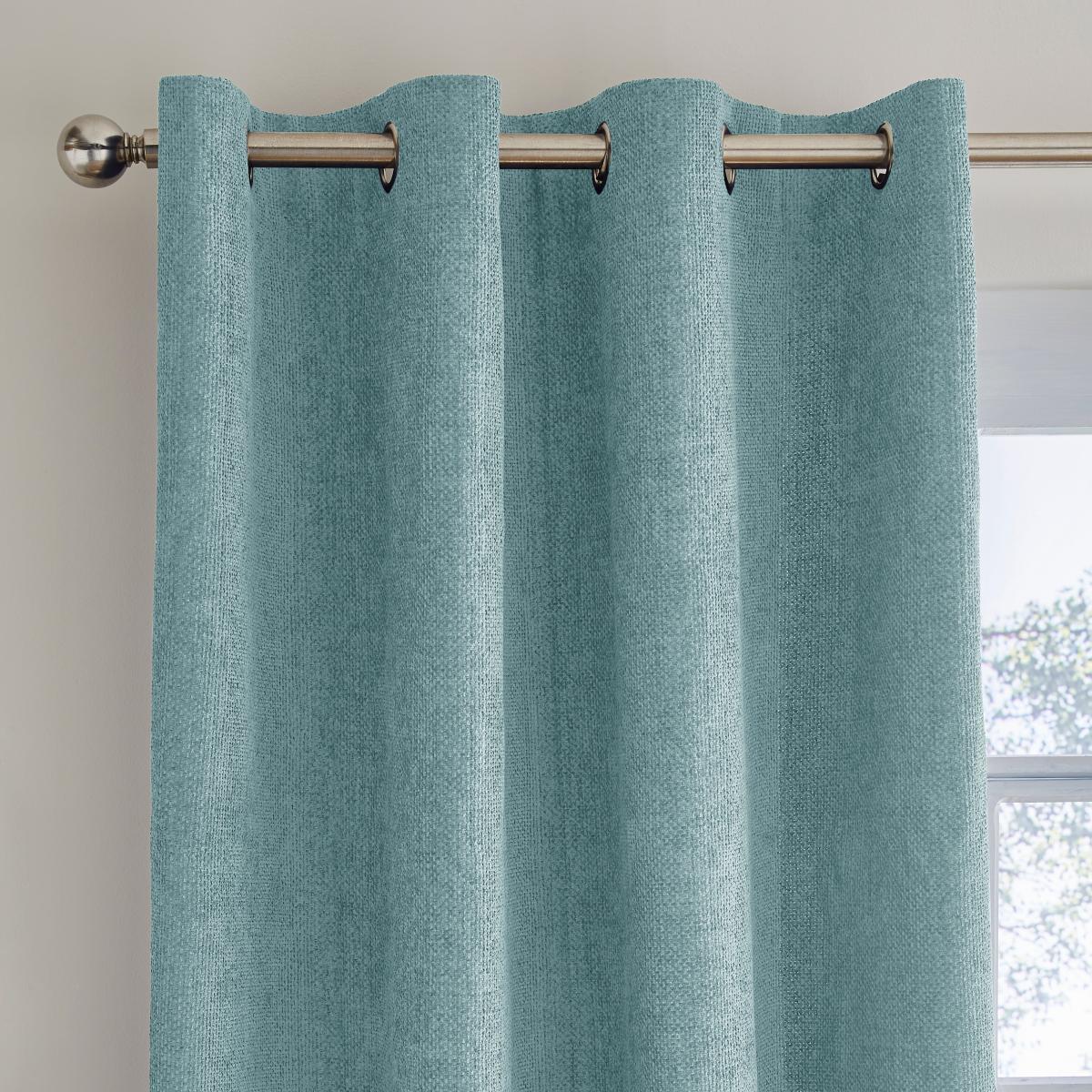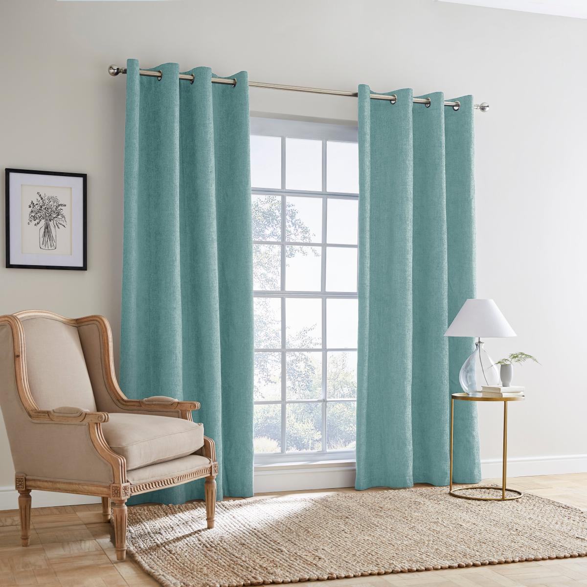 Crafted beautifully from a chunky woven chenille fabric, the Ensley Cosy Chenille Seafoam Thermal Eyelet Curtain will add a welcoming touch to your living areas. The curtains are made from polyester with a durable and sturdy brushed steel header, making them easy to install.