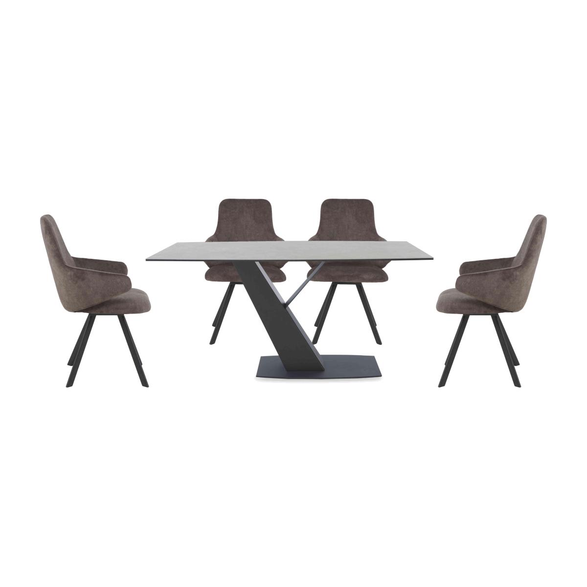 Contemporary industrial style with a sleek ceramic finish – that’s the beauty of the carefully-curated Enterprise collection. Combining gorgeous finishes – Italian ceramic surfaces, the dining table’s black powder-coated metal base, and the crushed velvet upholstery of the dining chairs – with bold modern shapes and creative lines, Enterprise looks fabulous in any dining space. Mix and match the range’s swivel side and arm dining chairs with the boat-shaped dining table or choose one of the ready-made dining sets for a look that’s effortlessly on trend. Everything about this dining set is stylish – and space-saving. The compact table has a V-shaped base, and the dining chairs’ swivel bases make it easy for diners to leave the table. Why you'll love it Compact industrial style with a family-friendly finish. Boat-shaped top is made of Italian ceramic on glass. V-shaped pedestal base in black powder-coated metal. Ceramic top is hardwearing, heat-, scratch- and chip-resistant, and easy to clean. Set includes 4 swivel dining arm chairs. Crushed velvet upholstery in a chocolate brown. Swivel bases with slender black metal legs. This dining set is part of the Enterprise dining collection. What you need to know Table has a ceramic and glass top, and a metal frame. Seats 6. Chairs are cushioned with foam. Metal frame and legs. Please note that the ceramic table top is not 100% heatproof. We recommend using coasters and placemats at all times. This dining table is heavy – please be careful when moving it.