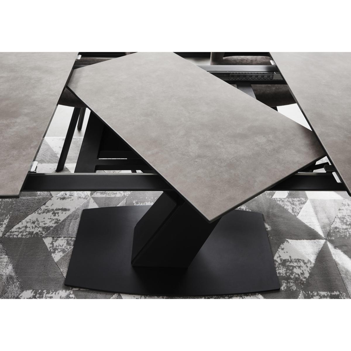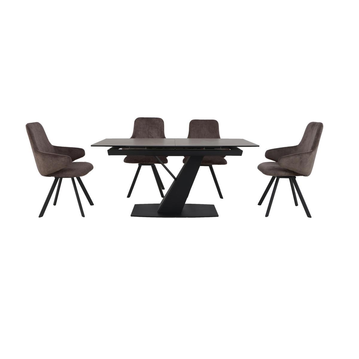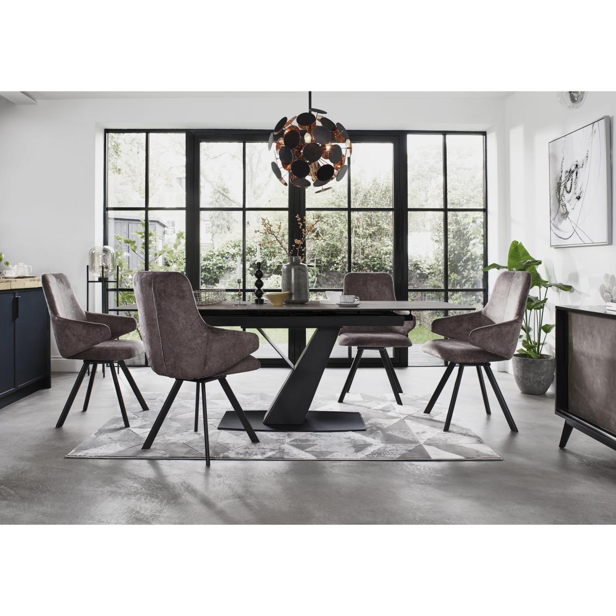 Contemporary industrial style with a sleek ceramic finish – that’s the beauty of the carefully-curated Enterprise collection. Combining gorgeous finishes – Italian ceramic surfaces, the dining table’s black powder-coated metal base, and the crushed velvet upholstery of the dining chairs – with bold modern shapes and creative lines, Enterprise looks fabulous in any dining space. Mix and match the range’s swivel side and arm dining chairs with the boat-shaped dining table or choose one of the ready-made dining sets for a look that’s effortlessly on trend. Striking by design, this contemporary industrial dining set features a gorgeous ceramic-topped dining table with a truly innovative swivel extension mechanism and four very cool dining chairs. Why you’ll love it. Italian ceramic-topped dining table and chair set is cool and contemporary. Casual industrial style. On trend boat-shaped table top finished in taupe. Striking asymmetric angled pedestal base in black powder-coated metal. Innovative extension mechanism – integrated leaf smoothly swivels into place. With 4 retro-style swivel chairs with swooping arms. Crushed velvet upholstery in a chocolate colour. Slender black metal legs. Ceramic is hardwearing and easy to clean. What you need to know. Dining table seats 6 and extends to seat 10. This table is heavy – please be careful when moving it. Complete your dining room with the Enterprise sideboard. Need more dining chairs? Mix and match Enterprise side chairs and arm chairs.