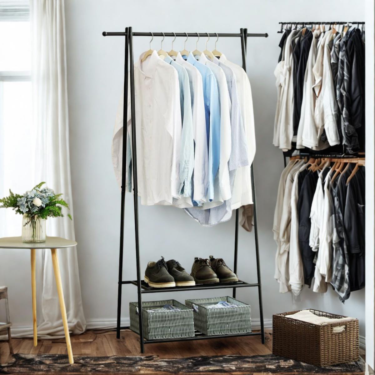 Features two parallel lower shelves made of metal tubes for added stability, with plastic caps on the feet to protect your floor from scratches. Finished with spray paint for an anti-rust, waterproof surface that is easy to clean with a damp cloth, the A-shaped frame brings a simple and stylish touch. Hang clothes, hats, and ties on the top rail, while the two-tier shelves below offer extra space for shoes, storage boxes, or other household items. The twin lower shelves enhance both visual appeal and utility, making this piece suitable for various rooms in your home. Lightweight and simple to set up with an Allen key and instruction manual included.