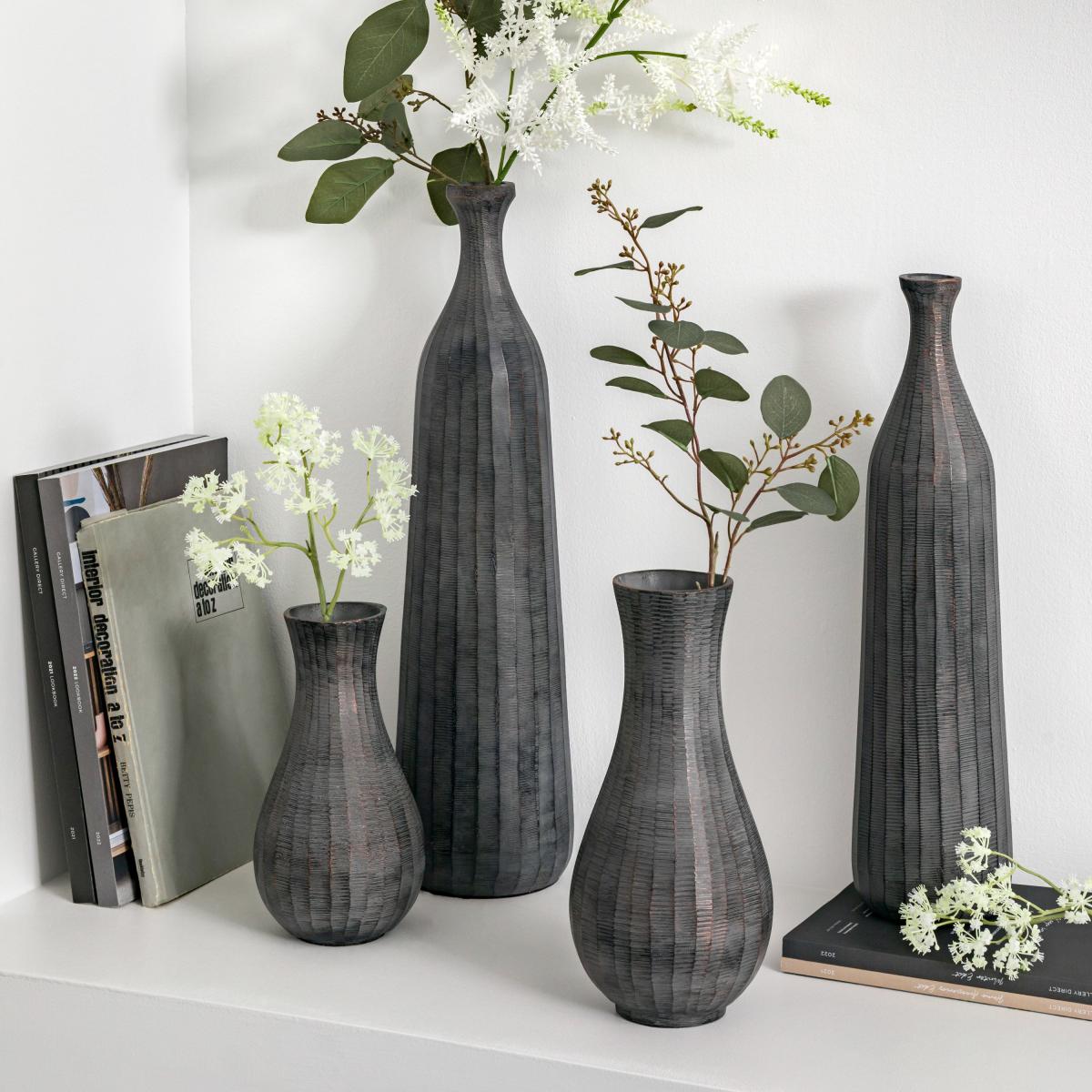 I love this tall bottle vase for its sophisticated antique grey finish, which adds a touch of understated elegance to any space. It works particularly well in minimalist or modern interiors, where its sleek silhouette can stand out or blend seamlessly. Practical styling ideas include pairing it with dried flowers or long-stemmed greenery for a clean, sculptural look, or letting its own texture shine as a standalone statement piece. Its elongated shape makes it ideal for narrow console tables or mantelpieces, offering height and visual interest without overwhelming the surroundings.