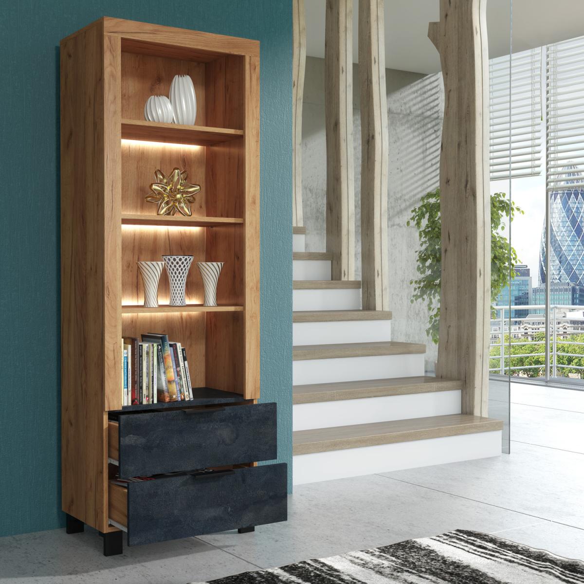 Add a modern touch to your living space with this stylish display cabinet. The oak and black concrete effect finish creates a contemporary yet warm look that complements any home decor. The item features an open area with three shelves and two drawers below for extra storage. White LED lights are included, they are mains powered with a UK power adapter and foot switch to turn them on and off. Note that this is a flatpack item and will require assembly. Picture instructions, and a written notice are included with the item, these should be looked over carefully, before attempting assembly.