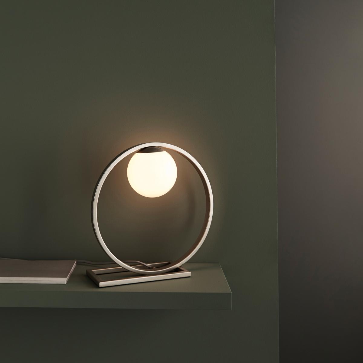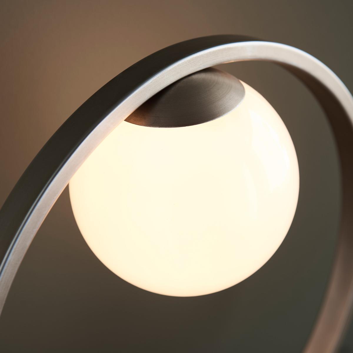 Perfect for pared-back interiors, this elegant table light makes a strong sculptural statement. A circular, brushed silver frame interlinks with a rectangular base to support an opal glass sphere. Combine with the floor light for a distinctive contemporary look.
