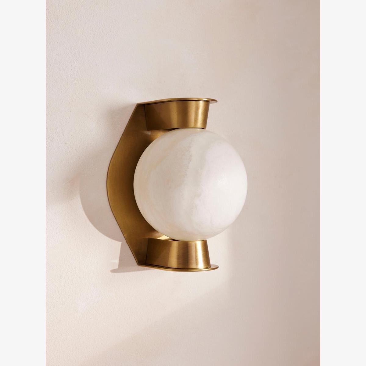 Made from natural alabaster, this wall light's bulb is finished with natural veining that means each one is completely unique. Inspired by Soho House Berlin, the Enzo wall light's globe-shaped bulb is made from natural alabaster for a soft, cosy glow. Treated with an antique finish, its rounded metal frame sits flush against the wall.