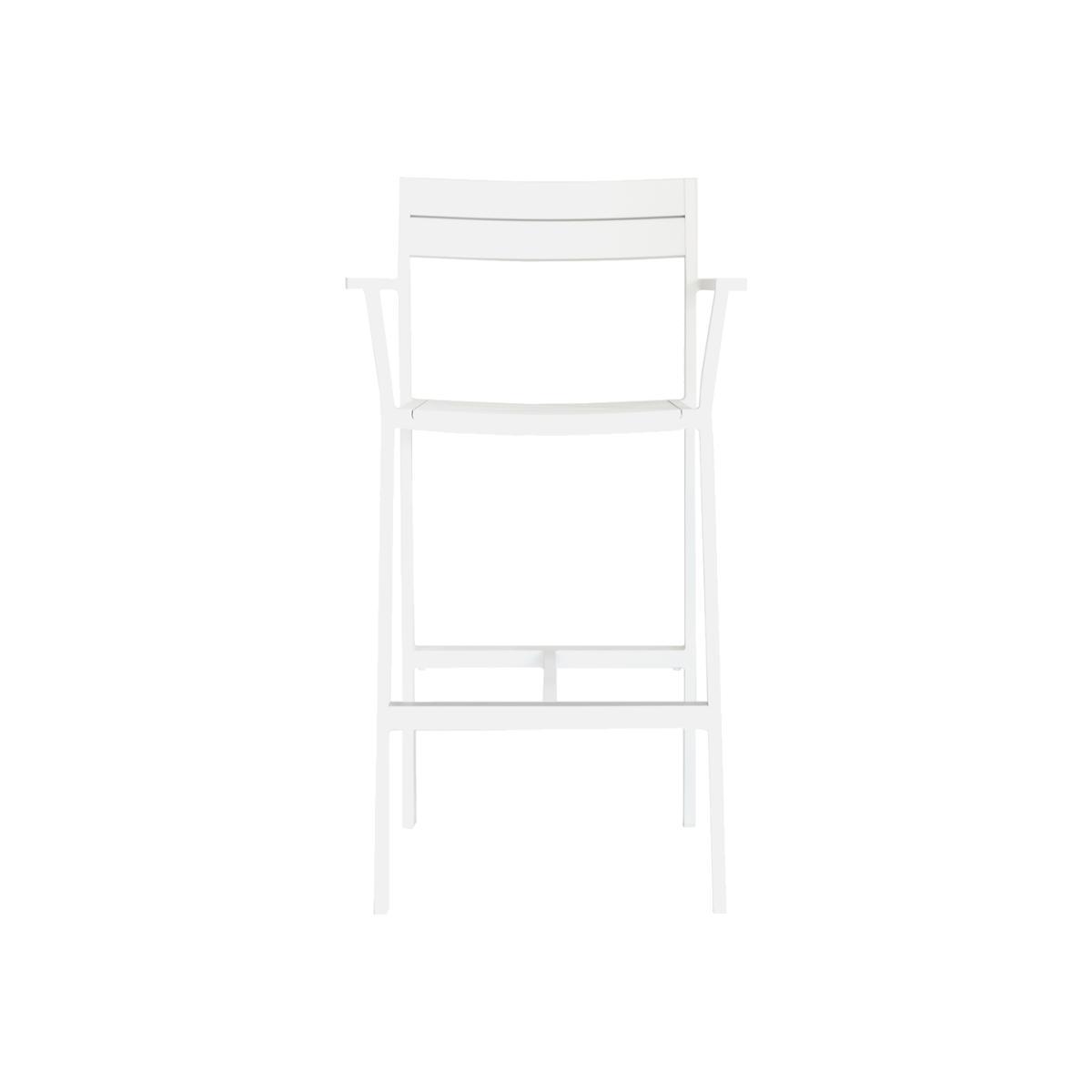 Perfect for enjoying leisurely evenings in the summer sun, the white Eos Bar Stool by Matthew Hilton will lend a touch of contemporary design to any outdoor space. With its slim, clean lines and versatile nature, the Eos Bar Stool is perfectly suited to the modern home. Lightweight, smartly proportioned and stackable, the stool is crafted from aluminium with commercial grade white powder-coating to resist signs of ageing and is finished with an anodised aluminium foot rest and injection-moulded nylon floor glides. Named after the Greek goddess of dawn, the Eos Bar Stool is part of Matthew Hilton's coveted Eos collection. Featuring a range of chairs, tables and benches perfect for outdoor use, the award-winning, luxury Eos Outdoor Range was used in the VIP enclosures during the 2012 Olympic Games.