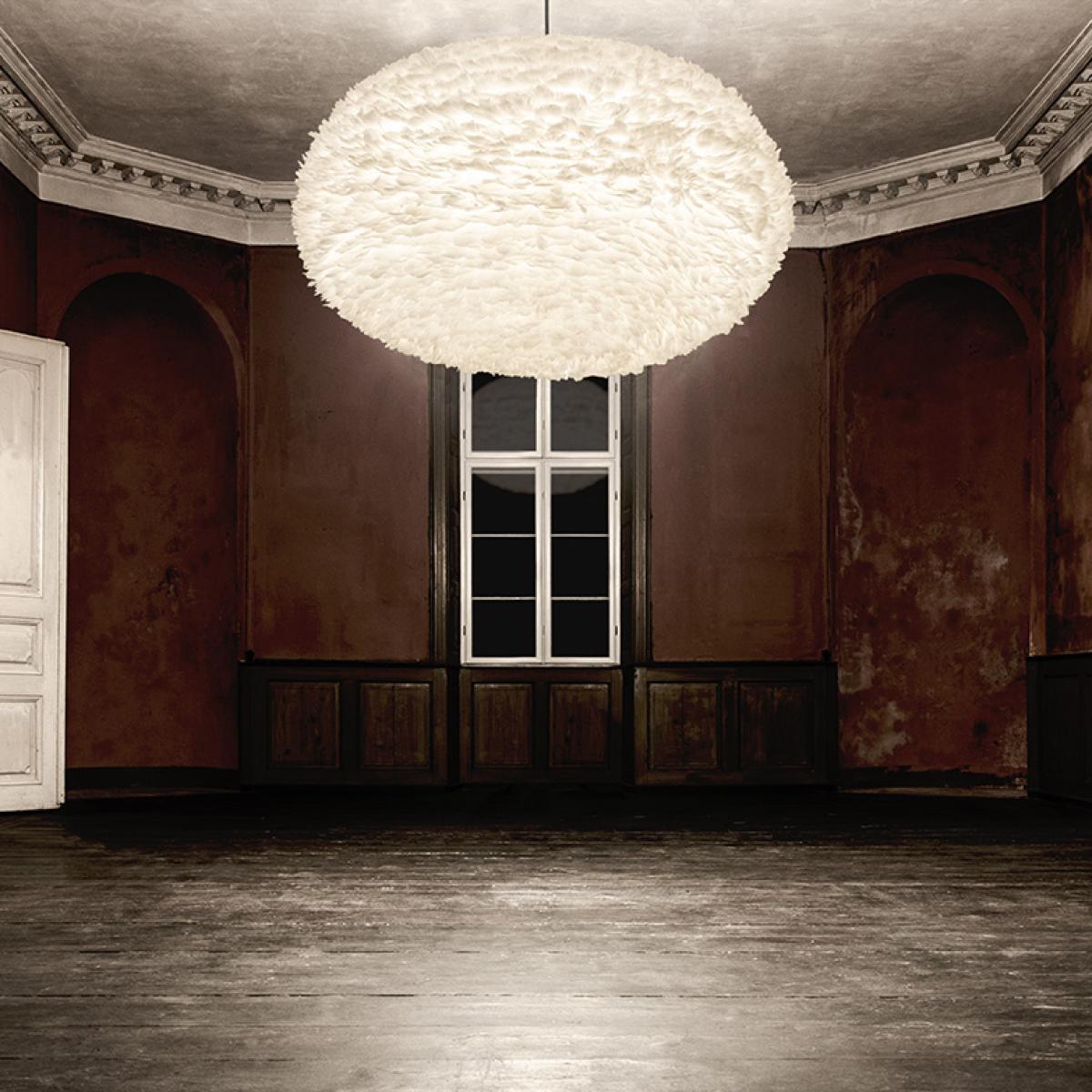 The beautiful and unique Eos lamp was designed by Soren Ravn Christensen for the Danish brand Umage / Vita. The lamp is made of white goose feathers and paper and comes delivered in a flat box with mounting instructions that are very easy to follow. The lamp fits perfectly in most rooms and spreads a warm, diffused light when lit. Available in different sizes.