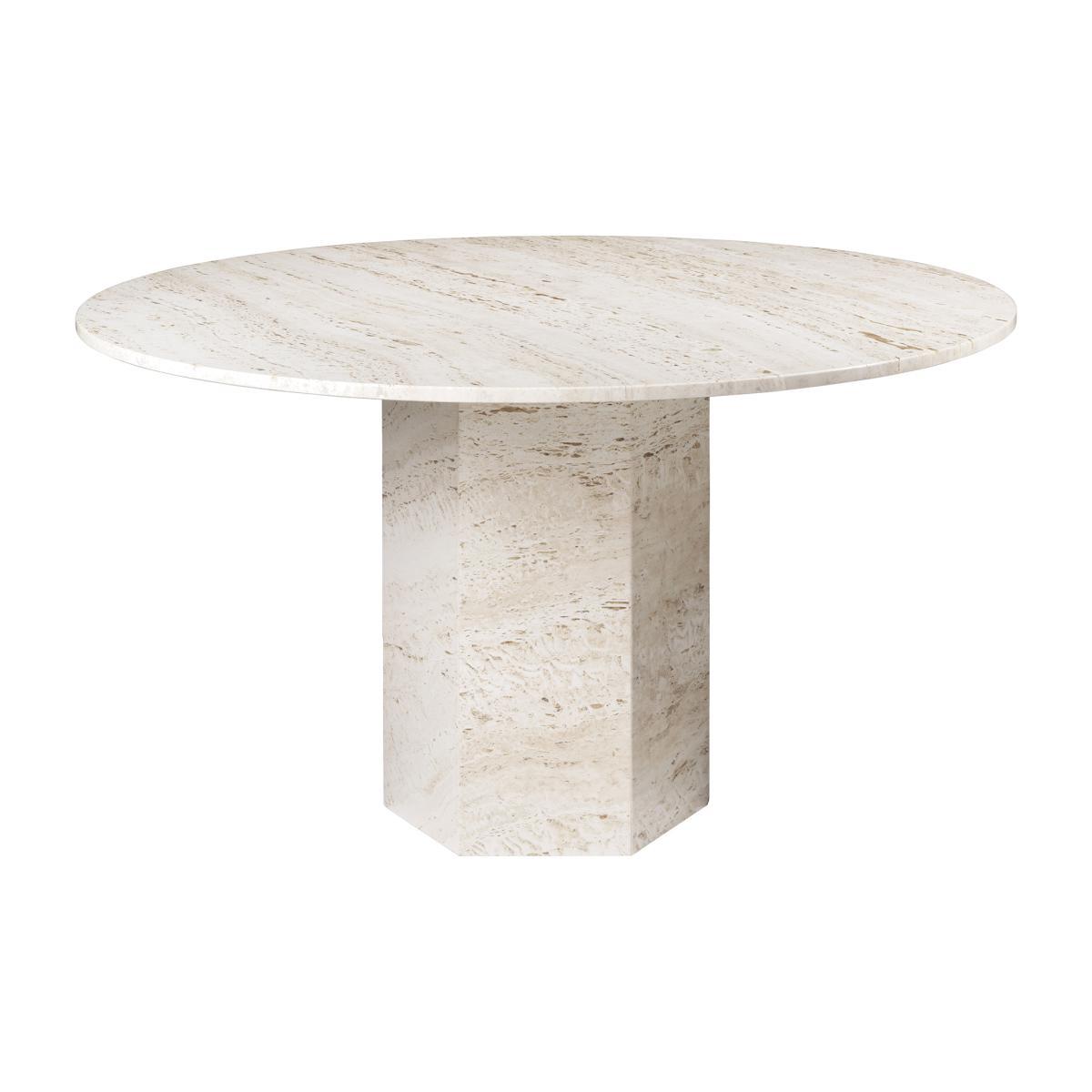 Designed by Gam. Fratesi, The Epic Dining Table is a sculptural form inspired by Greek columns and Roman architecture, brought to life by Copenhagen-based manufacturer GUBI. Named for the epic poems of ancient times, the table displays the natural beauty of travertine stone, highlighting its veins and texture. Combining two simple geometric shapes, the monolithic form references classical columns. As noted by Danish-Italian design duo Gam. Fratesi, Without material there is no soul. Positioning the material at the centre of the project is an intellectual act and celebrating unusual stones and natural finishes is aligned with our practice and GUBI's cerebral and contemporary take on the traditional.