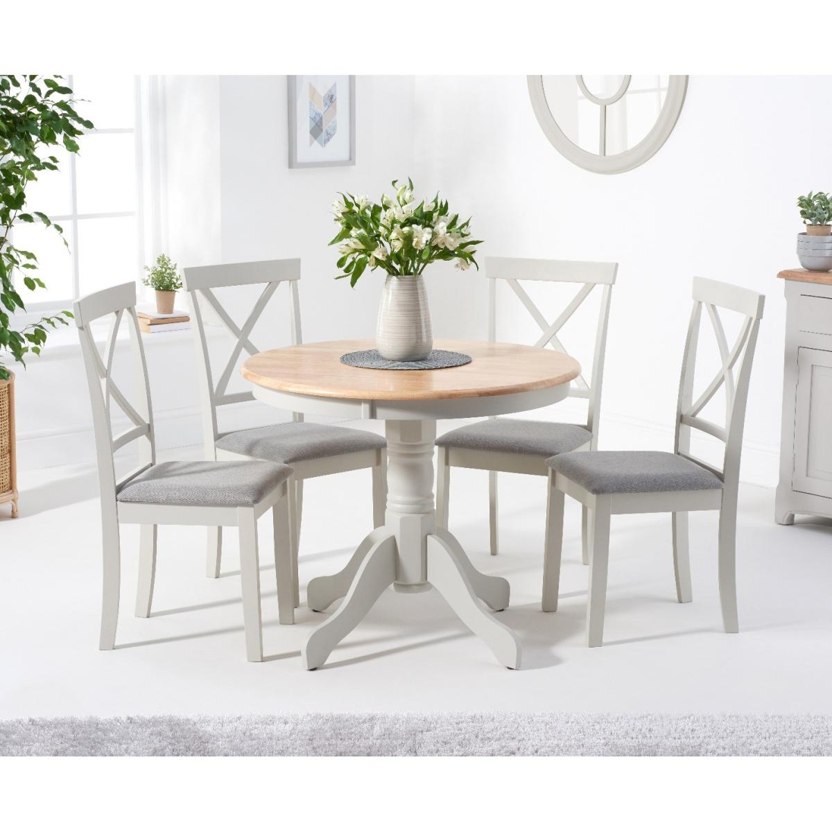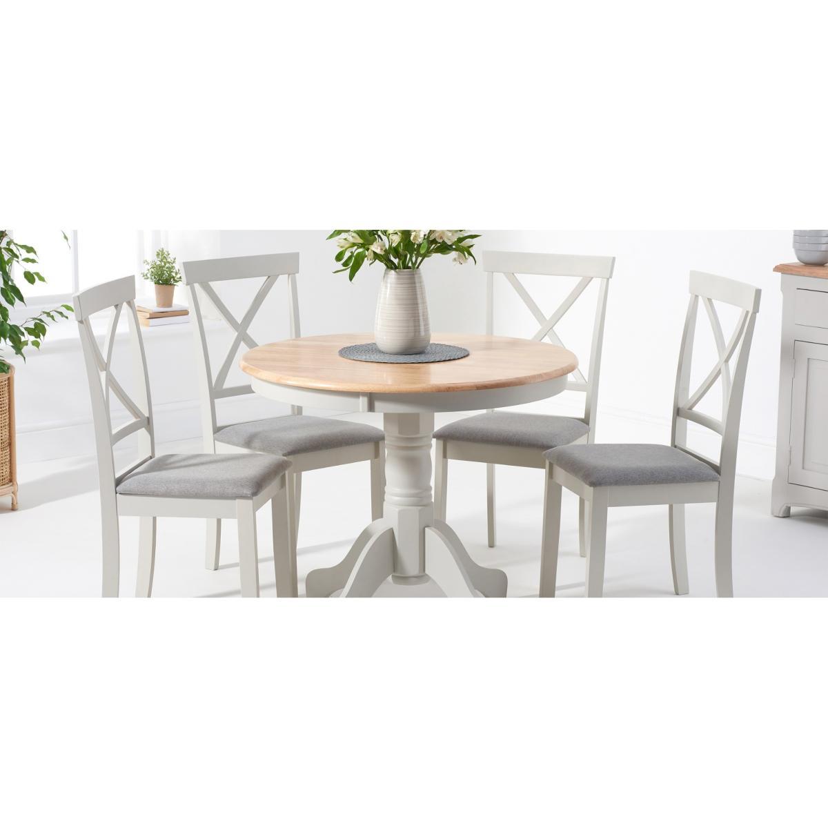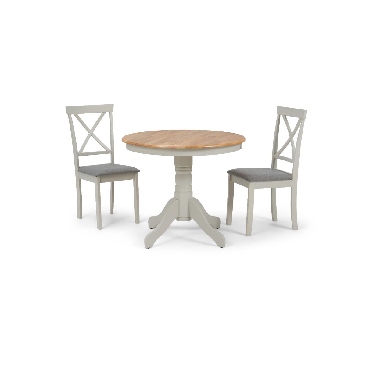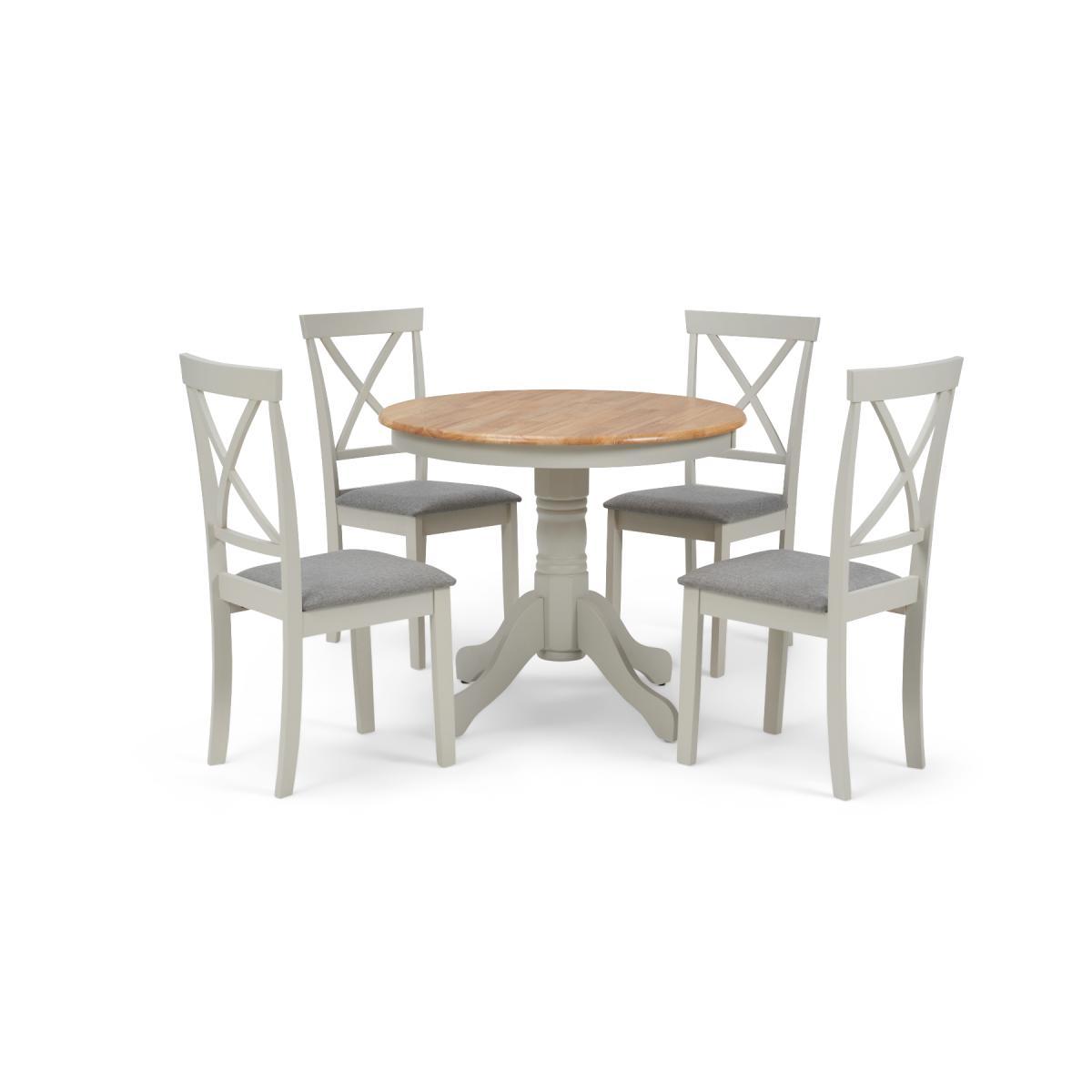 Perfect for small spaces, the Epsom 90cm Oak and Grey Dining Table with Chairs with Fabric Seats is a small, stylish set. The round Epsom table features a smooth lacquered table top contrasting with a grey pedestal base for a chic two toned look. Matching chairs complement the table with a cross back design and comfortable fabric seats. Small and stylish dining set Pedestal table is chic and space saving Designed to seat 4 Solid wood with grey painted pedestal Lacquered table top for that two-toned look Matching hardwood chairs Cross back design and comfortable padded fabric seats
