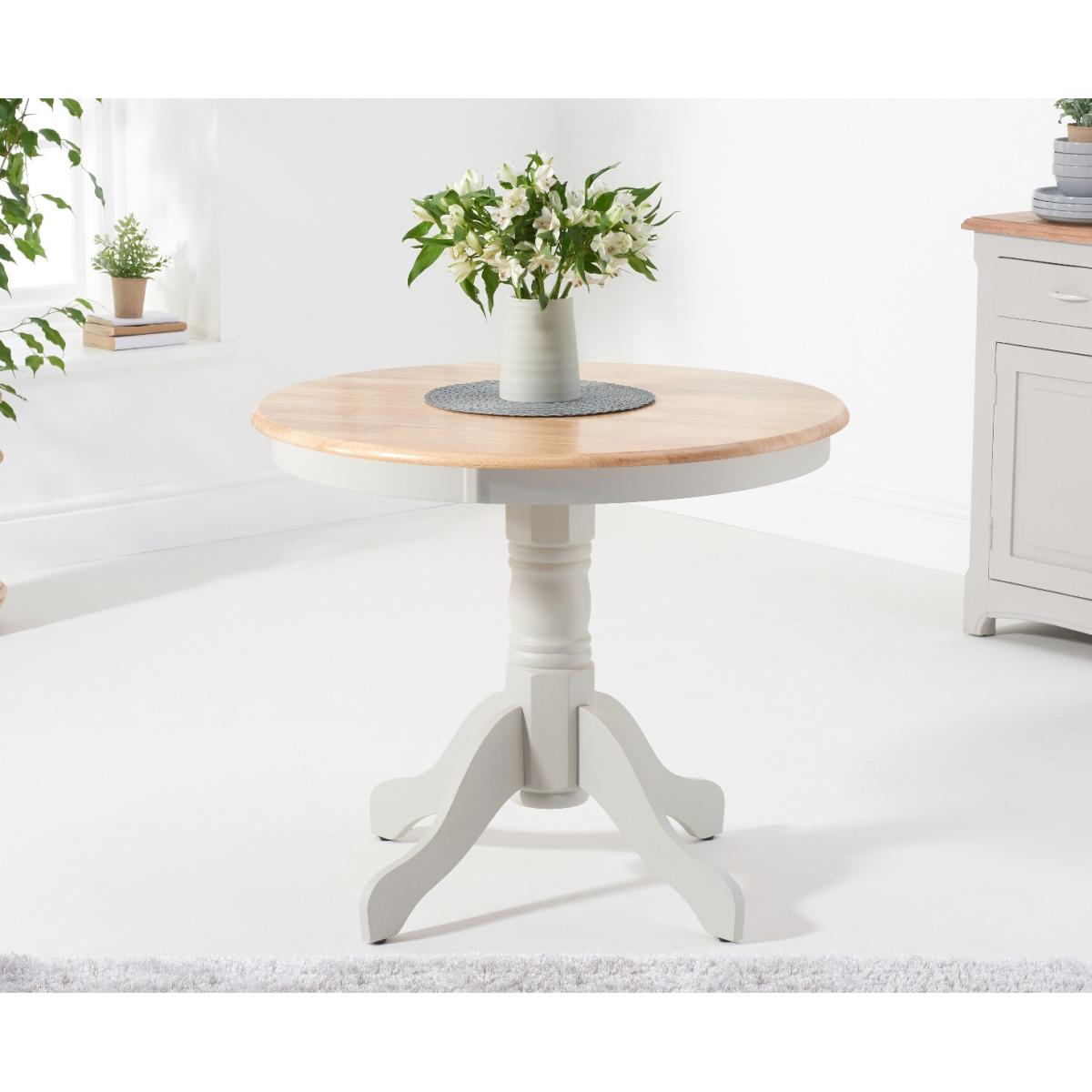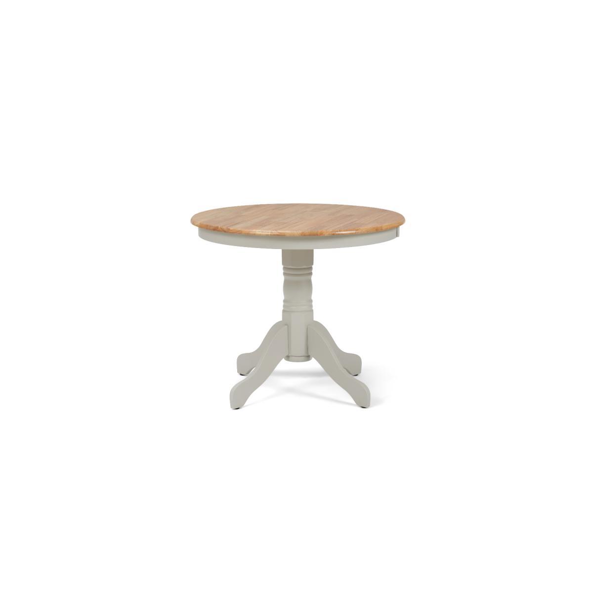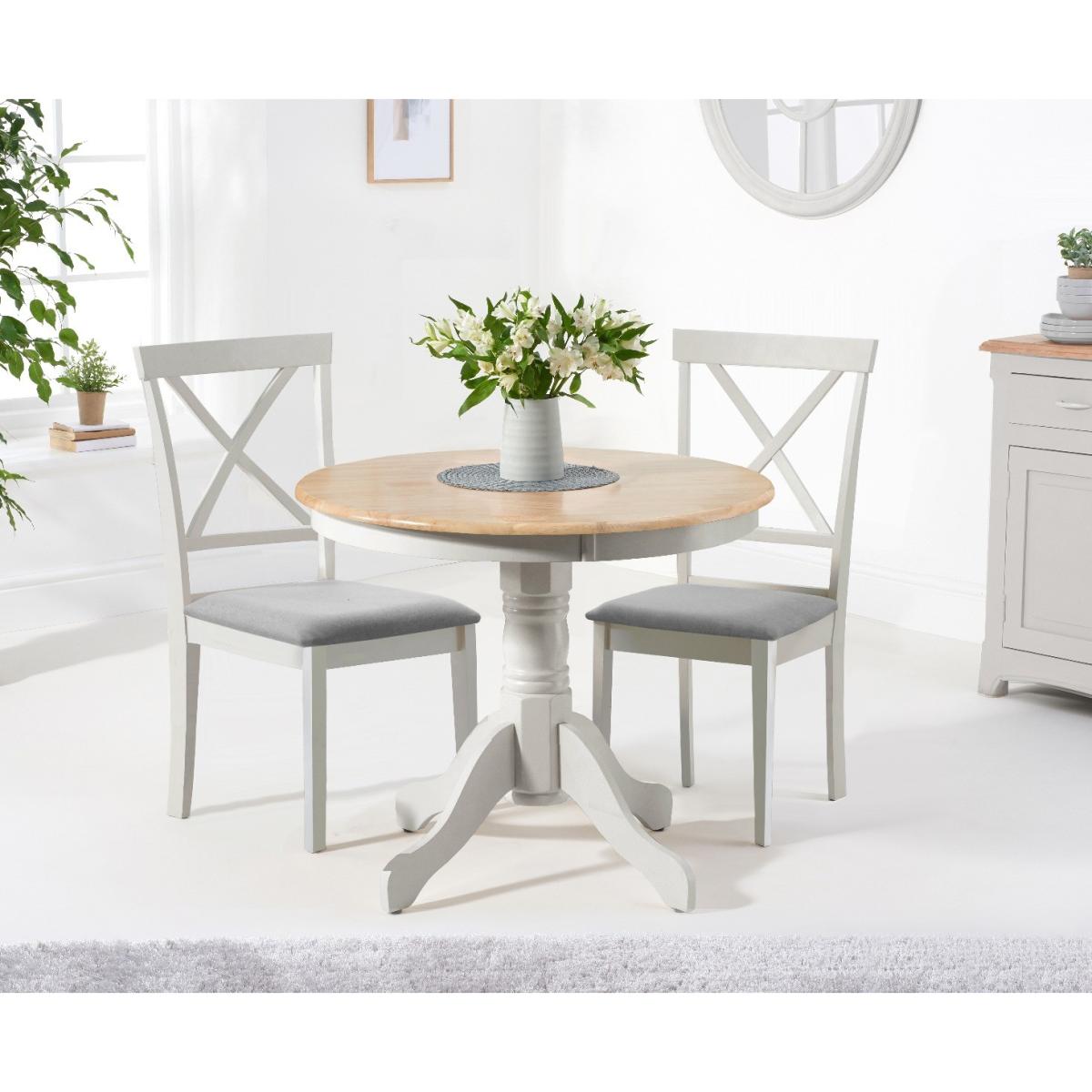 Perfect for small spaces, the Epsom 90cm Oak and Grey Dining Table with Chairs with Fabric Seats is a small, stylish set. The round Epsom table features a smooth lacquered table top contrasting with a grey pedestal base for a chic two toned look. Matching chairs complement the table with a cross back design and comfortable fabric seats. Small and stylish dining set Pedestal table is chic and space saving Designed to seat 4 Solid wood with grey painted pedestal Lacquered table top for that two-toned look Matching hardwood chairs Cross back design and comfortable padded fabric seats