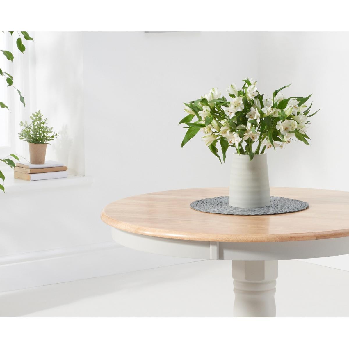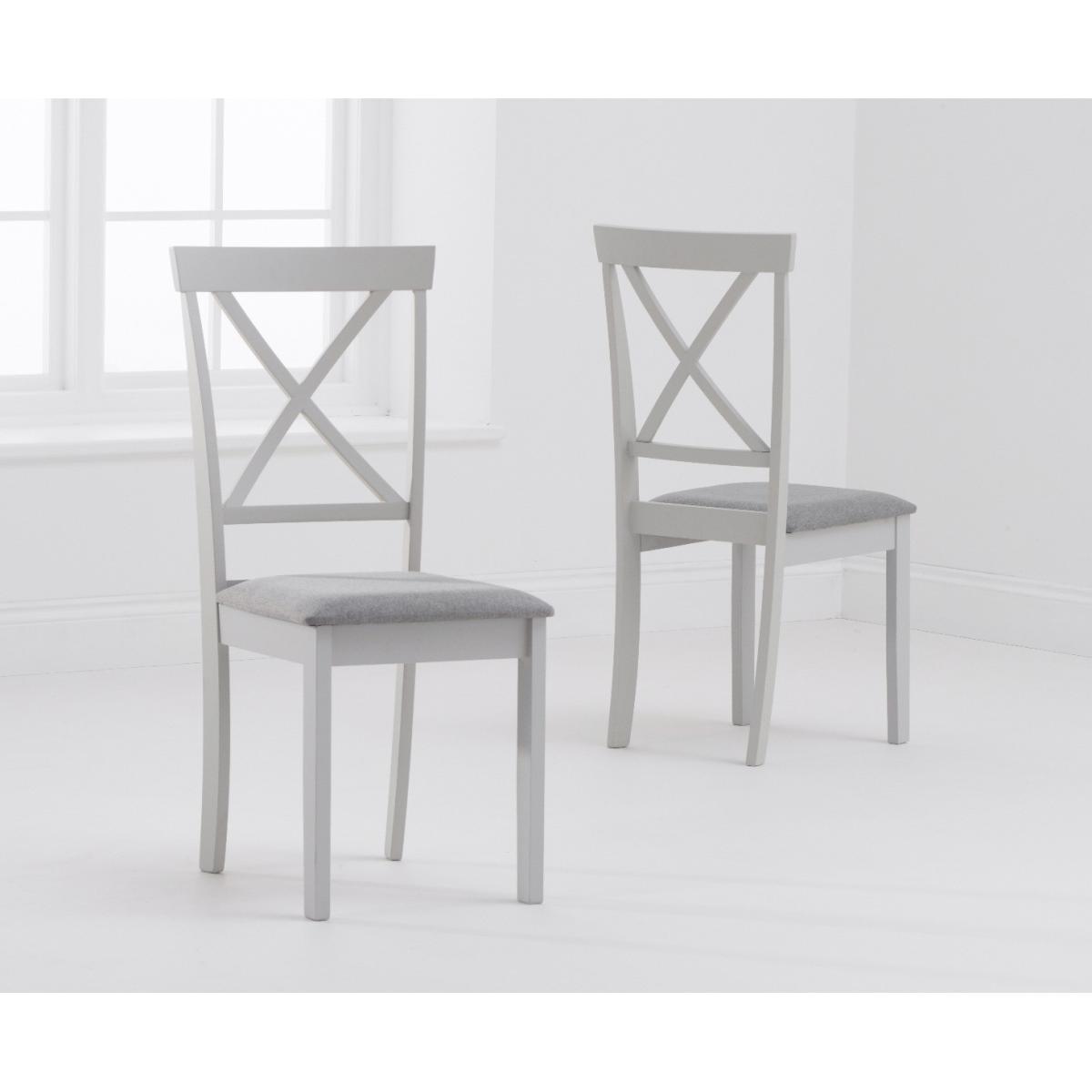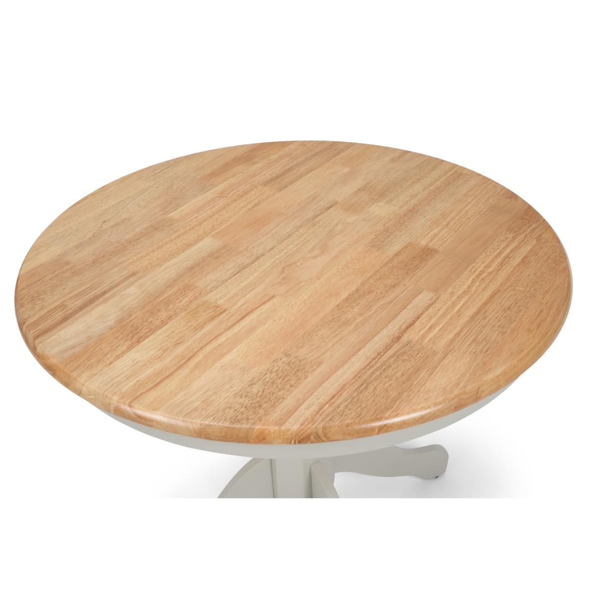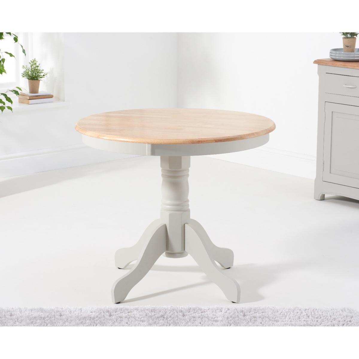 Perfect for small spaces, the Epsom 90cm Oak and Grey Dining Table with Chairs with Fabric Seats is a small, stylish set. The round Epsom table features a smooth lacquered table top contrasting with a grey pedestal base for a chic two toned look. Matching chairs complement the table with a cross back design and comfortable fabric seats. Small and stylish dining set Pedestal table is chic and space saving Designed to seat 4 Solid wood with grey painted pedestal Lacquered table top for that two-toned look Matching hardwood chairs Cross back design and comfortable padded fabric seats