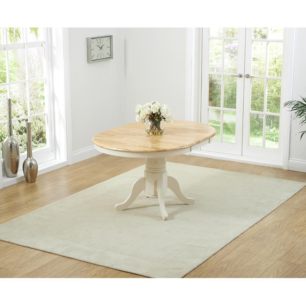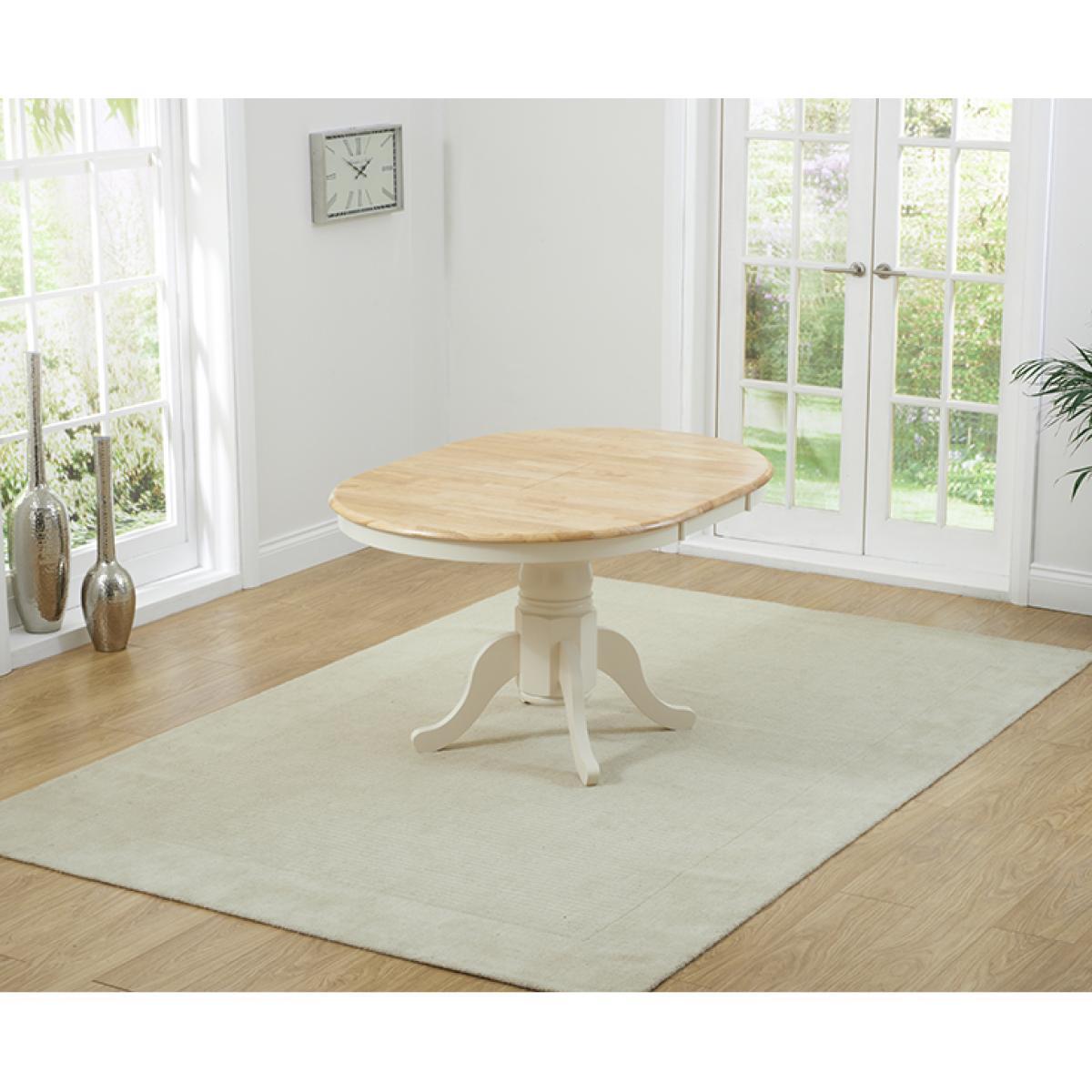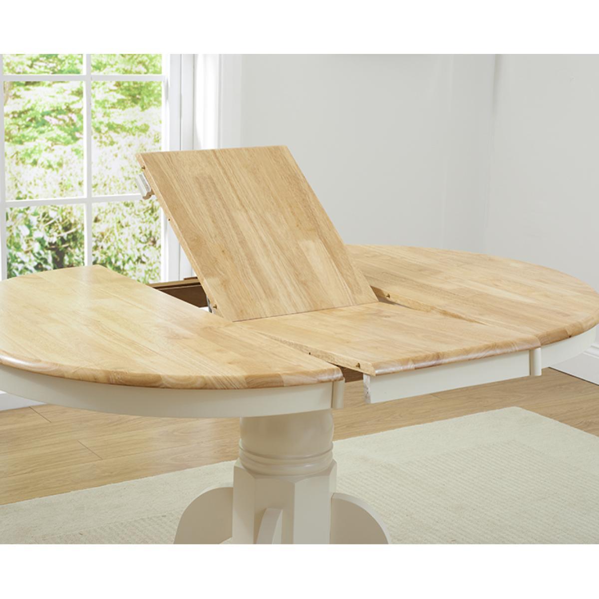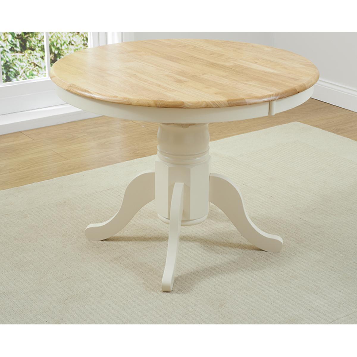 An exceptionally stylish and practical centrepiece for your dining room, the Epsom Cream Pedestal Extending Dining Table is as versatile as it is visually appealing. Seating 4 diners as it is, the pedestal dining table extends to accommodate 6. Crafted using resilient solid hardwood, the extending dining table features a strong, smooth natural wood table top with a clear lacquer finish. The table top is supported by a thick, robust central pedestal leg finished in rich cream paintwork that contrasts with the table top for a beautiful look. For occasions that require additional space at the table, the Epsom extends to 131cm via a butterfly extension mechanism that folds out from the centre of the table. The Epsom Cream Pedestal Extending Dining Table is complemented by Epsom Cream Chairs. Crafted from solid hardwood, the chairs feature a cross design on the backrest and are finished in cream paintwork. The Epsom Chairs are complete with a bevelled seat.