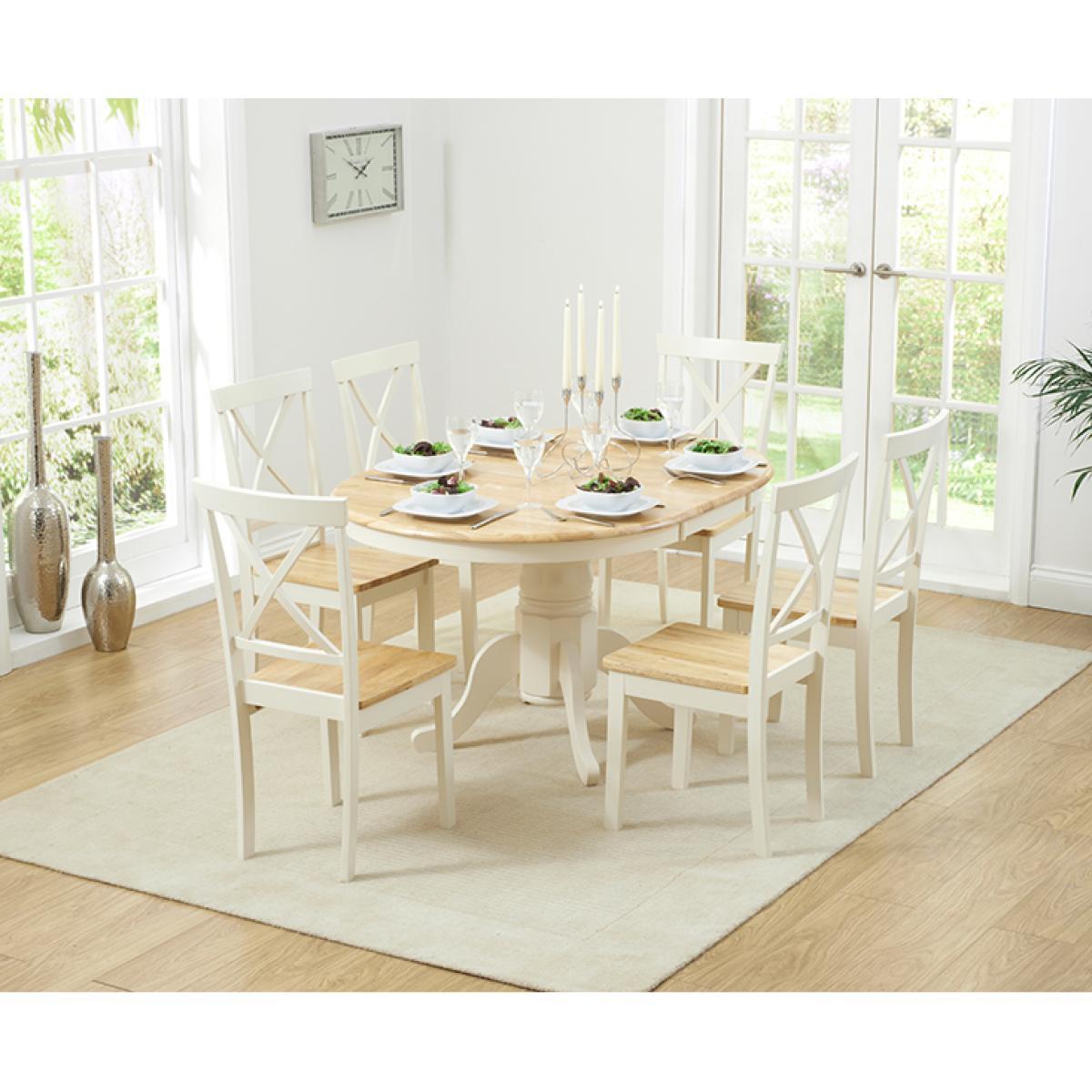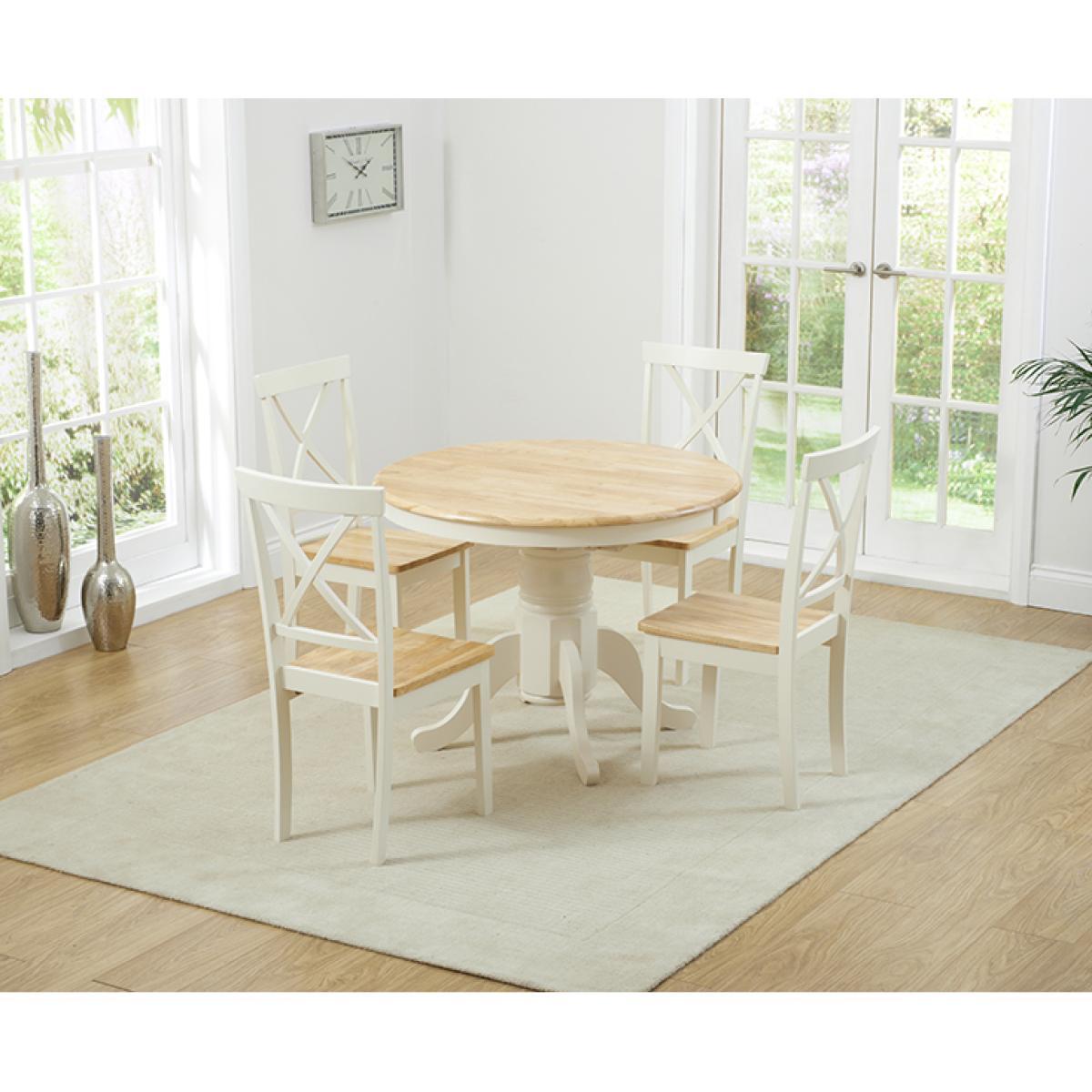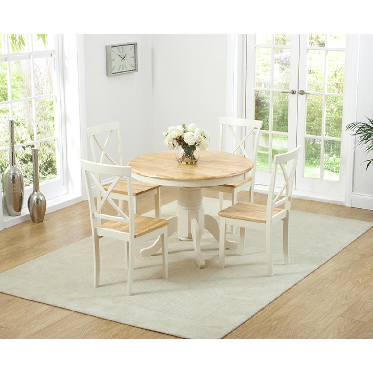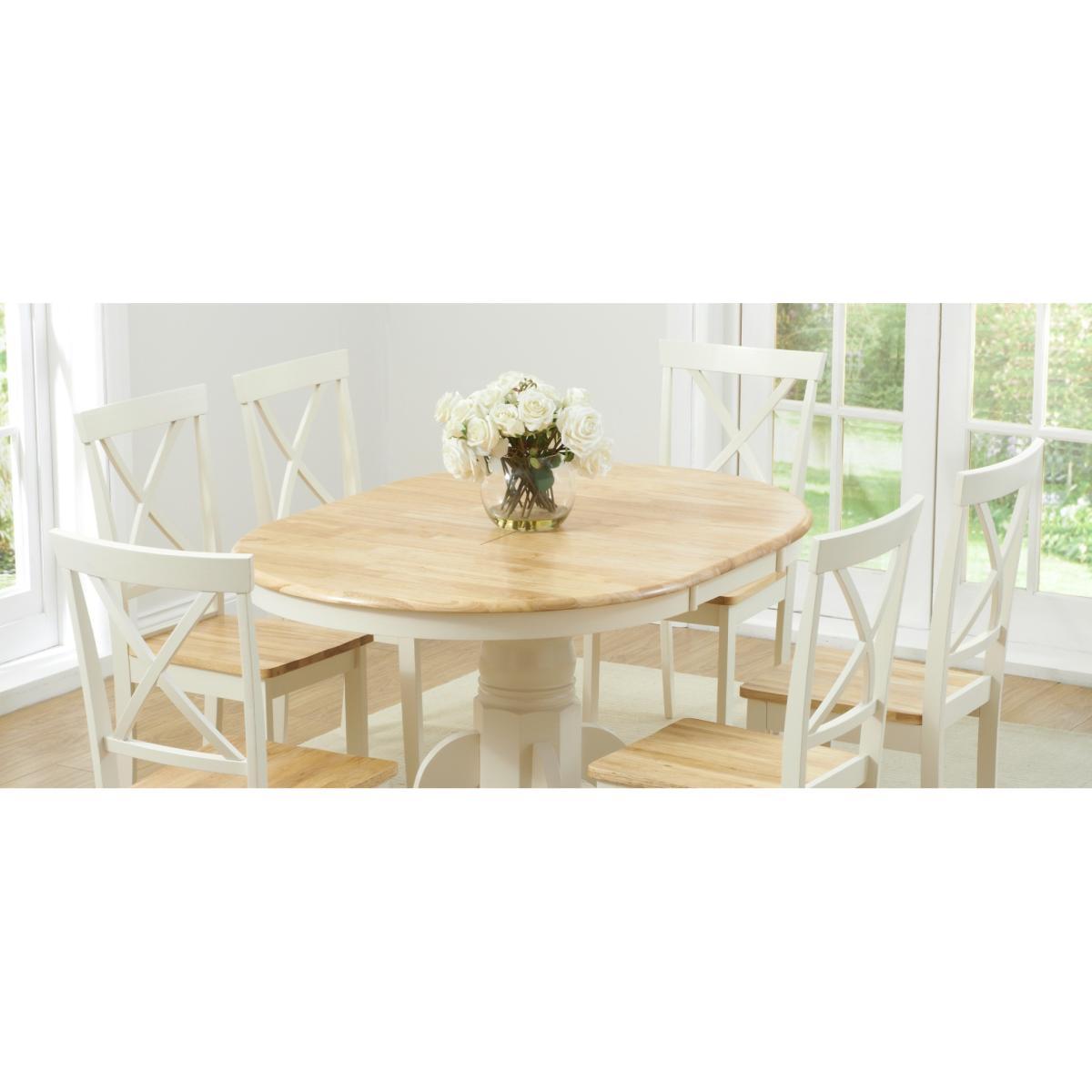 An exceptionally stylish and practical centrepiece for your dining room, the Epsom Cream Pedestal Extending Dining Table is as versatile as it is visually appealing. Seating 4 diners as it is, the pedestal dining table extends to accommodate 6. Crafted using resilient solid hardwood, the extending dining table features a strong, smooth natural wood table top with a clear lacquer finish. The table top is supported by a thick, robust central pedestal leg finished in rich cream paintwork that contrasts with the table top for a beautiful look. For occasions that require additional space at the table, the Epsom extends to 131cm via a butterfly extension mechanism that folds out from the centre of the table. The Epsom Cream Pedestal Extending Dining Table is complemented by Epsom Cream Chairs. Crafted from solid hardwood, the chairs feature a cross design on the backrest and are finished in cream paintwork. The Epsom Chairs are complete with a bevelled seat.