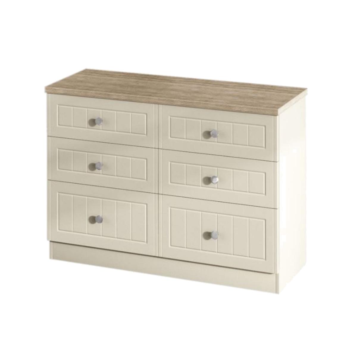 Designed with todays lifestyle in mind the stunning Epworth 6 Drawer Midi Chest has combined elements of the timeless shaker style design with clean lines and neutral colours creating a truly beautiful chest. With a variety of pieces in the Epworth range you will be able to select a variety of pieces that best suit you and your home. Choose from 2 beautiful finishes (Cream Ash with Bordeaux Oak Top & Kaschmir Ash with Bordeaux Oak Top) all complimented with quality brushed steel bar handles. All Pieces will arrive ready assembled. 12 Month Guarantee. Dimensions: 79.5cm x 112cm x 41.5cm