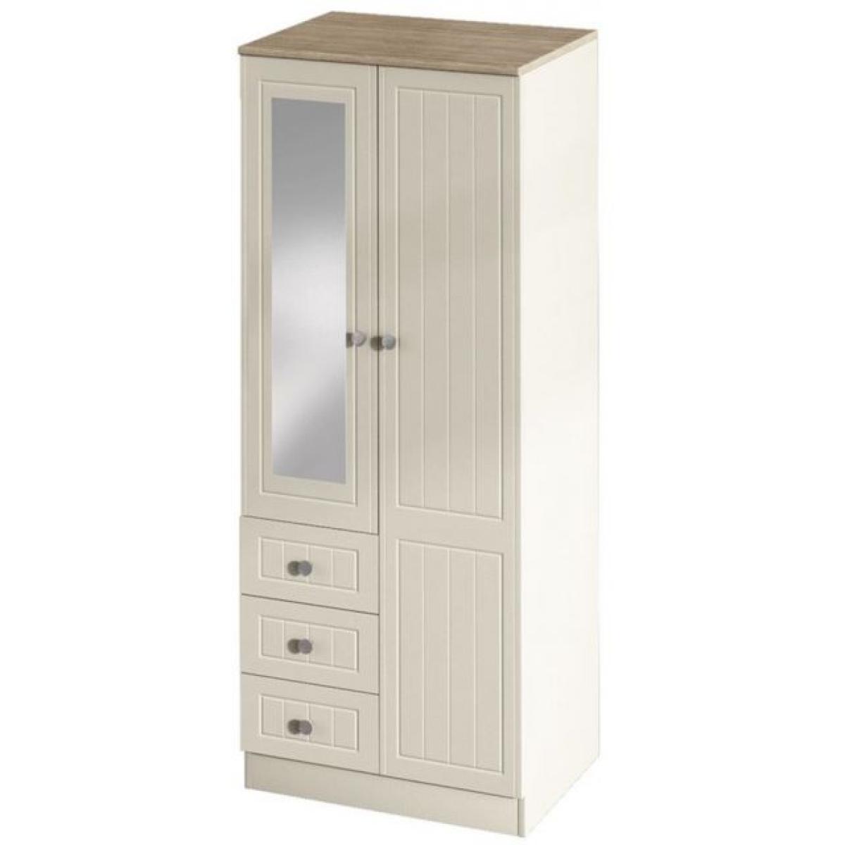 Designed with todays lifestyle in mind the stunning Epworth Combi Robe has combined elements of the timeless shaker style design with clean lines and neutral colours creating a truly beautiful robe. With a variety of pieces in the Epworth range you will be able to select a variety of pieces that best suit you and your home. Choose from 2 beautiful finishes (Cream Ash with Bordeaux Oak Top & Kaschmir Ash with Bordeaux Oak Top) all complimented with quality brushed steel bar handles. All Pieces will arrive ready assembled. 12 Month Guarantee. Dimensions: 182.5cm x 74cm x 53cm The 2ft 6 Combination Wardrobe features a high hanging rail, 3 spacious drawers and mirrored door