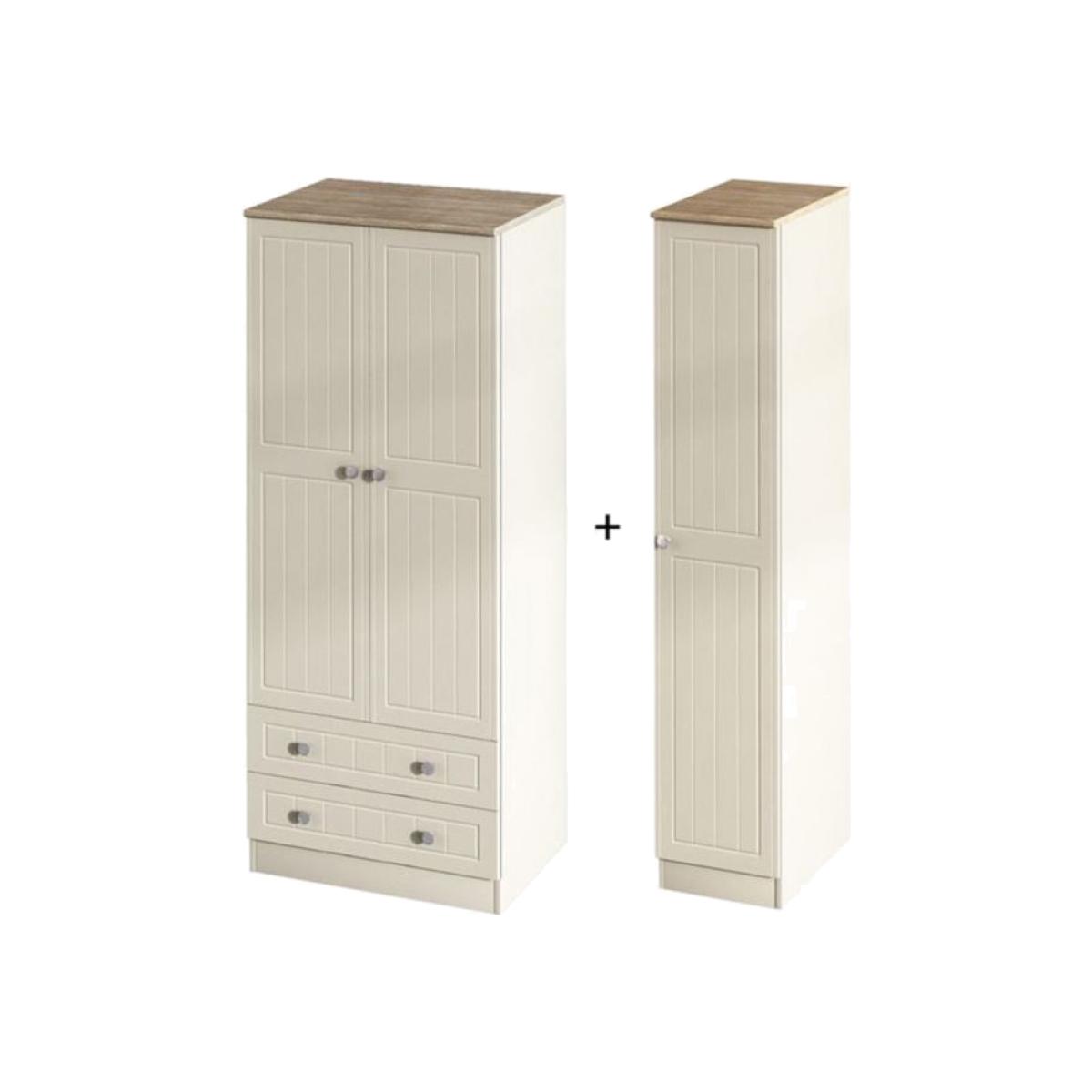 I’m a big fan of the triple robe for its classic bead-board doors and muted cream finish, which slot straight into coastal, Scandi or modern farmhouse schemes. The compact two-drawer base keeps jumpers and t-shirts tidy, while the slim side cupboard is ideal for shoes or scarves. To style it, add woven baskets on top for out-of-season bits and swap the knobs for brass or aged iron to pick up on your room’s accents. Position it beside a bed or desk in a neutral corner, then soften the look with a cream wool rug and a couple of framed prints above.