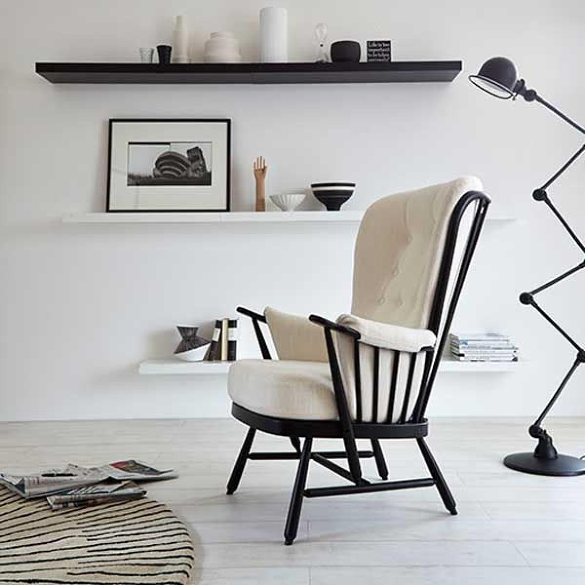 Take a seat on the Ercol Evergreen easy chair, with its high steam bent back and arms. Echoing centuries of tradition combined with the latest levels of upholstered comfort, this Ercol easy chair is a timeless piece, perfect for use throughout your home whether its in the lounge, conservatory or even bedroom. Dimensions: W77cm x D89cm x H108cm - Seat height 48cm. Choose between a variety of different finishes and fabrics. This Ercol easy chair is made from Ash Simple self assembly