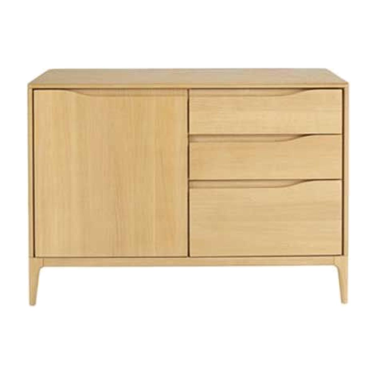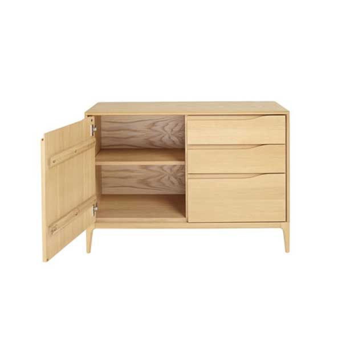 The 2 Door Ercol Romana Sideboard has a good amount of space to store all of your essentials behind 1 cupboard door and 3 drawers. The unit has a classic Ercol style as represented with its carved out door handles and soft close mechanisms to give a gentle shut. Each cupboard section has a wooden shelf mounted on pins which can be adjusted in height accordingly. It is finished in a clear matt lacquer that protects the timber at the same time as showing off the natural beauty of the oak. Dimensions: W108cm x D45cm x H75cm. Made from oak with a clear matt lacquer finish. Simple self assembly