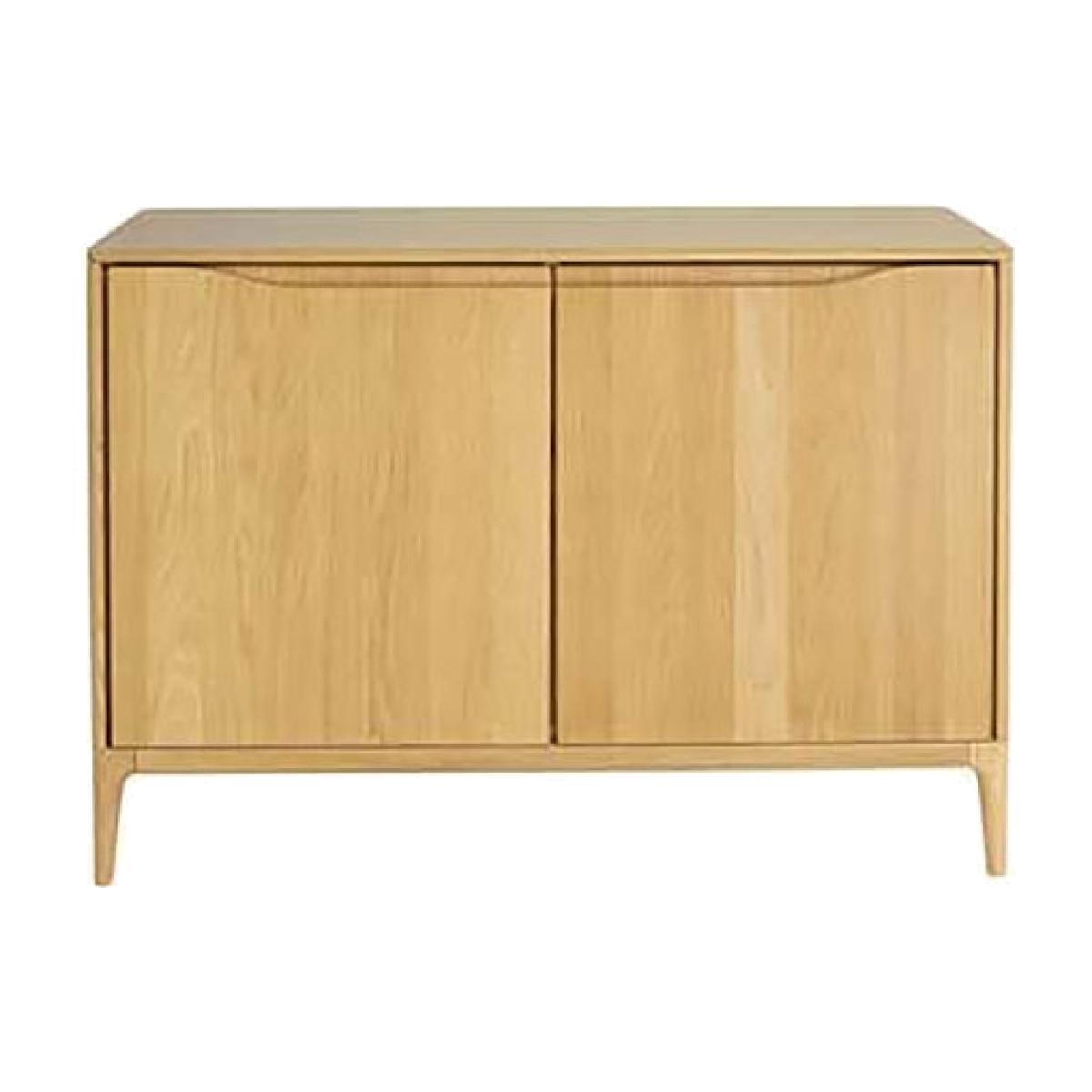 The Ercol Romana 2 Door Sideboard has a good amount of space to store all of your essentials behind 2 cupboard doors. The unit has a classic Ercol style as represented with its carved out door handles and soft close mechanisms to give a gentle shut. Each cupboard section has a wooden shelf mounted on pins which can be adjusted in height accordingly. It is finished in a clear matt lacquer that protects the timber at the same time as showing off the natural beauty of the oak.