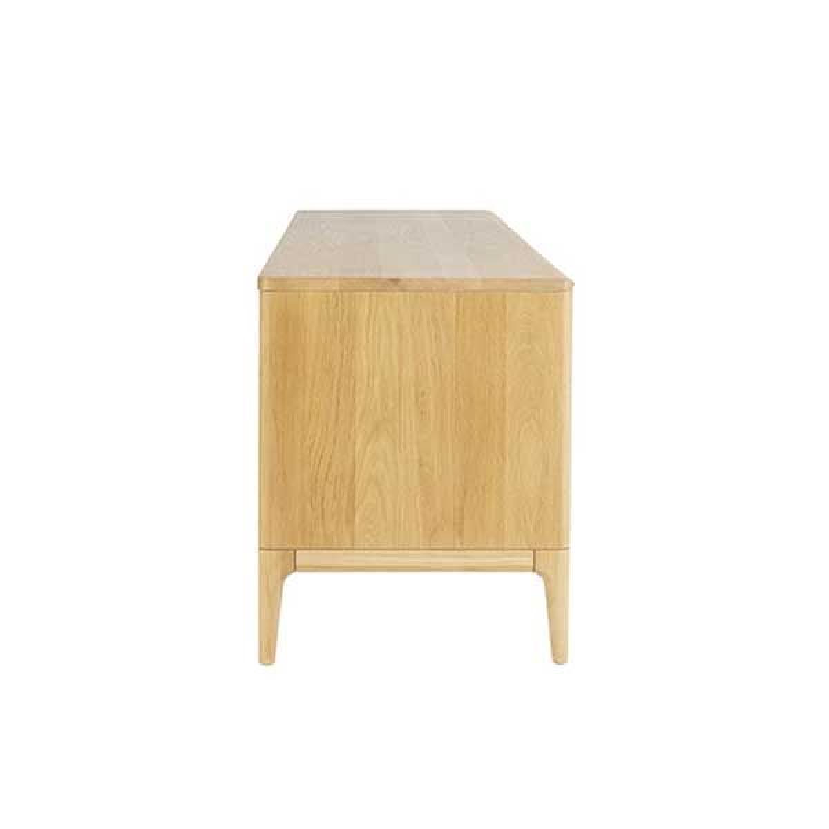 This. Ercol TV Unit. Has a good amount of space to store away your home entertainment systems behind 1 cupboard door with a glass shelf and 2 drawers. On the front of the unit you will find an IR eye enabling you to continue using your remote control with the oak door shut. The unit has a classic Ercol style as represented with its carved out door handles and soft close mechanisms to give a gentle close. A cutout in the back of the unit allows you to thread your wires through keeping your home looking clean and tidy. It is finished in a clear matt lacquer that protects the timber at the same time as showing off the natural beauty of the oak.
