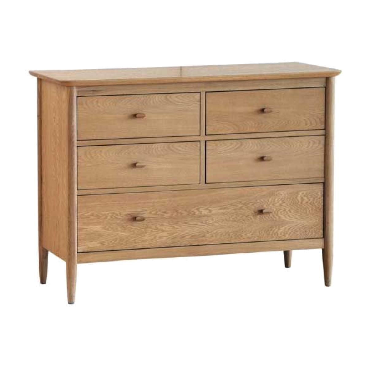 A timeless classic, your Ercol 5 Drawer Wide Chest from the Teramo range, alludes contemporary charm and elegance. With shaker style influence ? simple sleek lines. Made from pale oak, your chest has 4 draws of the same size, and 1 larger bottom drawer. Finished in a clear matt lacquer, to help protect your contemporary oak piece. Glam up in style, with this uber chic addition to your Teramo bedroom furniture collection.