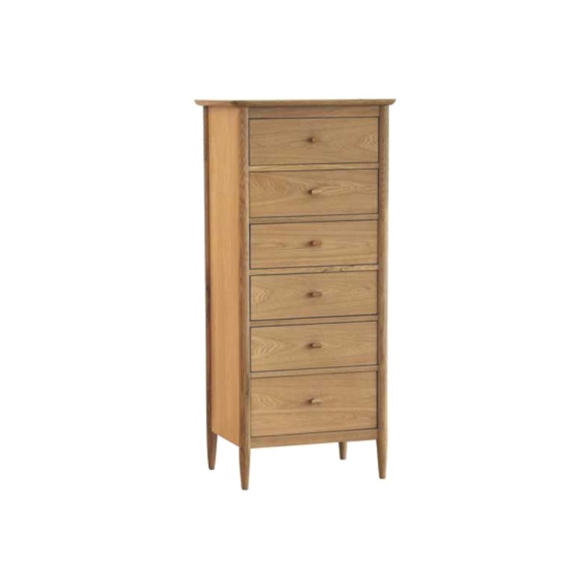 Classically Ercol, this 6 drawer Ercol Teramo chest, utters contemporary chic. This tall chest, features 6 drawers all of the same size, a perfect storage solution for housing your neatly folded clothing items. Shaker simplicity, this. Ercol chest of drawers. Embodies the epitome of shaker style, with its simple sleek lines and uncomplicated oval handles. This lovely light oak and oak veneer piece, is finished in a clear matt lacquer, helping to protect your oak.