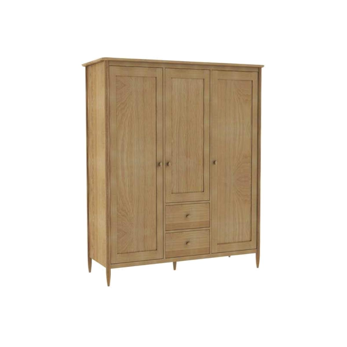Classically Ercol, your 3 Door Ercol Teramo wardrobe, is functional yet utters uber chic. Shaker simplicity, your Ercol wardrobe embodies the epitome of shaker style, with its simple sleek lines and uncomplicated oval handles. Functional and timeless, hang your clothes in contemporary style. This stunning piece boasts 3 separate wooden hanging rail compartments, 2 adjustable shelves and 2 drawers. A fabulous and stylish way to organise your bedroom This lovely light oak and oak veneer piece, is finished in a clear matt lacquer, helping to protect your oak which also allows the lovely grain of the oak to shine through. Dimensions: W163cm x D61cm x H195cm. Solid oak and oak vaneers in construction with a clear matt finish. Simple self assembly