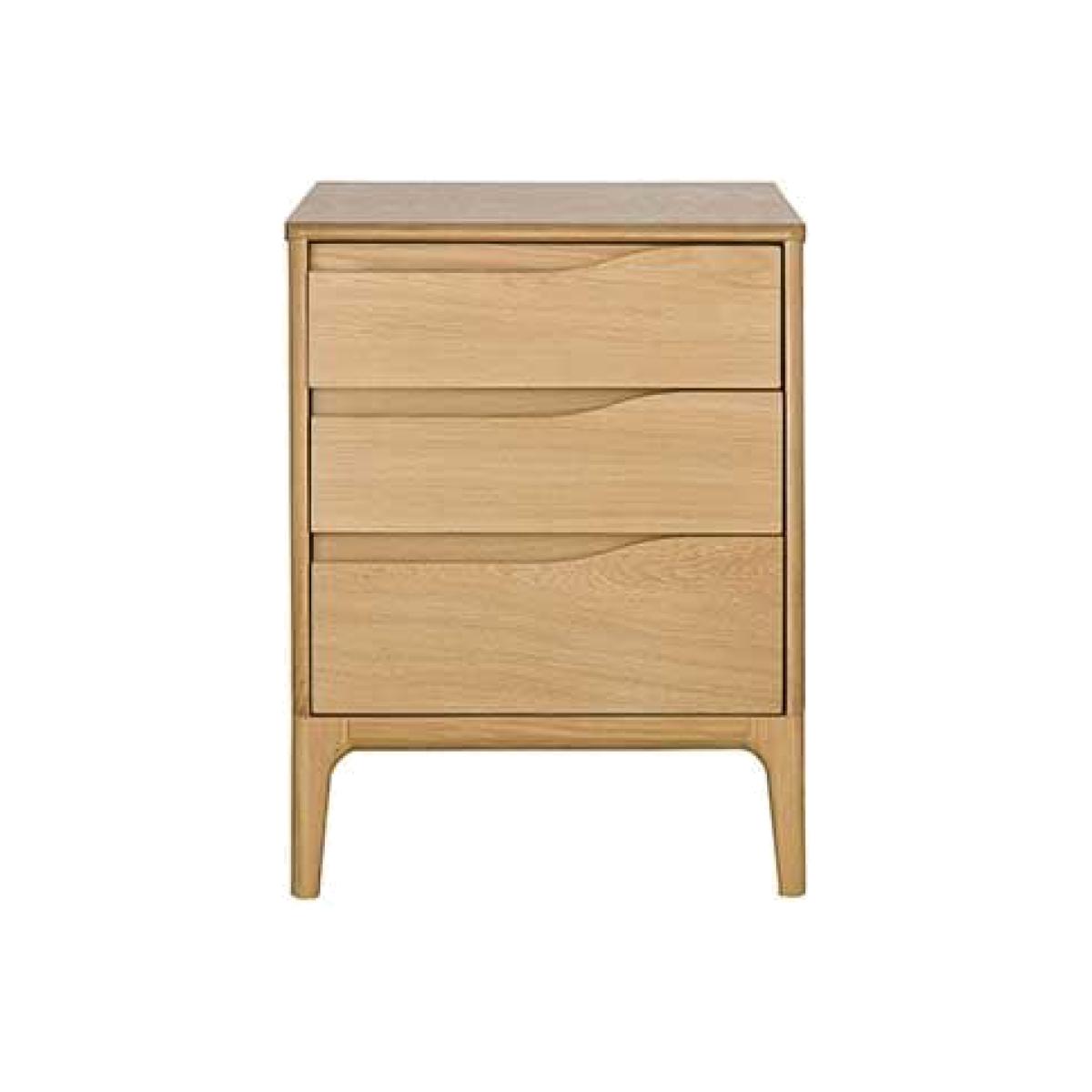 Crafted from a light oak, the 3 drawer Ercol Rimini bedside cabinet has an elegant yet contemporary style to it. This Ercol bedside table features the collections signature sculpted drawer handles as they display the natural grain of the wood. Dimensions: W47cm x D46cm x H61cm. Made from light oak with a clear matt finish. Simple self assembly