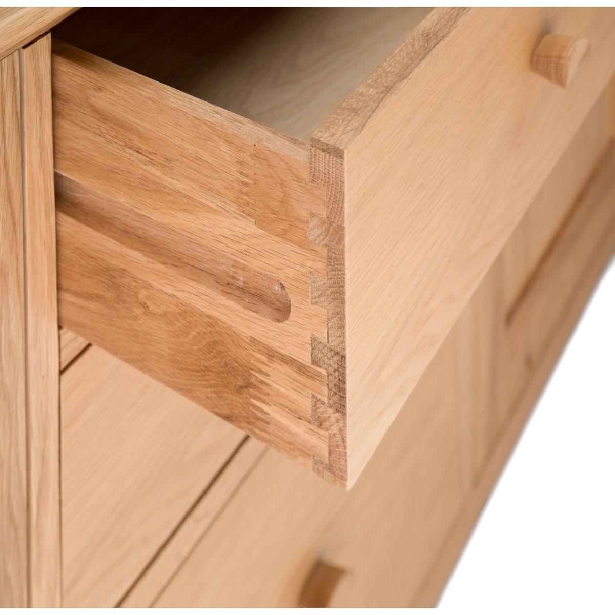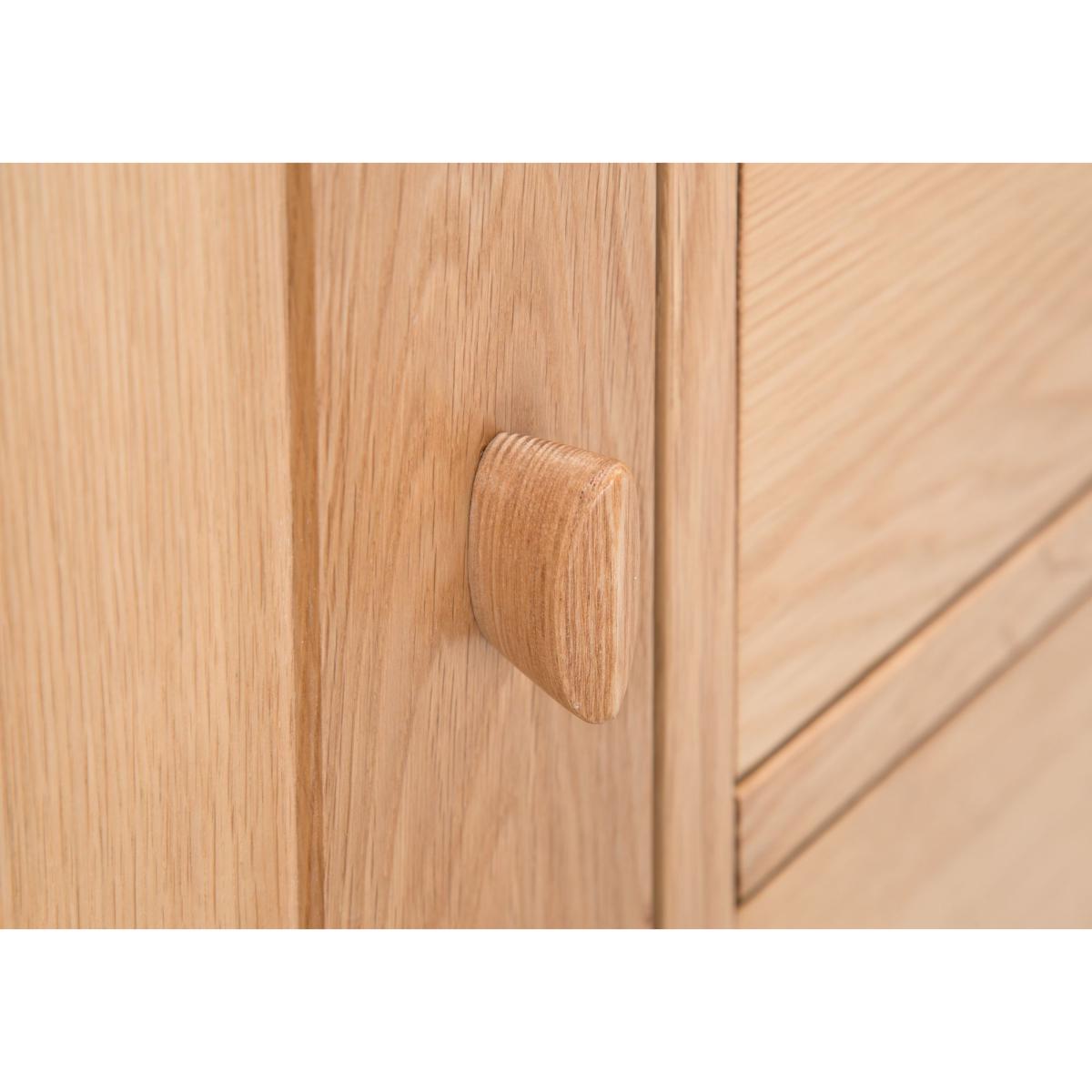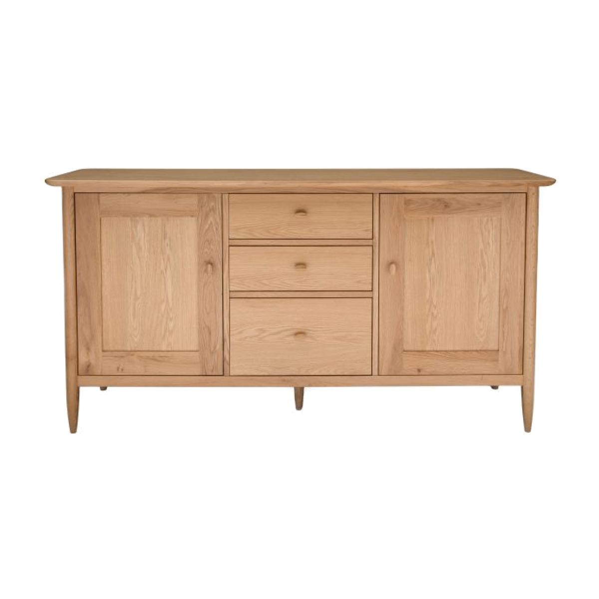 Inspired by the understated simplicity of Shaker style, this large Ercol Teramo sideboard in pale oak is a fine example of Ercol's contemporary take on traditional design. It is made of hand-matched wood with dovetail jointed drawers and elegant detailing in the oval handles and gently tapered legs. Finished in a clear matt lacquer for durable protection and to highlight the natural wood grain. This. Ercol sideboard. Consists a cupboard on either side, each containing a single deep adjustable shelf. It has three drawers in the middle and the bottom drawer is deeper.