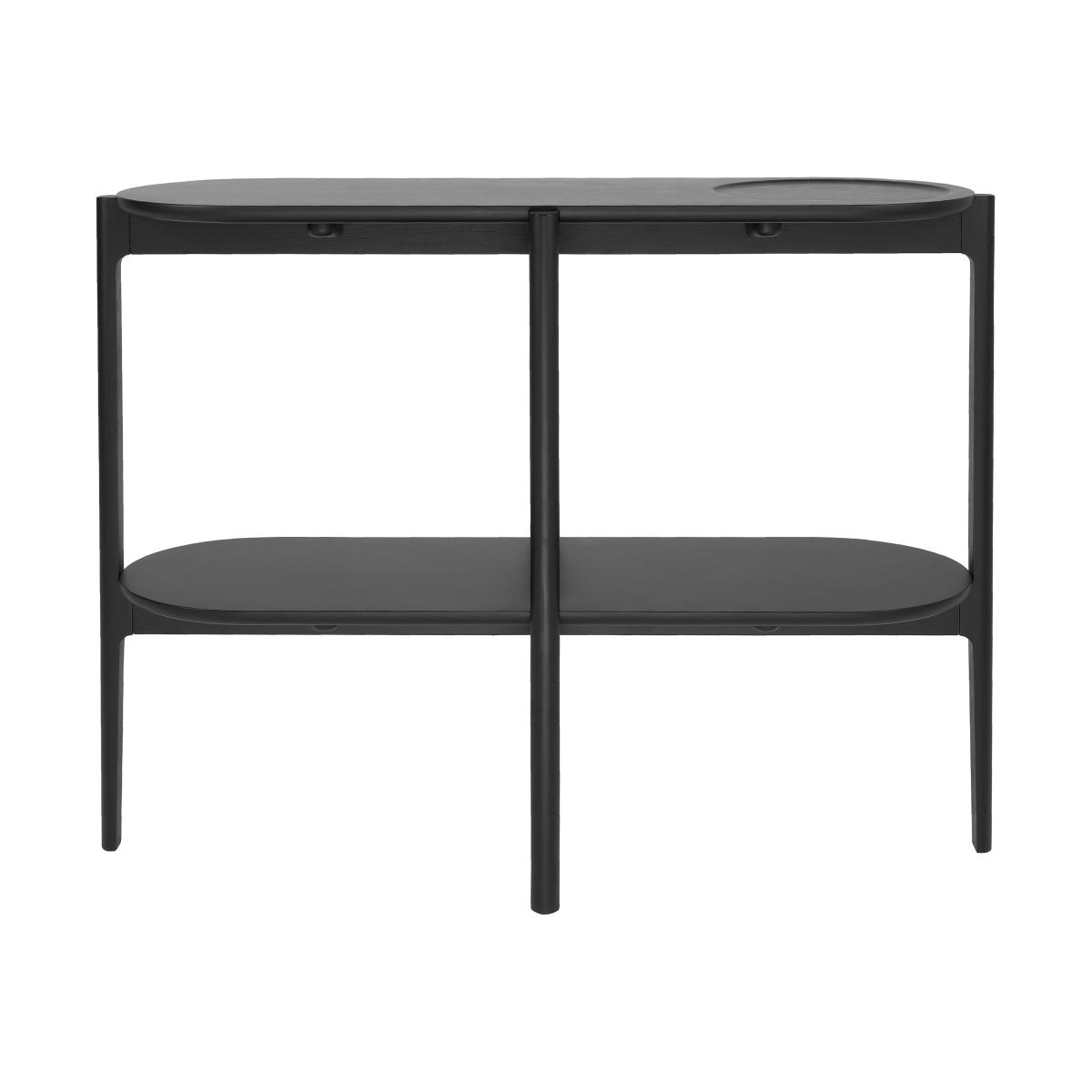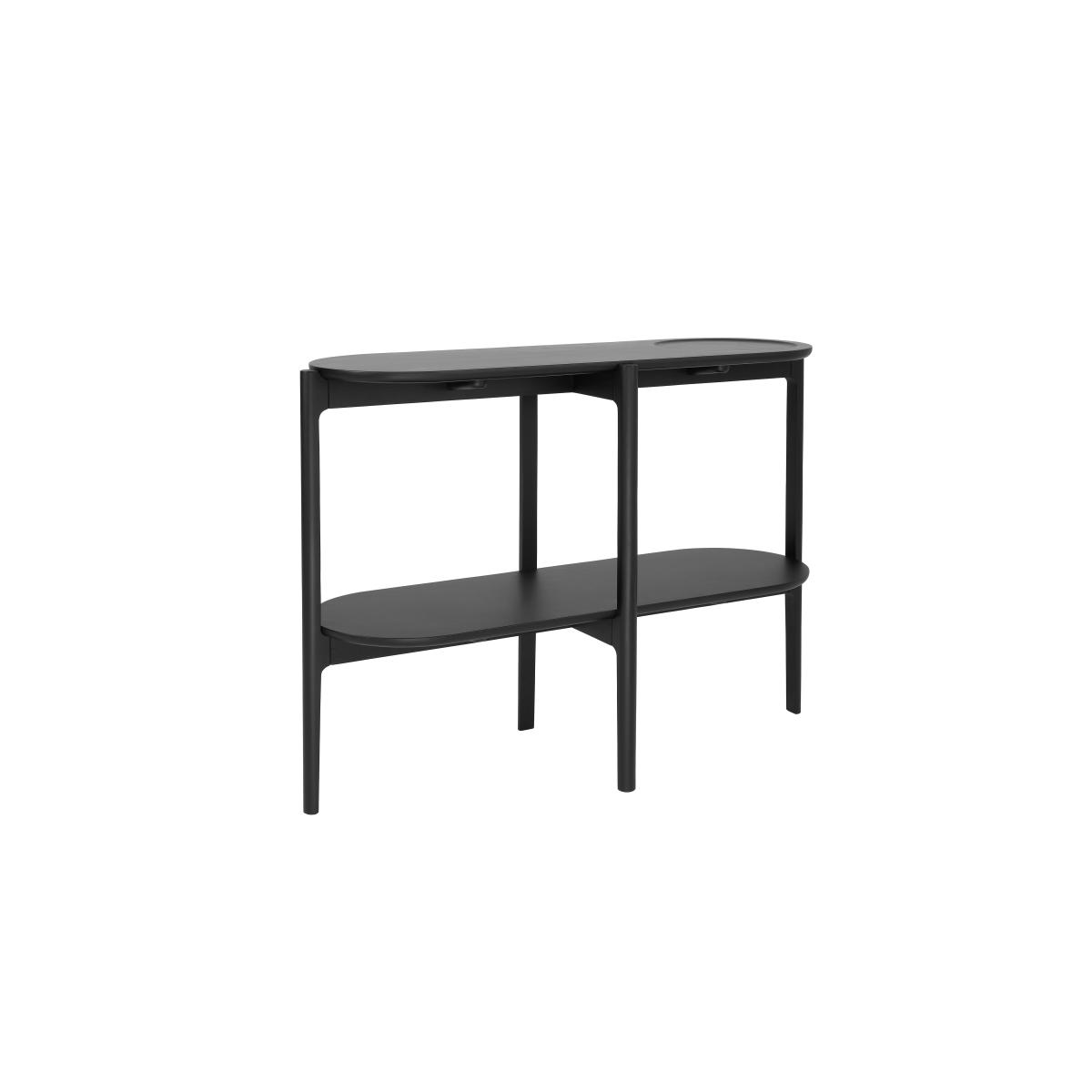 Ercol’s signature curves are very much in evidence in the Ercol Ancona range. Practical and stylish, this collection of tables and stylish storage pieces fully embraces Ercol’s ethos – design for comfort, function and beauty. And, as with all Ercol furniture, the range celebrates the natural beauty of wood. Individual pieces are available in pale oak or with a contemporary dark or black stain. Smaller living or dining space? The collection’s breakfast table and side tables have been specially designed for compact rooms. This statement open-plan console table is as practical as it is stylish. Made of solid oak and oak veneer and finished in an on-trend black wood stain, it has one shelf with curved ends and a rounded-profile frame. Why you'll love it. Ercol’s signature curves take centre stage in this stylish collection. Cool mid-century modern style. Rounded carved groove shape at one end of the table top. Statement console table has curved shelves and a rounded-edge 4-leg frame. Finished in a black wood stain. Part of the Ercol Ancona collection at Furniture Village. What you need to know. Made of solid oak and oak veneer. 1 shelf for storage. As oak is a natural material, you can expect to see knots, markings and colour variations. Warning!. Furniture can tip over unexpectedly and cause injury. This item should be fixed to a wall using the anti-tip kit provided with the furniture. Be sure to use the correct wall fixings suitable for the walls in your home.