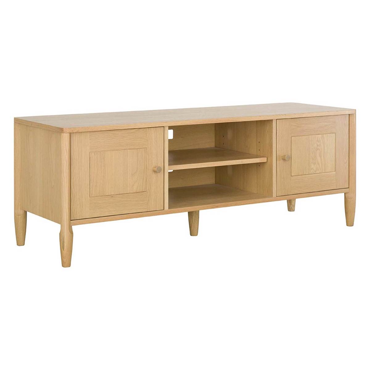 I like this unit because it offers a clean, timeless look that works well in both contemporary and Scandi-inspired interiors. Its natural wood finish adds warmth and texture, making it versatile for various colour schemes. Practical styling tips include considering open shelving for media gadgets or decorative accents, while the closed storage space can hide clutter for a sleek appearance. It's suitable for larger living rooms where a statement media piece is desired, and pairing it with minimalist accessories or a cosy rug can help balance its substantial size. Overall, this piece combines functionality with understated style, making it a reliable choice for a versatile living space.
