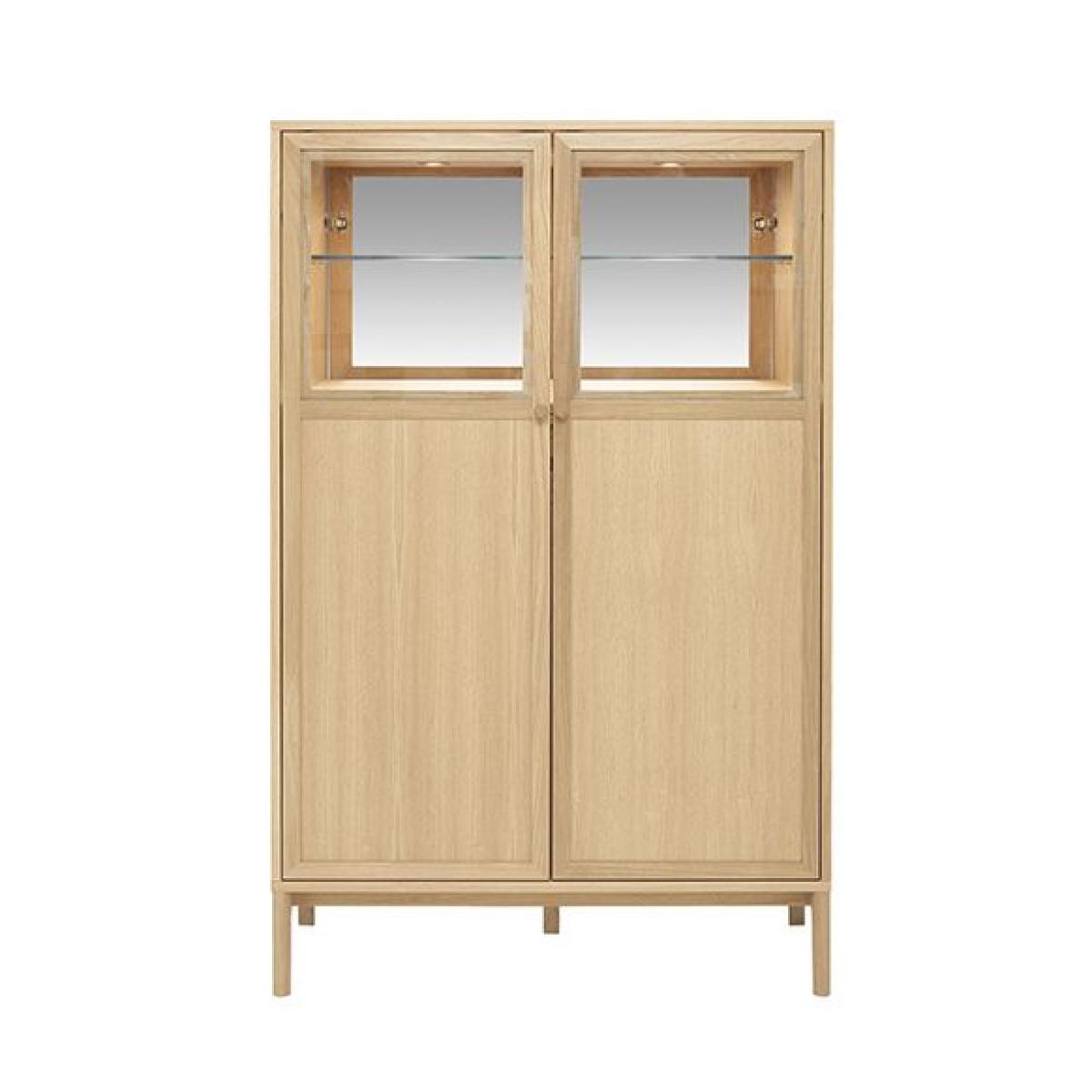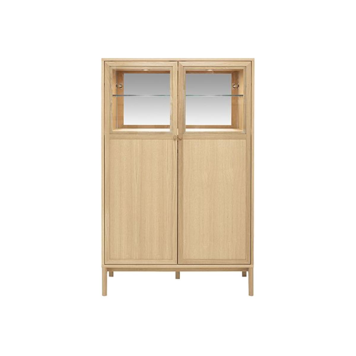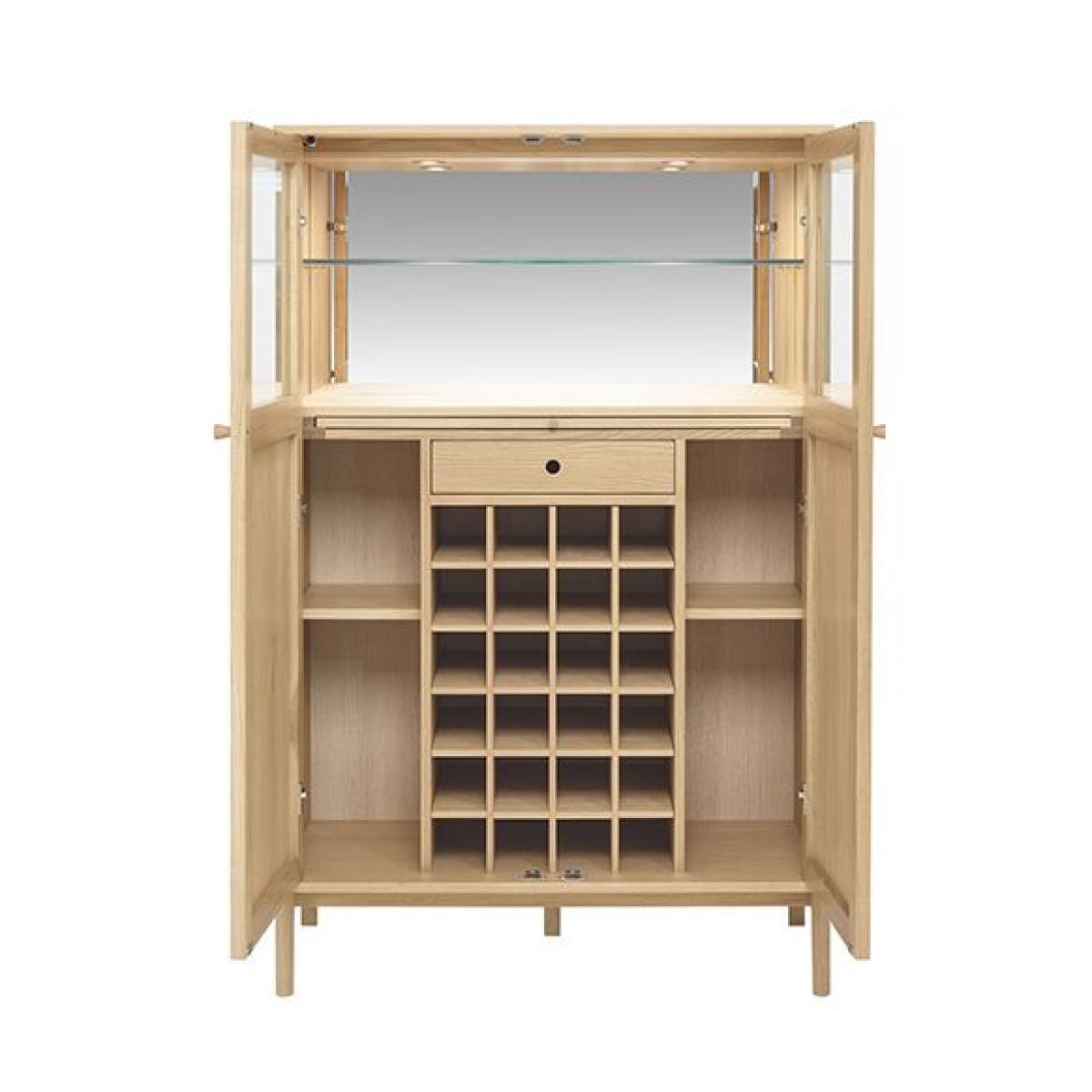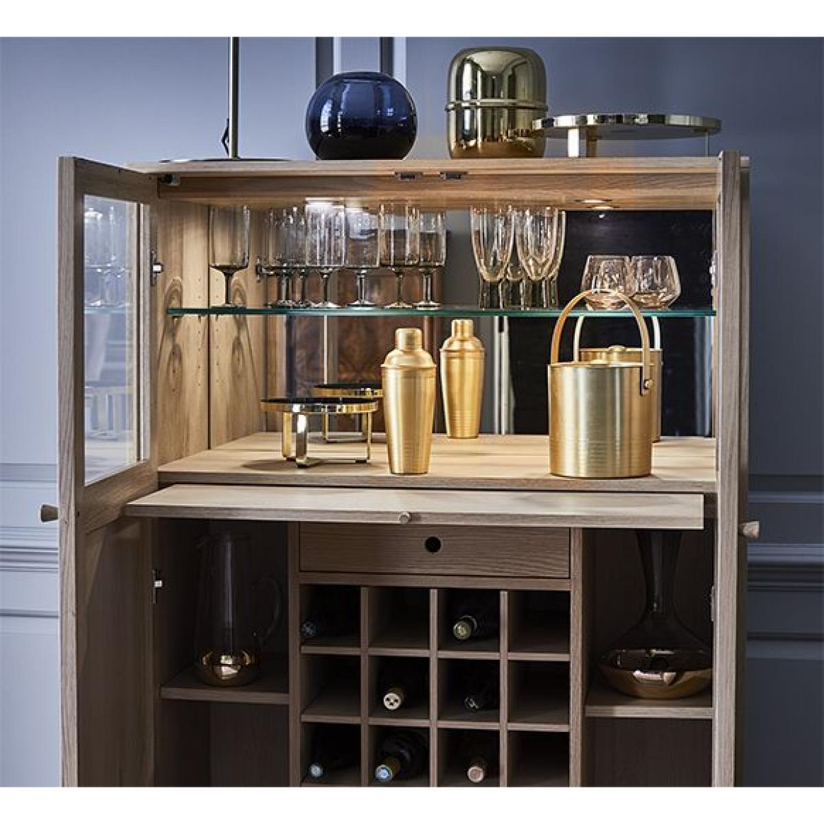 A stylish, impressive and charming piece that will turn heads and provide the perfect drinks cabinet for entertaining. The top section has a mirror at the back of the cupboard which uses the lights above to its advantage and along with an adjustable glass shelf will display any drinking glasses perfectly. Below this is a pull-out wooden shelf to use as a bar (depth of 27cm) to make any drinks for your guests and below this a shallow drawer for any cocktail making tools. In the main cupboard there is a built-in wine rack with enough space for 24 bottles and on either side adjustable internal shelving for storing and displaying any additional bottles, glassware, and general bar accompaniments. Crafted from solid oak and oak veneers with a clear matt lacquer that keeps the contemporary feel to this striking drinks cabinet. Dimensions W 100cm D 45cm H 157cm. Wood Oak with oak veneers. Country of origin Turkey. Partial assembly required. Wood finishes and colour samples are shown for guidance only as screen colours may vary. However, wood is a natural material and varies in colour, grain and structure.