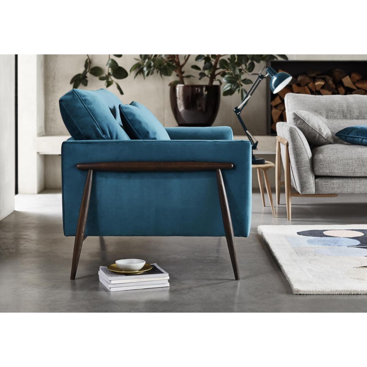 The Bellaria range from Ercol is beautifully designed with slim silhouettes that suit smaller spaces. Each piece – from chaise sofa to versatile footstool – comes in a choice of gorgeous textured and velvet fabrics with a selection of colours exclusive to Furniture Village. The turned and tapered solid oak legs come in a light or dark finish. Sink into the deep-seated luxury of foam with fibre wrap seat cushions and reversible, fibre filled back cushions. Why choose between style and comfort when you can have both?. Sumptuous reversible back cushions keep their shape for longer. Exquisitely turned solid oak legs in a light or dark finish. In exclusive woven textured and plush velvet fabrics. The Ercol Bellaria fabric snuggler chair is invitingly comfortable, and roomy enough for two with deep foam with fibre wrap seat cushions and reversible luxury fibre back cushions. It has an elegant silhouette with slim cushioned arms and tapered and turned solid oak legs in a light or dark finish. Choose from gorgeous textured weaves and velvets for the upholstery, including colours exclusive to Furniture Village. Includes one scatter cushion as standard. Top tip. Some fabrics can show wear on areas of more use or in direct sunlight and foam and fibre interiors will soften with use. To keep your fabric upholstery looking fresh, plump, turn and rotate seat and back cushions regularly if possible. Please read our upholstery care guide for more advice on caring for your fabric sofa.