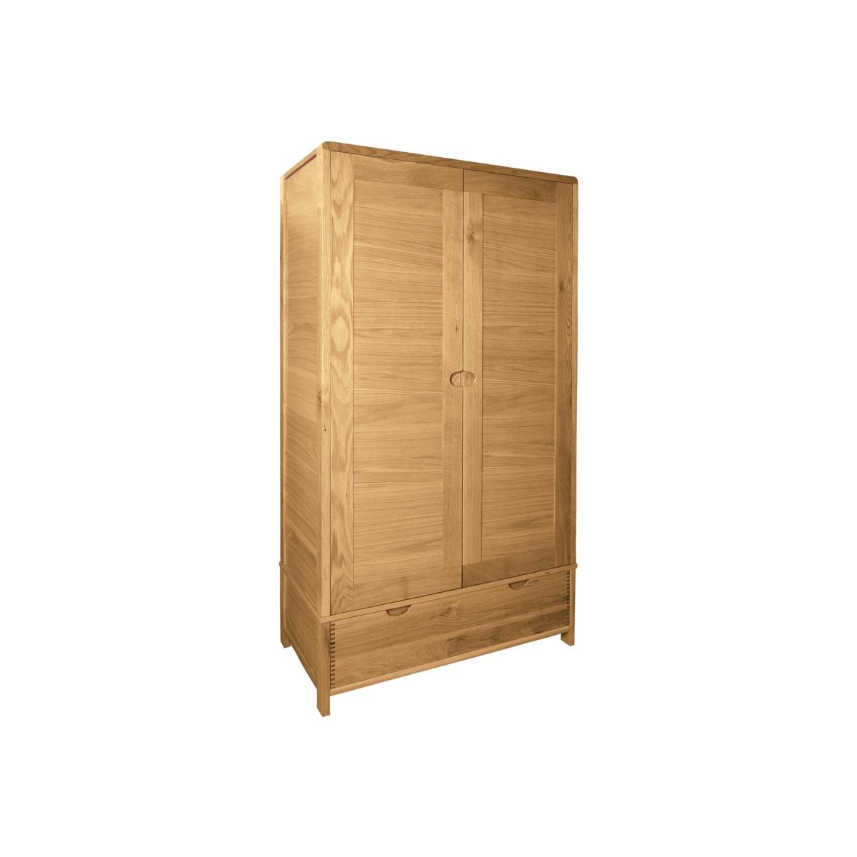 Design. Perfect for a smaller space. The Ercol Bosco 2 Door Wardrobe offers a timber hanging rail and one base drawer so that you can seamlessly store clothing and more, leaving you with a tidy and open space. Solid oak and finger jointed details give this wardrobe a unique look that fits well with a modern or Scandinavian inspired space. Pair with the Ercol Bosco Compact Side Table for a put together look.