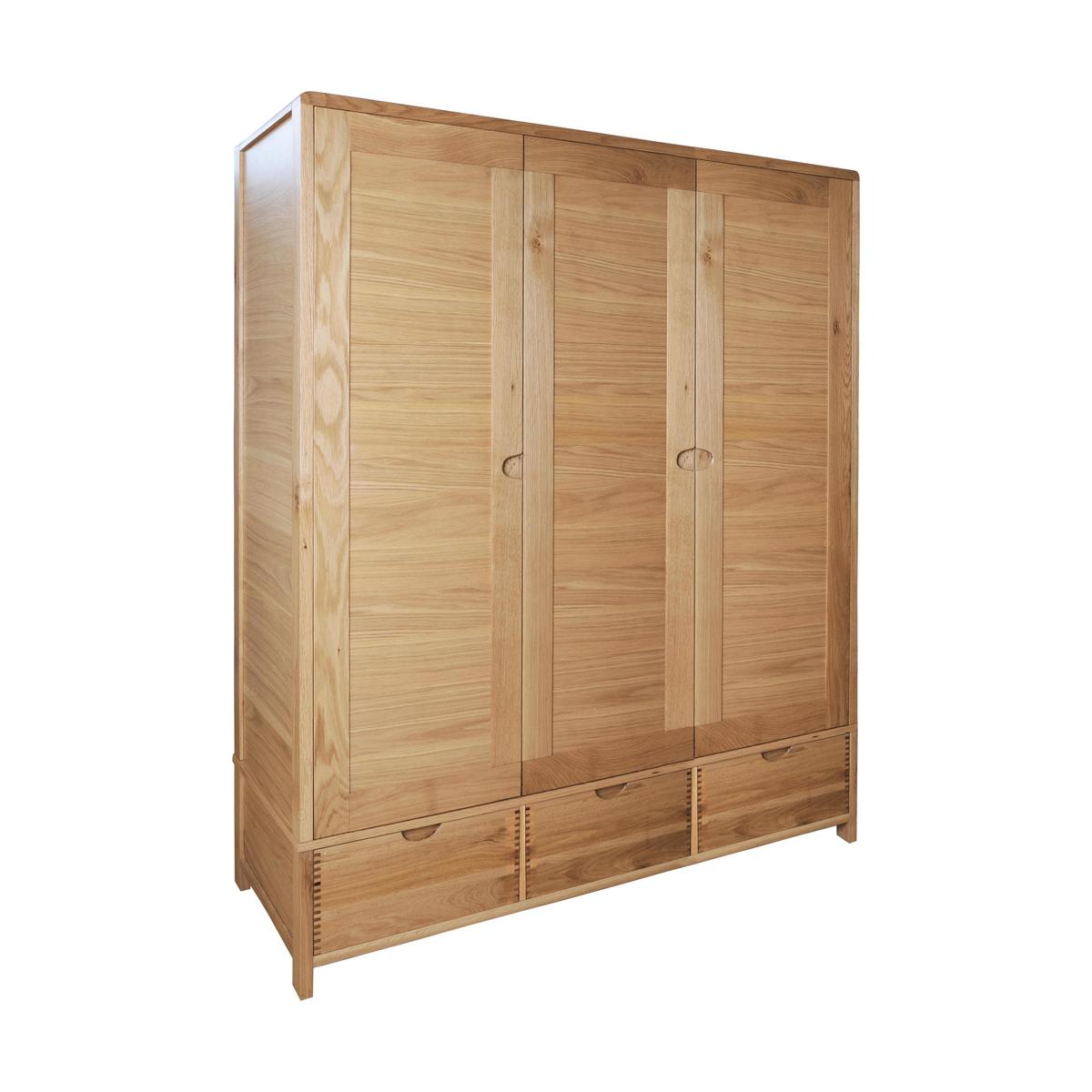 The ercol Bosco triple door wardrobe combines extremely spacious storage with wonderful craftsmanship. Its cleverly configured to offer two different hanging compartments. Behind the single left hand door, youll find a gentlemans wardrobe with hanging space and two shelves. The double door on the right provides a spacious full- length hanging area. Below each door is useful drawer, deep and roomy. This spacious three door wardrobe is crafted from solid oak and oak veneers. Doors have a panelled effect and drawers have exposed finger joints. Both doors and drawers have semi- circular recessed handles. Finished with a matt clear lacquer, this piece showcases ercols famed attention to detail. The ercol Bosco triple door wardrobe is part of the stunning ercol Bosco bedroom range. Complete the look with the ercol Bosco bedside cabinet and, of course, the ercol Bosco bed frame. Did you know? Natural wood has unique markings, with some colour variation. The colour and tone of wood improves with age. WARNING! Furniture can tip over unexpectedly and cause injury. This item must be fixed to a wall using the anti- tip kit provided. Be sure to use the correct wall fixings suitable for the walls in your home. Furniture Village is not able to fix anti- tip devices for you. Seek professional advice if you are unsure.
