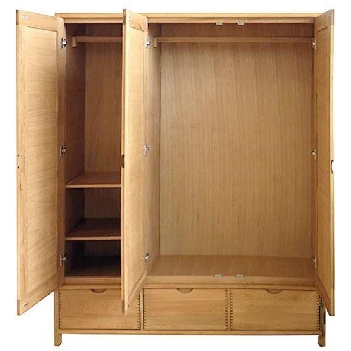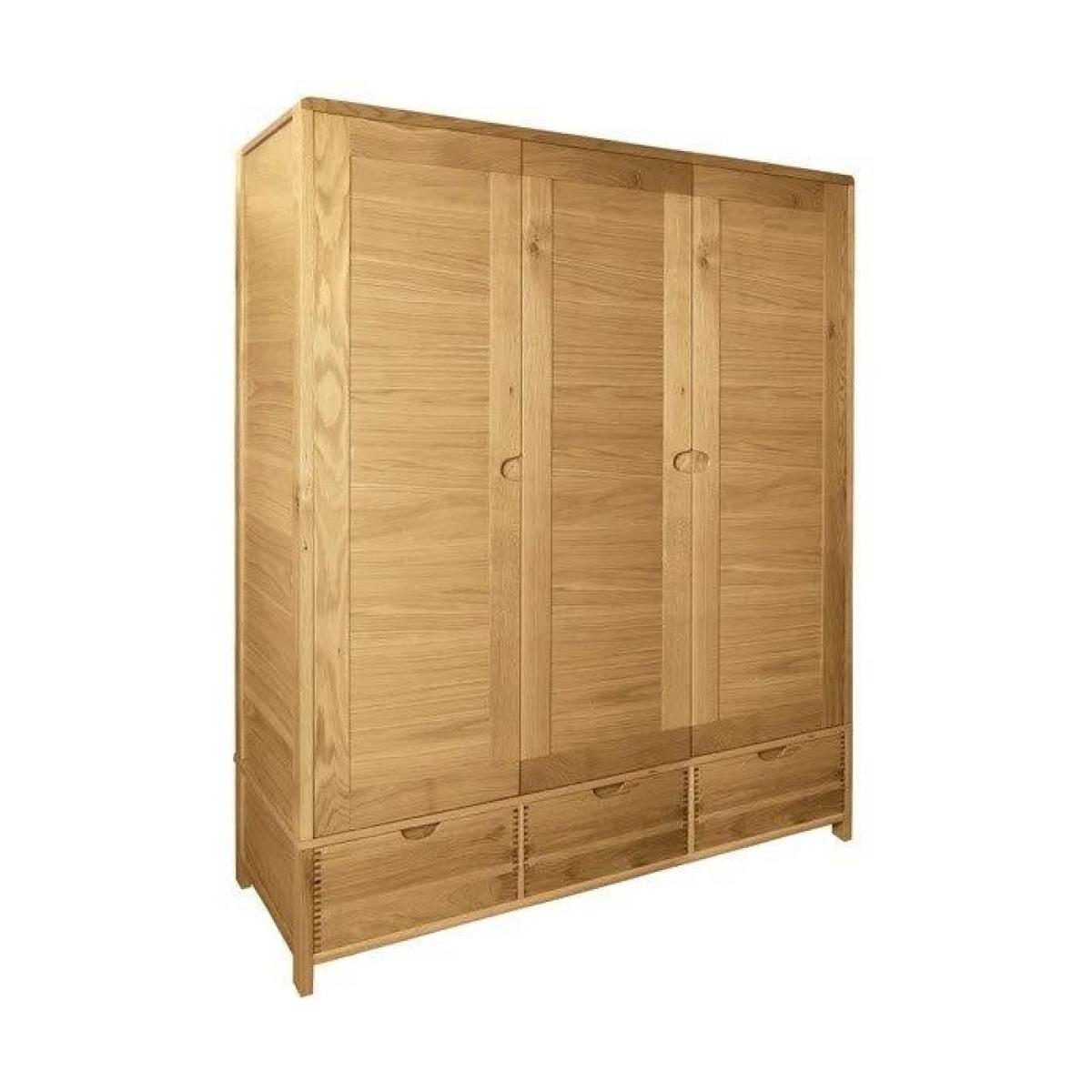 The Bosco 3 Door Wardrobe has three drawers at the bottom for added storage. The wardrobe has two compartments - one single-width and the other double. Each has a wooden rail from which to hang your clothes. Curved recessed drawer and door handles are both wonderfully tactile and simply elegant. The wardrobe features the signature Bosco curved finger joint on the top corners of the robe and finger joint details on the drawer fronts. This bedroom furniture is available in pale oak with a clear matt lacquer. The detail of the exposed finger joints and curved edges create a distinctive look for this bedroom furniture range. The bedroom cabinets and wardrobes have simple, easy to pull cut out handles and as well as being designed for its looks, the Bosco bedroom furniture range is also designed for comfort and for practicality. Available in Clear Matt only. This item requires assembly. Dimensions Height: 198cm Width: 160cm Depth: 61cm Wood is a natural material, consequently the grain pattern will vary from piece to piece. Cabinets and chests over 60cm tall should be fixed to the wall to ensure stability, anti-tip kits with fixtures will be provided. The fixing of these pieces to the wall will not be carried out by our delivery partner. Please follow the product instructions and immediately attach to a wall as stated. Upholstered furniture, images and the fabric visualiser are designed to act as a guide of how a piece will look. Pattern placement, exact colour and texture of a fabric can vary from this. While we endeavour to ensure that the stated dimensions are as accurate as possible, due to manufacturing tolerances, these may vary slightly.