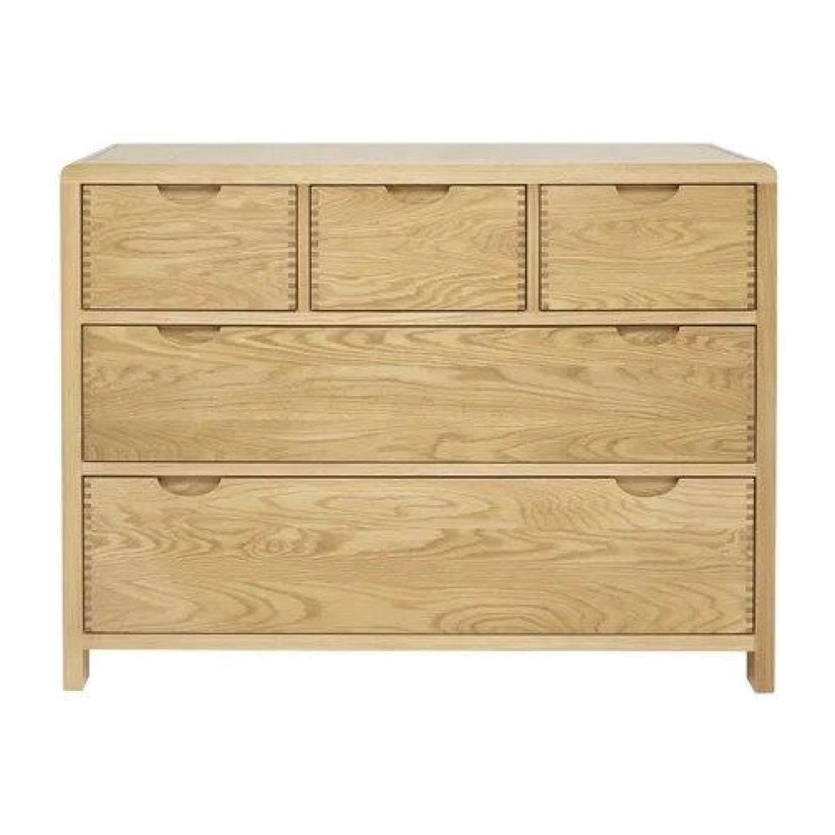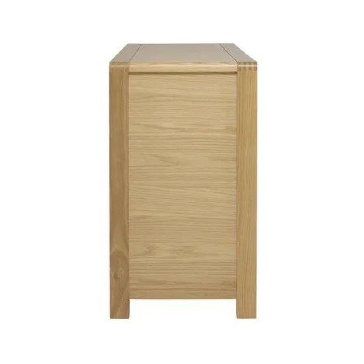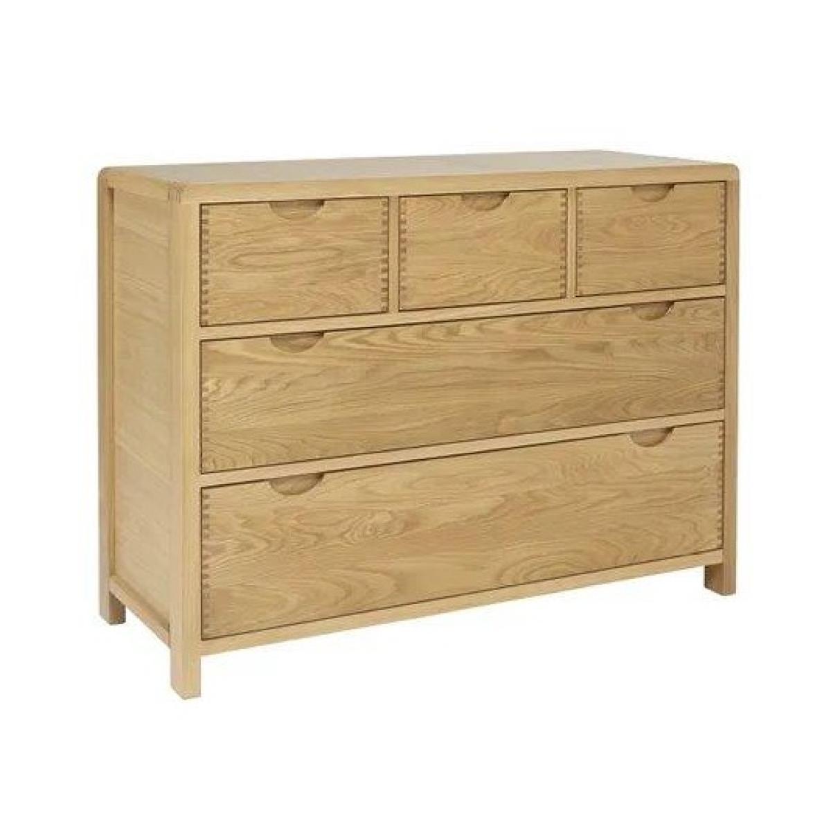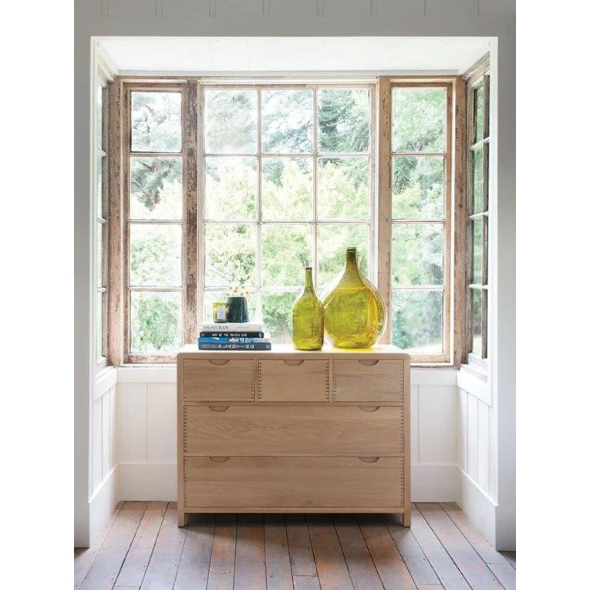 This Bosco 5 Drawer Wide Chest provides plenty of useful storage with its five deep drawers. Bosco is available in pale oak with a clear matt lacquer. This cabinet features the signature Bosco curved finger joint on the top corners of the chest and finger joint details on all the drawer fronts. A curved recessed drawer handle is both wonderfully tactile and simply elegant. The detail of the exposed finger joints and curved edges create a distinctive look for this bedroom furniture range. The bedroom cabinets and wardrobes have simple, easy to pull cut out handles and as well as being designed for its looks, the Bosco bedroom furniture range is also designed for comfort and for practicality. Available in Clear Matt only. This item comes fully assembled. Dimensions Height: 82cm Width: 110cm Depth: 45cm Wood is a natural material, consequently the grain pattern will vary from piece to piece. Cabinets and chests over 60cm tall should be fixed to the wall to ensure stability, anti-tip kits with fixtures will be provided. The fixing of these pieces to the wall will not be carried out by our delivery partner. Please follow the product instructions and immediately attach to a wall as stated. Upholstered furniture, images and the fabric visualiser are designed to act as a guide of how a piece will look. Pattern placement, exact colour and texture of a fabric can vary from this. Before ordering, we recommend viewing the fabric and wood finish in store and ordering samples to view at home. While we endeavour to ensure that the stated dimensions are as accurate as possible, due to manufacturing tolerances, these may vary slightly.