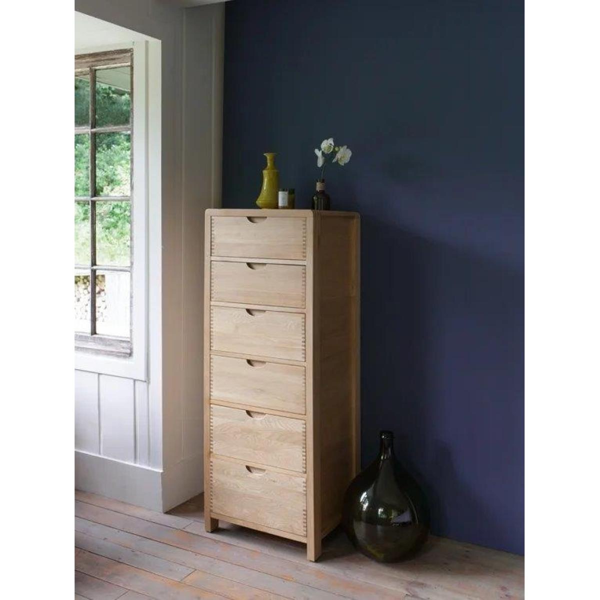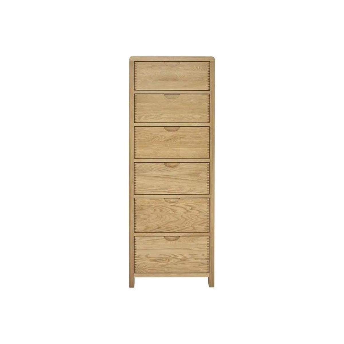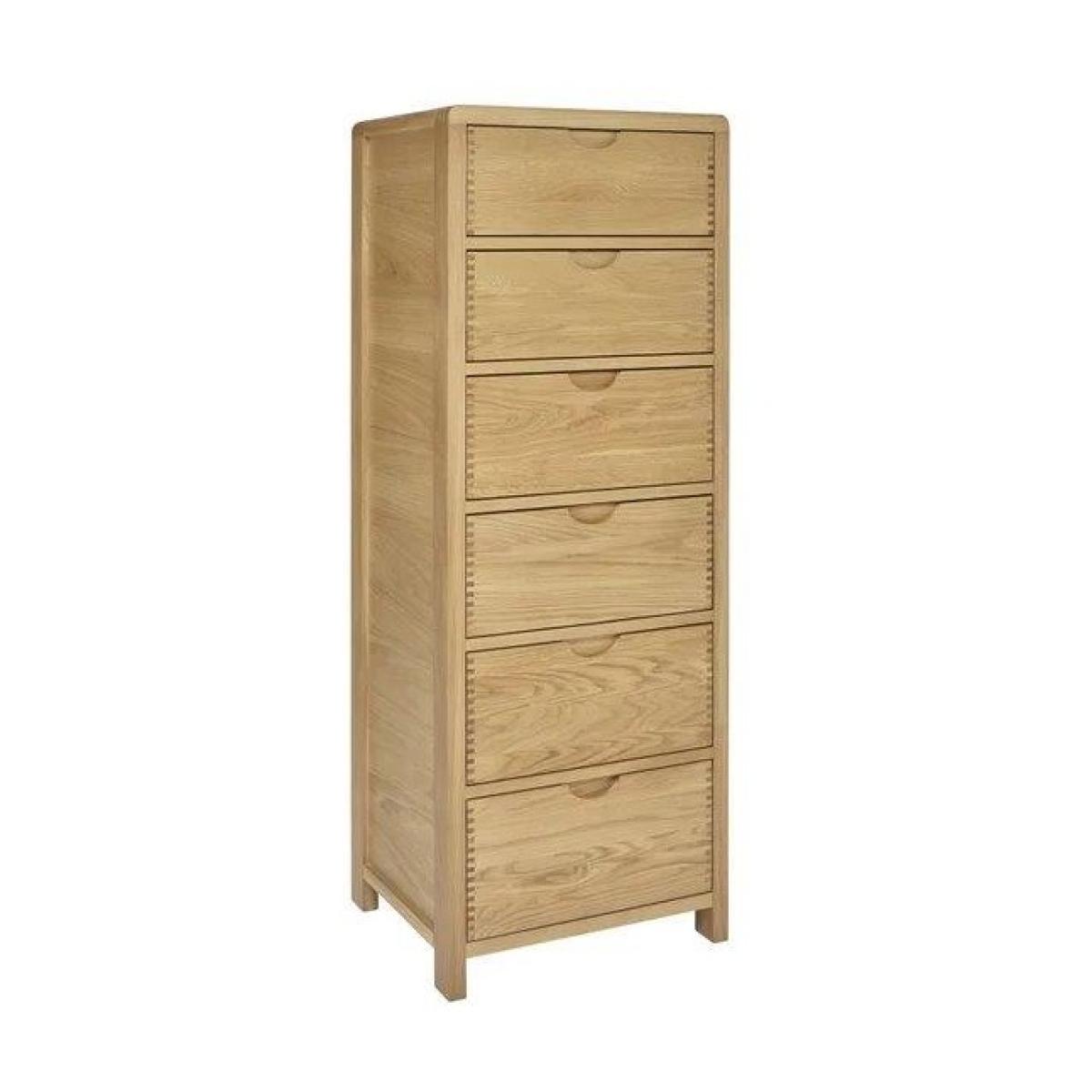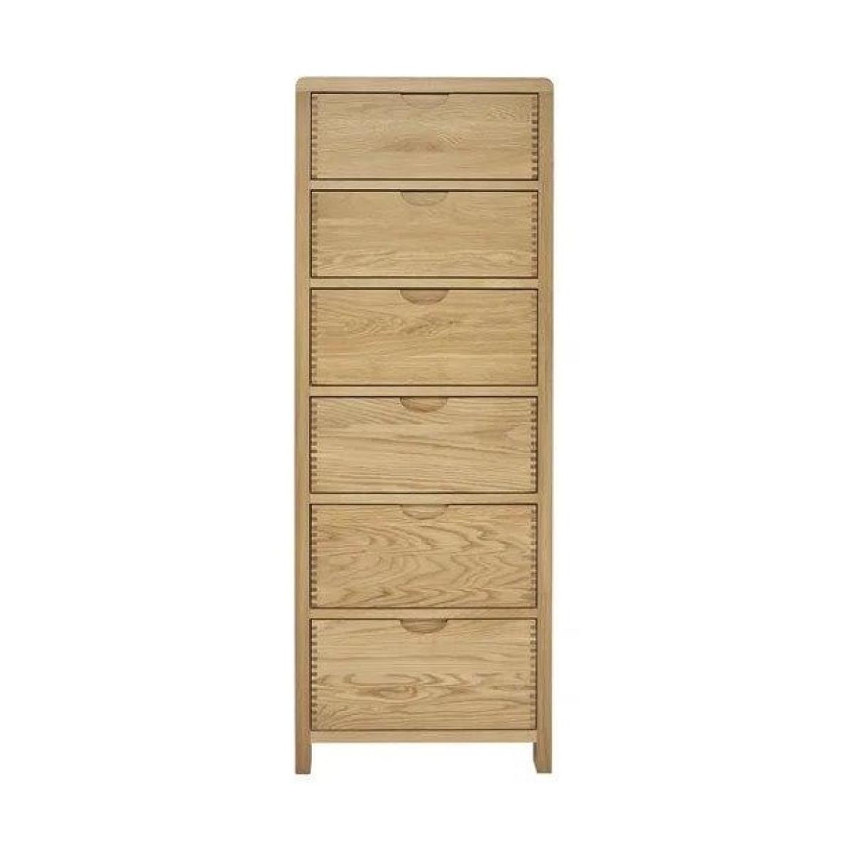 This Ercol Bosco 6 Drawer Tall Chest is a superbly useful piece of furniture, with plenty of storage in its six deep drawers, whilst its tall, narrow design means you can fit it in a small space - it is just 53 cm wide. Not only does this chest of drawers provide plenty of storage for your clothes, but it also looks great - with the signature Bosco curved finger joint on the top corners of the chest and finger joint details on all of the drawer fronts. A curved recessed drawer handle is both wonderfully tactile and simply elegant. The detail of the exposed finger joints and curved edges create a distinctive look for this bedroom furniture range. The bedroom cabinets and wardrobes have simple, easy to pull cut out handles and as well as being designed for its looks, the Bosco bedroom furniture range is also designed for comfort and for practicality. Available in Clear Matt only. This item comes fully assembled. Wood is a natural material, consequently the grain pattern will vary from piece to piece. Cabinets and chests over 60cm tall should be fixed to the wall to ensure stability, anti-tip kits with fixtures will be provided. The fixing of these pieces to the wall will not be carried out by our delivery partner. Please follow the product instructions and immediately attach to a wall as stated. Upholstered furniture, images and the fabric visualiser are designed to act as a guide of how a piece will look. Pattern placement, exact colour and texture of a fabric can vary from this. Before ordering, we recommend viewing the fabric and wood finish in store and ordering samples to view at home. While we endeavour to ensure that the stated dimensions are as accurate as possible, due to manufacturing tolerances, these may vary slightly. Dimensions Height: 144cm Width: 53cm Depth: 45cm