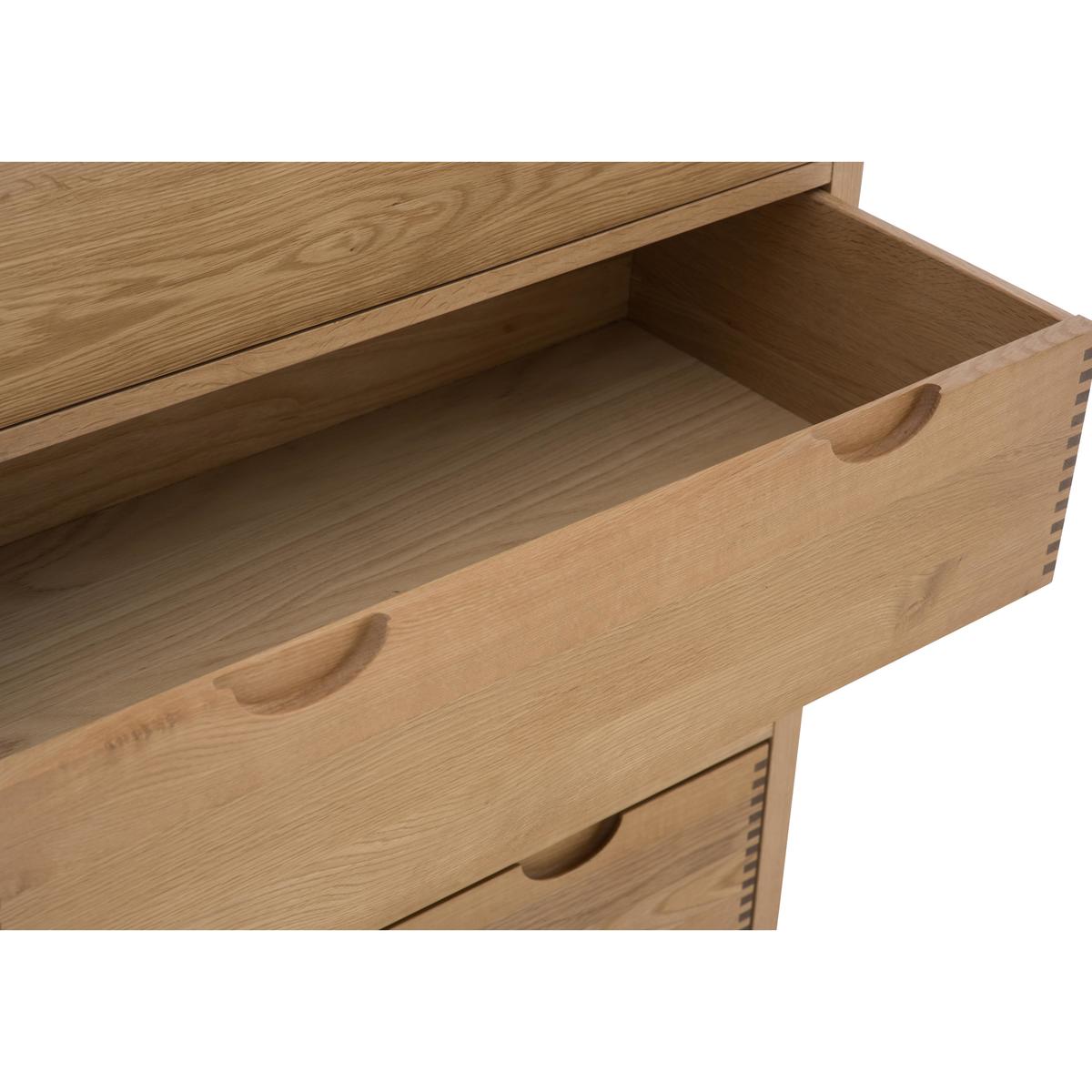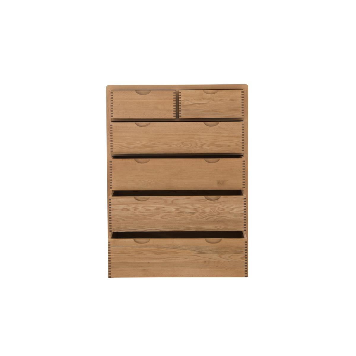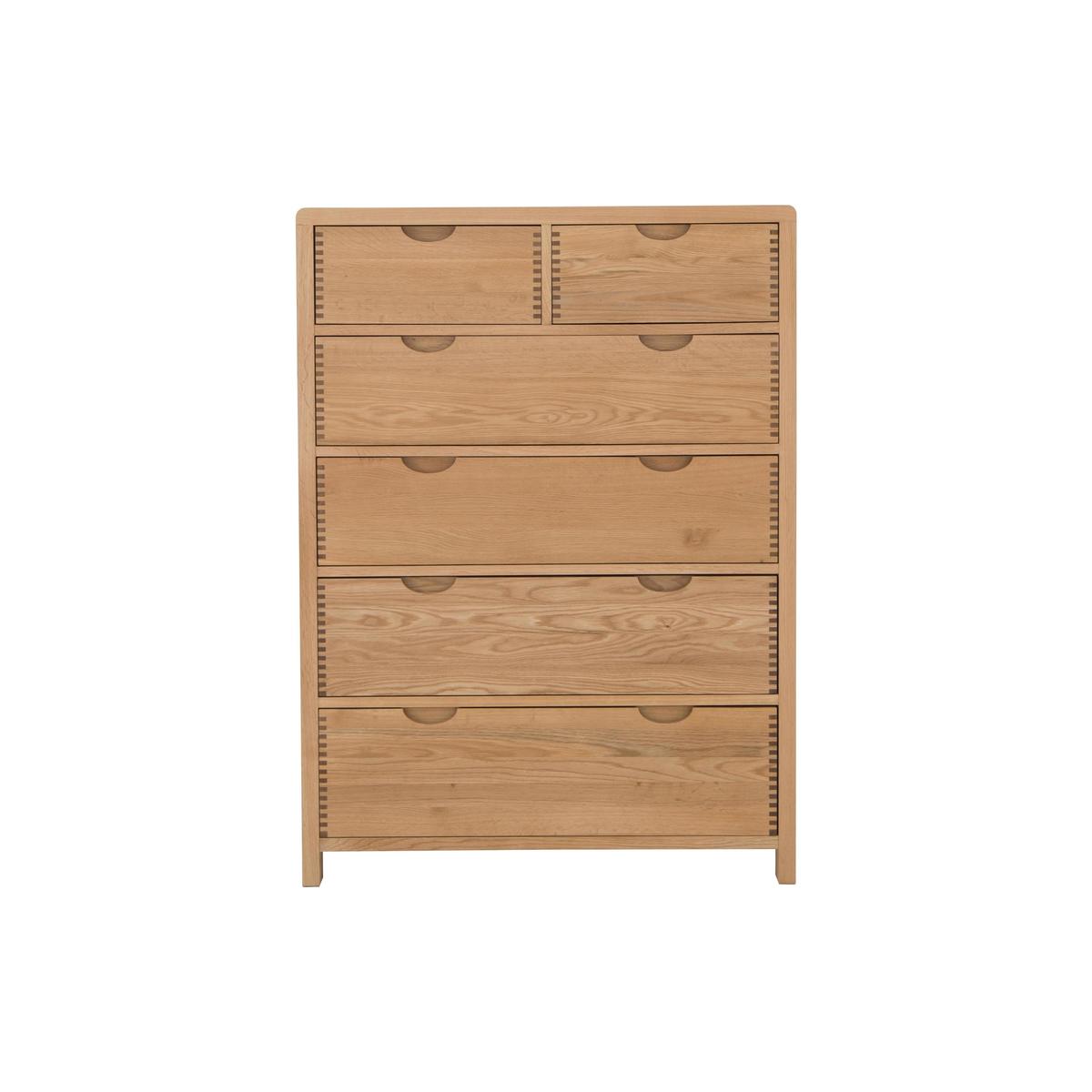 Wake up to the timeless beauty of Bosco wooden bedroom furniture. Each piece is exquisitely designed and handcrafted from solid oak with oak veneers, finished with a clear matt lacquer. This brings out the unique natural variations in the grain. Detailing includes exposed finger joints and distinctive cut out handles. Finished to the high standards you’d expect from ercol. A thing of beauty from top to bottom, the stylish Bosco 6 drawer tall chest combines wonderful bedroom storage with gorgeous craftsmanship. This large chest of drawers showcases ercol’s signature detailing in the exposed finger joints and attractive semi-circular recessed handles. It’s made from solid oak and oak veneer and is finished with a clear matt lacquer which really emphasises the natural wood grain. Tall and wide, this chest of drawers offers plenty of useful storage with two smaller drawers above four full-width deep drawers. The ercol Bosco 6 drawer tall chest is one of two chests of drawers in the ercol Bosco bedroom furniture collection. The range also includes a stunning bed frame, bedside cabinet, storage bench and two wardrobes. If you love the look, know that the ercol Bosco living and dining room collection offers a huge range of storage pieces, occasional tables, dining tables and dining chairs. WARNING!. Furniture can tip over unexpectedly and cause injury. This item shall be fixed to a wall using the anti-tip kit provided with the furniture. Be sure to use the correct wall fixings suitable for the walls in your home. Did you know?. Natural wood has unique markings, with some colour variation. The colour and tone of wood improves with age.