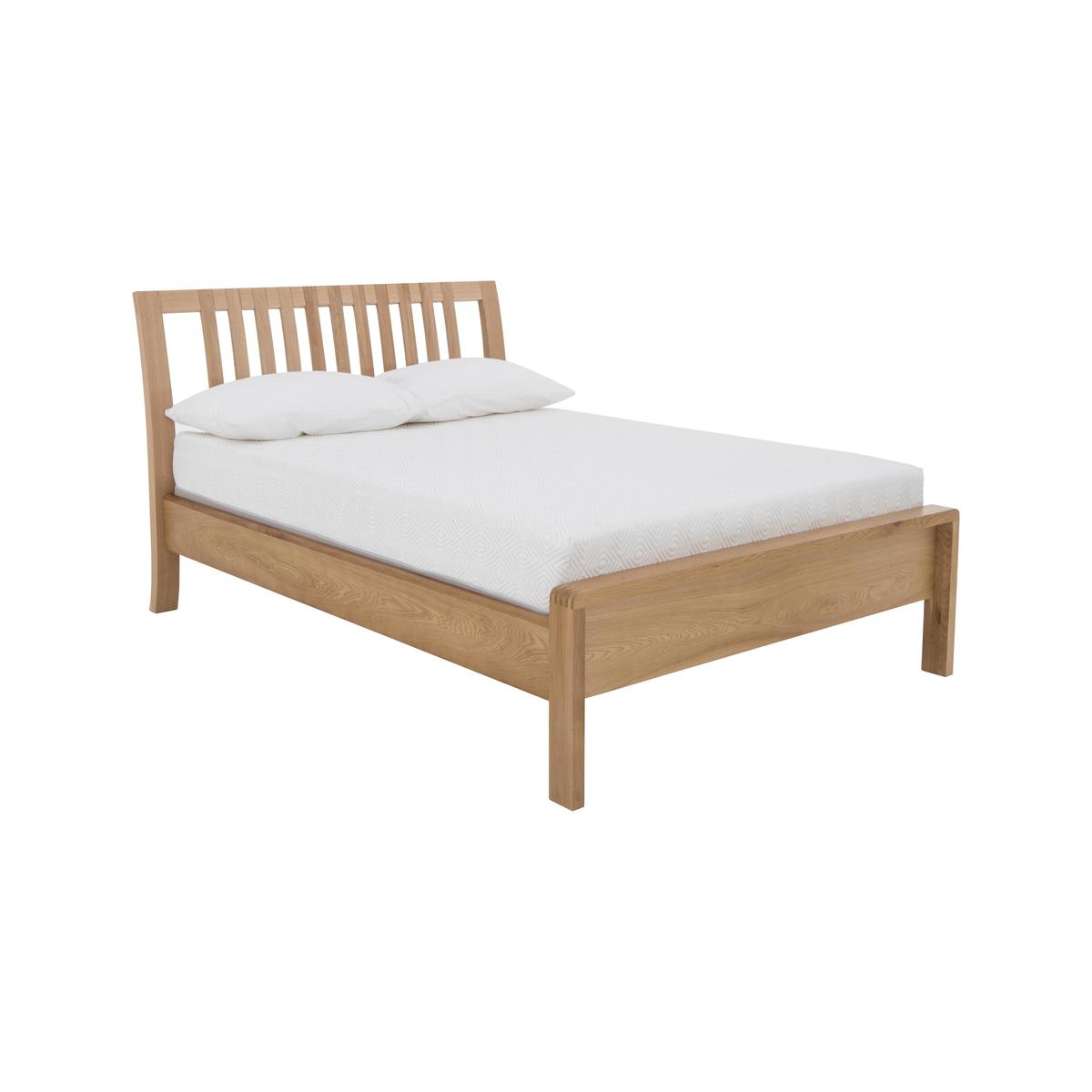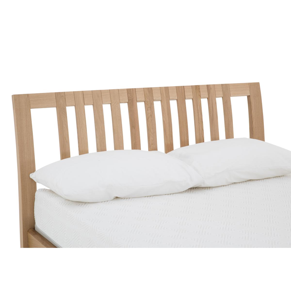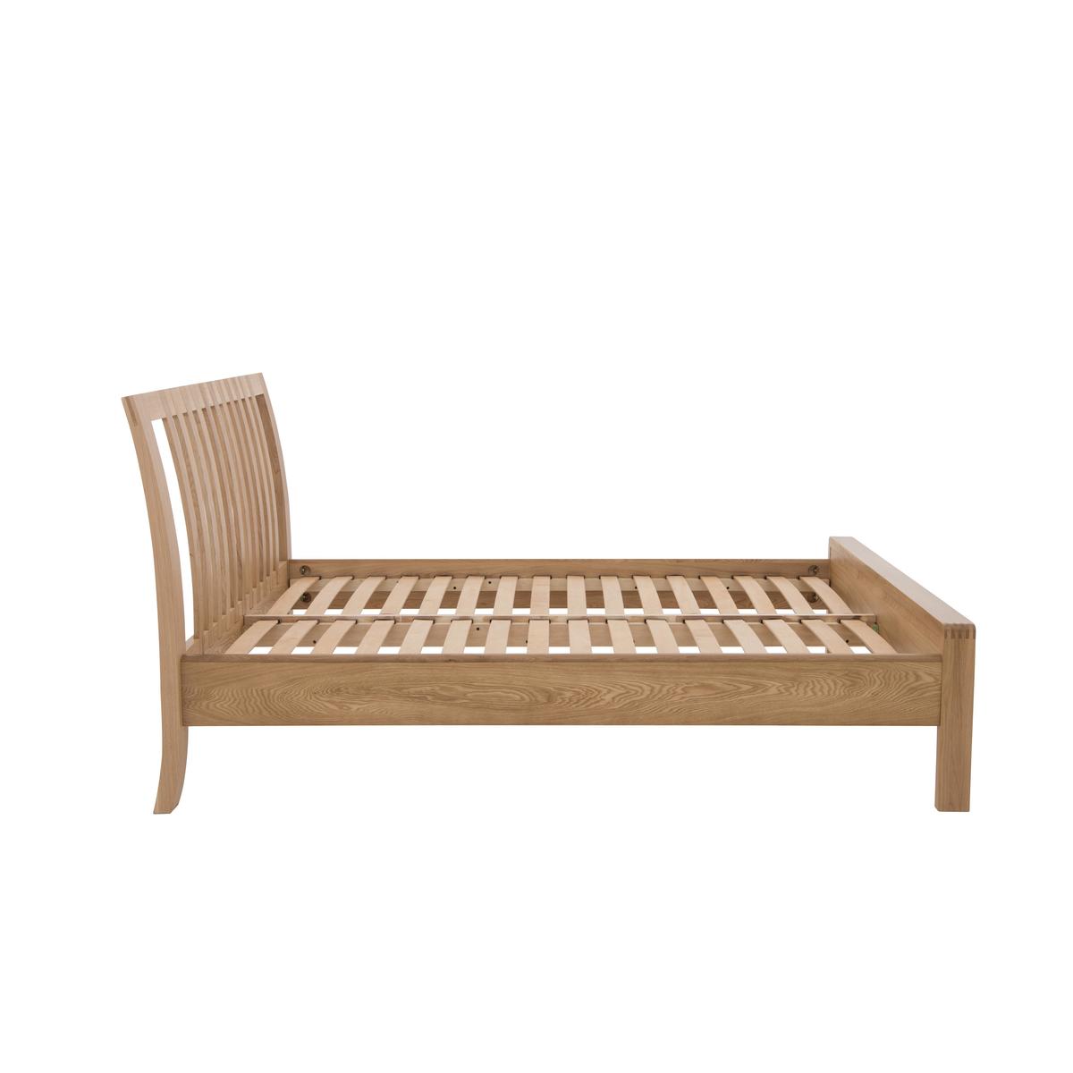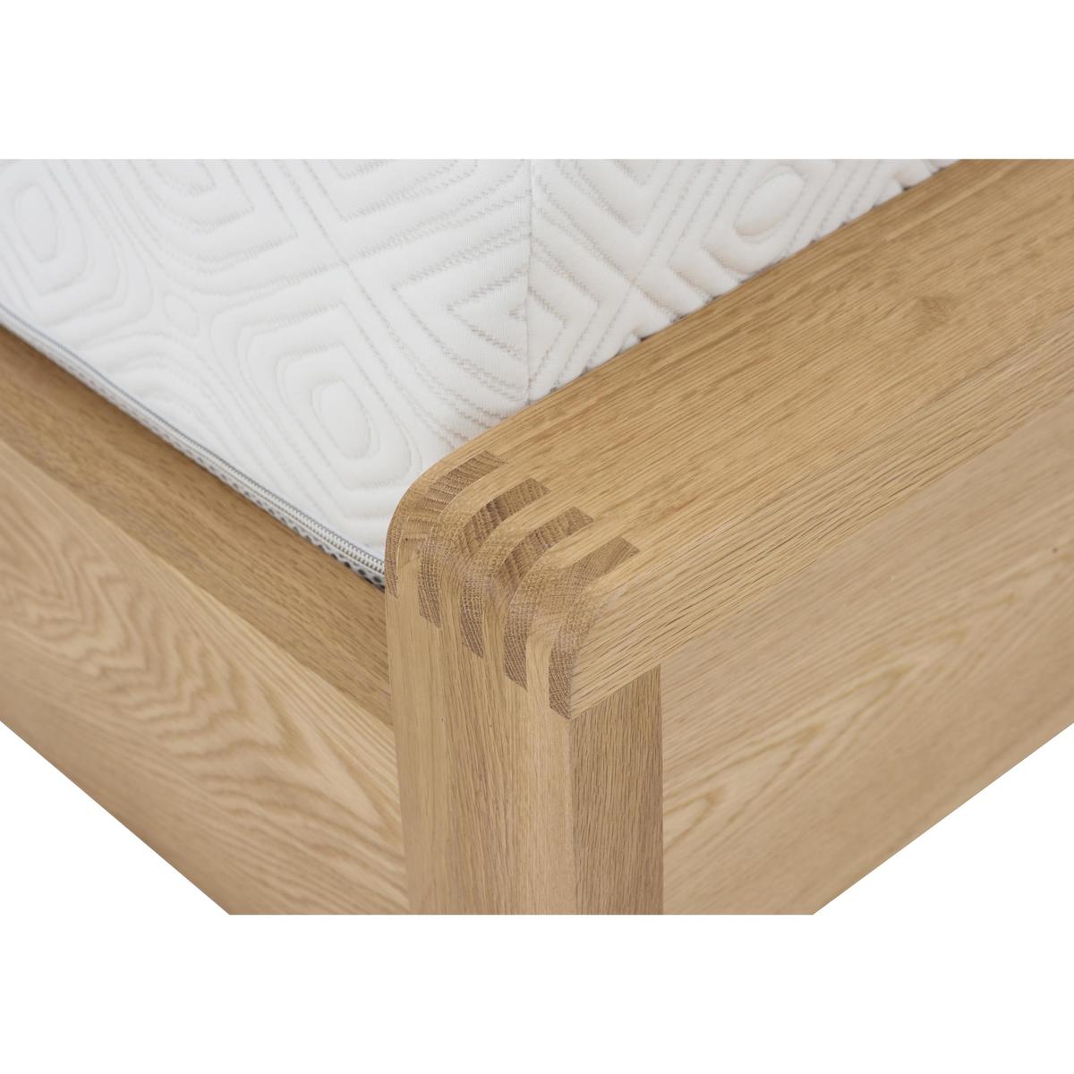 Wake up to the timeless beauty of Bosco wooden bedroom furniture. Each piece is exquisitely designed and handcrafted from solid oak with oak veneers, finished with a clear matt lacquer. This brings out the unique natural variations in the grain. Detailing includes exposed finger joints and distinctive cut out handles. Finished to the high standards you’d expect from ercol. Headboard and footboard each come as one single piece. The ercol Bosco bed frame is thoughtfully designed and beautifully crafted. It’s made from solid oak with oak veneers and has a lovely, natural wood grain that’s enhanced with a clear matt lacquer. The headboard has a distinctive curve, a continuation of the legs, and broad vertical slats that are jointed into the top rail – a stylish design element that adds to this piece’s well-crafted appearance. The footboard has beautifully rounded corners and exposed finger joints. As well as being beautiful, this bed frame is engineered for comfort with a sprung slatted base that’s so supportive – and suitable for any type of mattress (sold separately). The stunning ercol Bosco bed frame is part of the ercol Bosco bedroom collection which also includes wardrobes, chests of drawers and a bedside cabinet. The coordinating ercol Bosco living and dining ranges allow you to enjoy this wonderful aesthetic throughout your home. Did you know?. Natural wood has unique markings, with some colour variation. The colour and tone of wood improves with age. Mattress available separately.