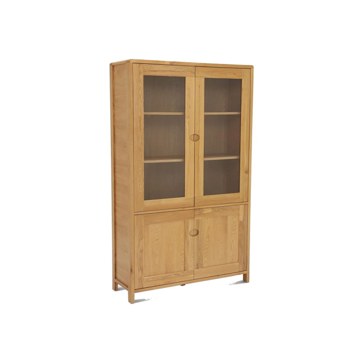This contemporary oak cabinet offers two separate storage sections. The large upper glass cabinet consists of two adjustable storage shelves, offering plentiful space for your glassware. At the base of the cabinet there is another ample sized cupboard divided vertically into two with each side having an adjustable storage shelf. Recessed handles, which are both wonderfully tactile and simply elegant, compliment each of the cupboard doors. The oak cabinet also features curved finger joint detailing, a signature feature of the bosco design.
