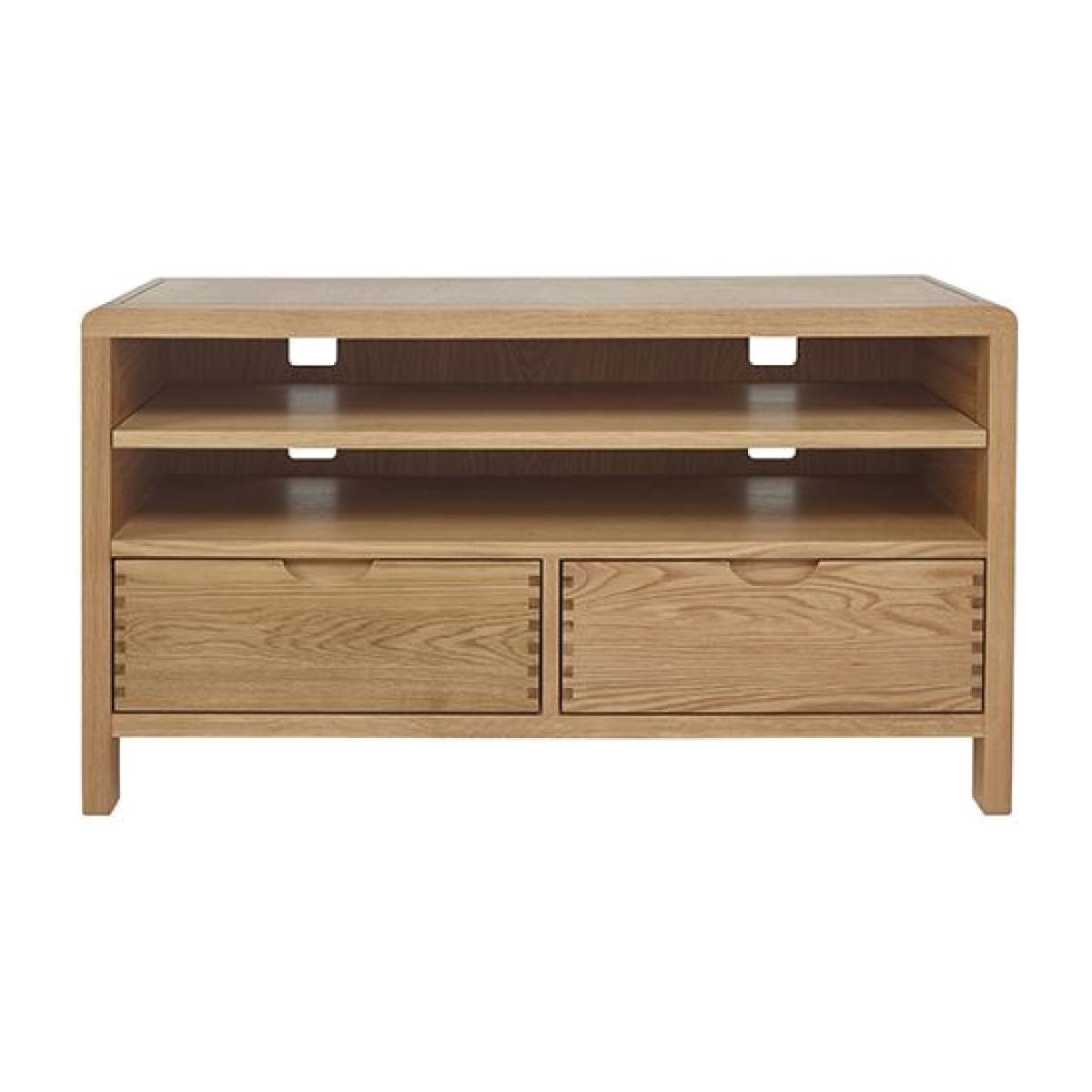 A delight to behold. The Ercol Bosco TV Unit has been designed to meet the needs of today's living with spacious TV Unit that provide excellent storage it is perfect for any living room. Through incorporating subtle soft curves Ercol have managed to emphasise the solidity of the timber whilst keeping the soft feel of the range. It is finished with a clear lacquer which shows off the oak pattern and colour of the grain. Ercol Oak Wood Clear Matt Finish Dimensions: 100 x 45 x 55cm