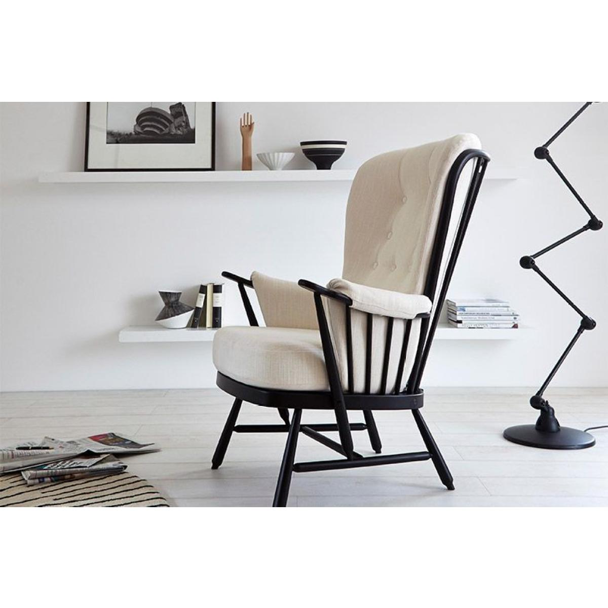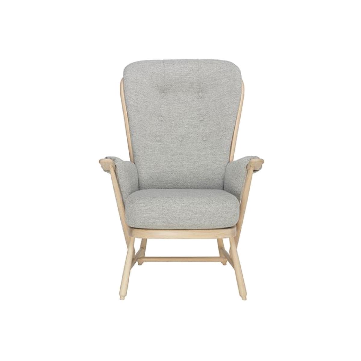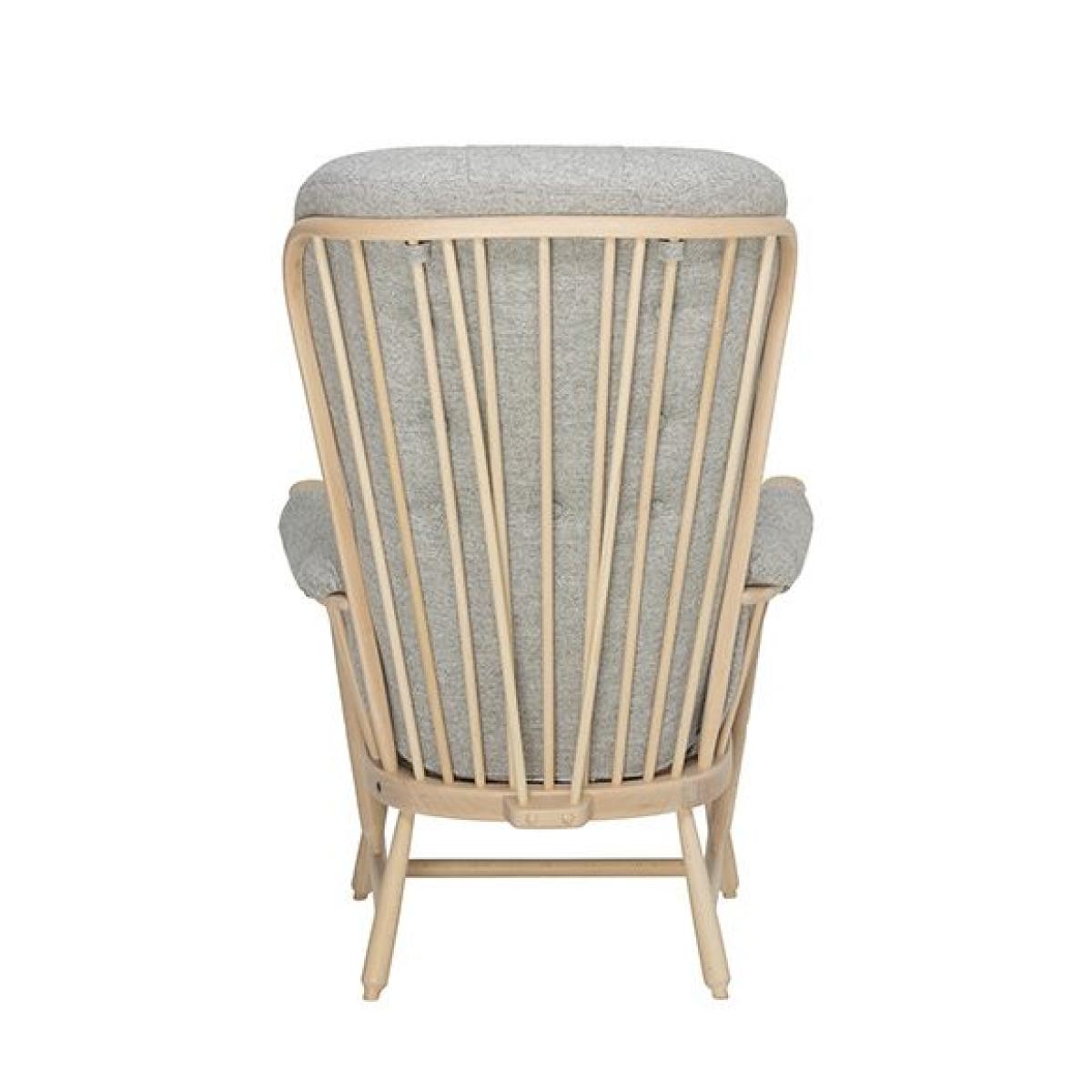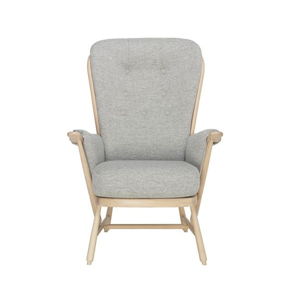 The wonderfully steam bent back bow arches gracefully to create the classic high back, making the armchair a timeless piece, perfect for your living room or conservatory. The Evergreen armchair echoes centuries of tradition combined with the latest upholstery levels of comfort. The seat cushion made from supportive foam and the back cushion constructed of a range of foams provides an upright, supportive sit. Extra support is added by the upturned arm rests which extend from either side of the back arch, supported by turned lists. Foam upholstered arm coverings make this chair a cosy sit. The high back on this lounge chair provides added support and the webbing on the base of the chair adds spring and comfort. Classic Windsor wedge joints both provide great strength and a beautiful feature on the arms, whilst ercol comb joints provide great strength to the seat frame. Available in a wide choice of fabrics from the Ercol collection and in a choice of wood finishes, Evergreen features a buttoned back cushion and so we do not recommend the use of striped fabrics with this chair. Couple this chair with the Evergreen footstool for total relaxation. W 77cm D 89cm H 108cm SH 48cm. Wood: Beech. Made in the UK. Pictured here in Clear Matt Wood with E533 Fabric. * Please Note: We've tried to reproduce this product as best as we can but because it's a made to order design, the image acts as a guide and may not be representative of the finished item. Seams, pattern placement, exact colouring and texture of the fabric can vary slightly. Before ordering, we recommend you view any fabrics in situ. To facilitate this, samples are available to order online. Wood finishes and colour samples are shown for guidance only as screen colours may vary. We recommend ordering a sample in your chosen finish. However, wood is a natural material and varies in colour, grain and structure.