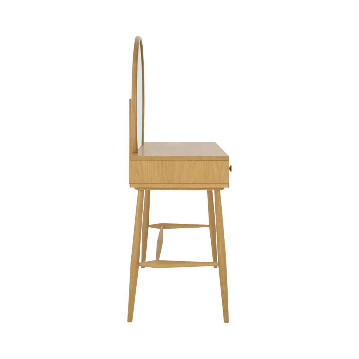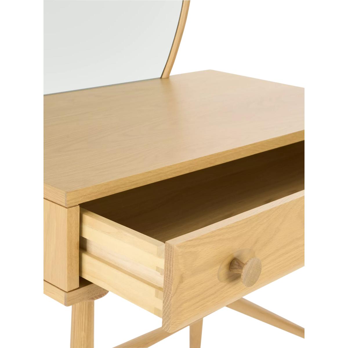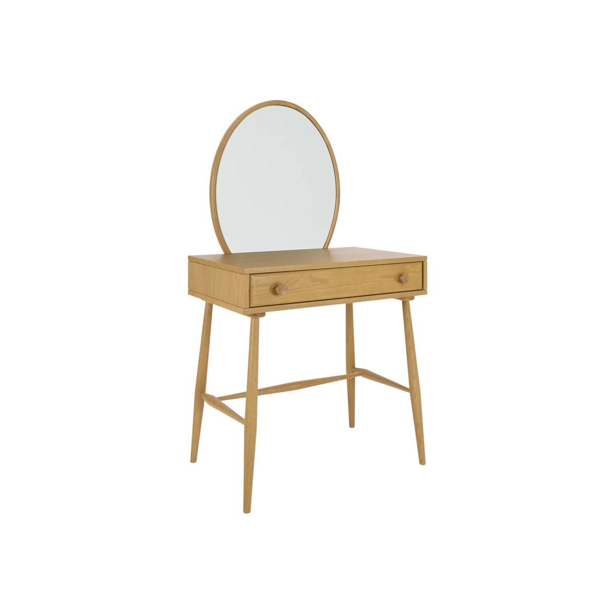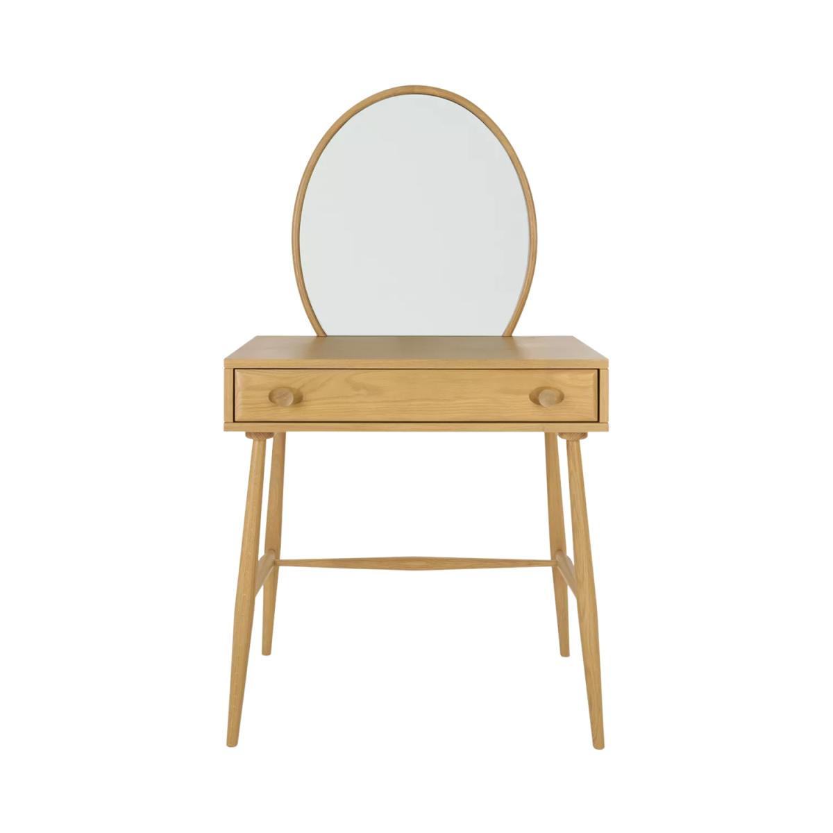 This well-proportioned dressing table will elevate your space thanks to its design which celebrates both modern and Mid-century influences. Built from a combination of robust timbers, it features a striking, fixed oval mirror and a handy drawer for storage, and it rests on sleek, tapered legs which nods to ercol's signature style. Finished in a protective matt lacquer that highlights the natural wood grains. See me in-store It's a good idea to get a feel for new furniture before you make a purchase.
