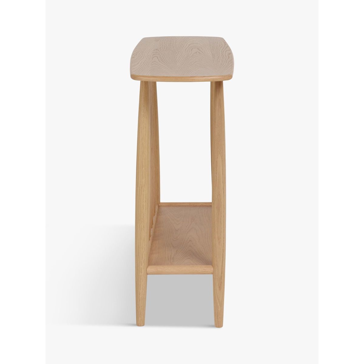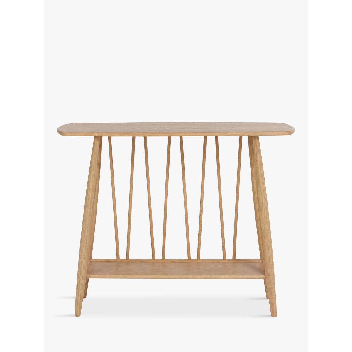 The shape and features of the ercol Shalstone living and dining range highlight ercol's original furniture designs, reinterpreted exclusively for John Lewis & Partners. Showcasing elegant tapered legs, oak spindles and functional storage spaces, each piece is constructed from smooth pale oak in a matt finish. This mid-century inspired console table will become a feature piece in your hallway and provides convenient storage space thanks to the lower shelf. Its timeless design is crafted from sturdy solid oak and veneers in a contemporary matt finish, while a lacquer ensures its durability. Complete with distinctive spindle detailing to the back and carefully curved edges, this table will suit both modern and traditional interior styles. Want to see it first? You may want to see and get a feel for the furniture in one of our shops before ordering. We'll be able to tell you where the range you'd like to view is on display.