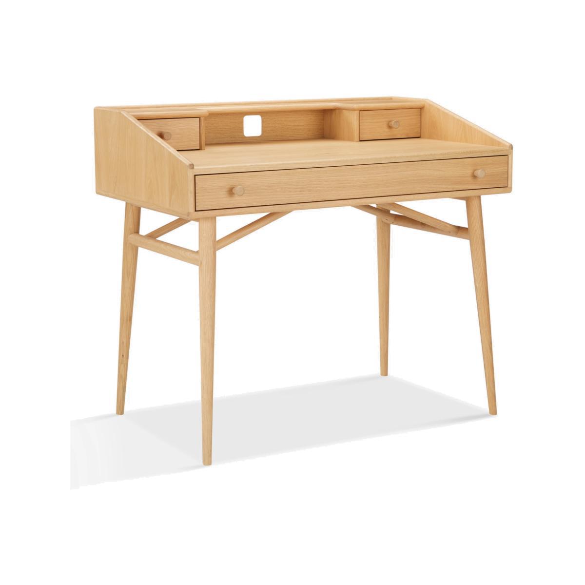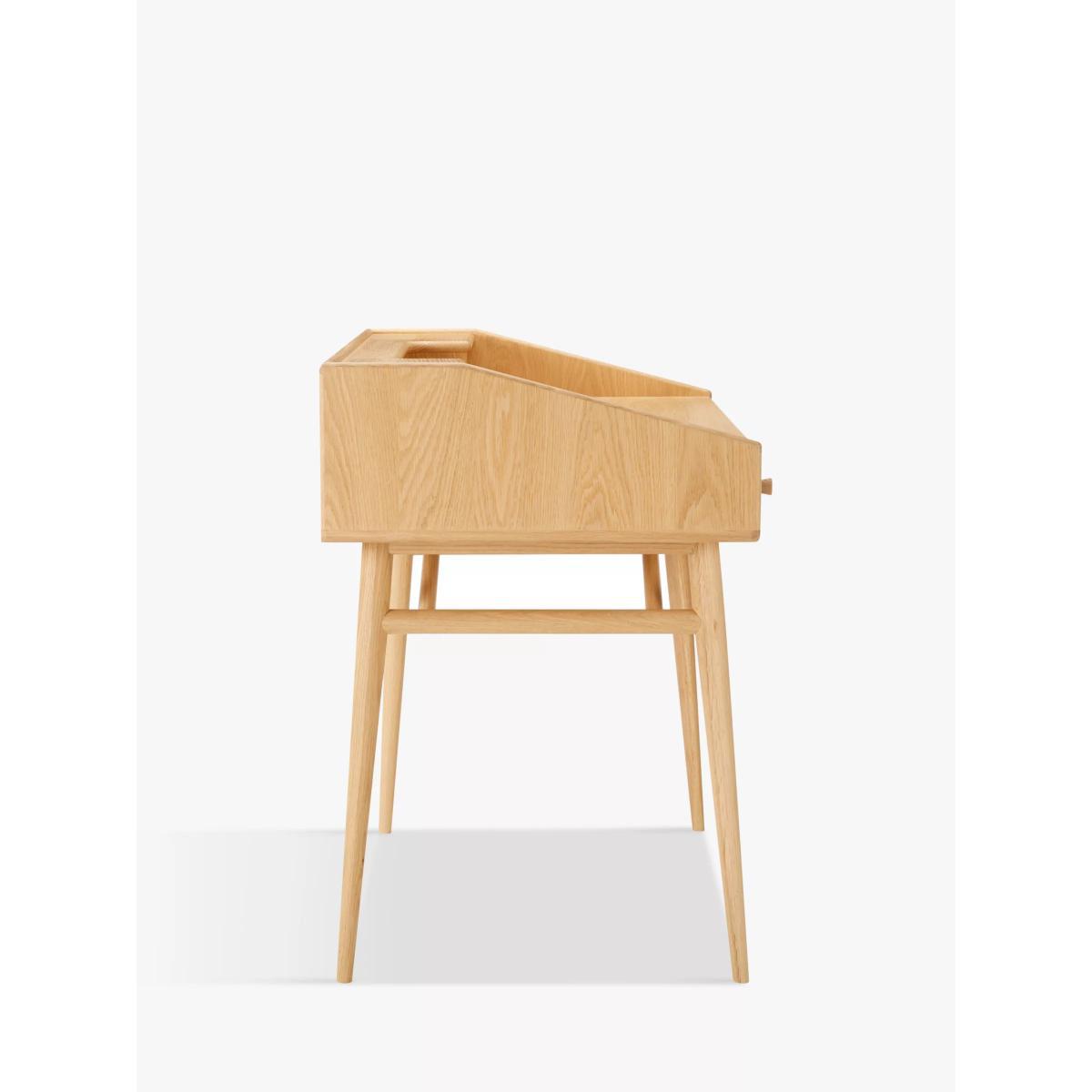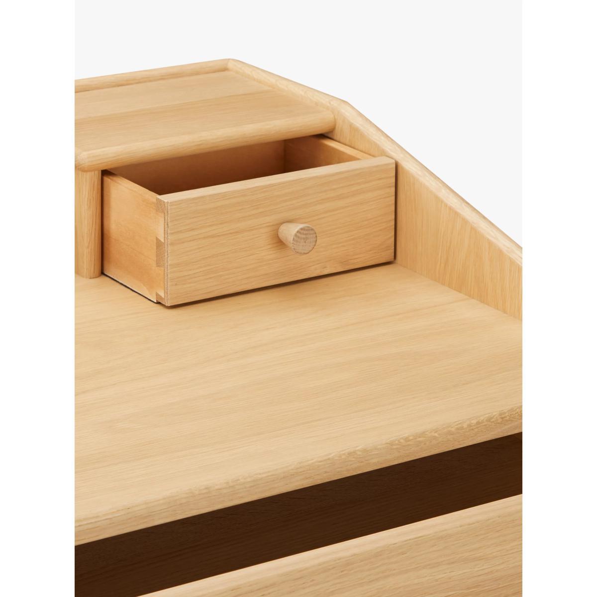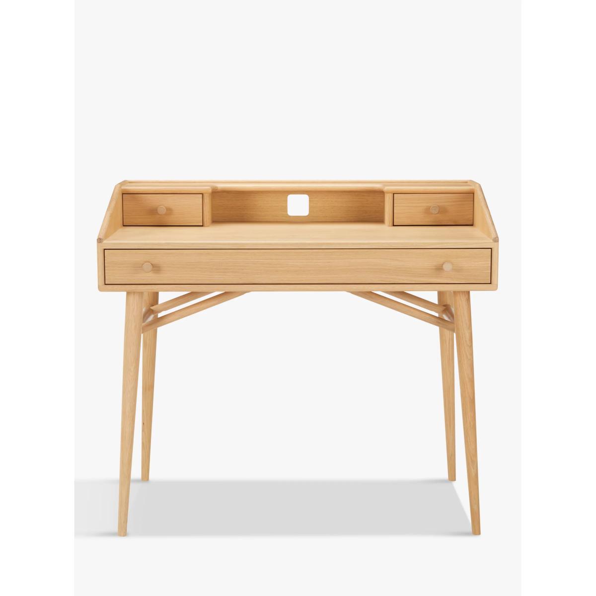 The shape and features of the ercol Shalstone living and dining range highlight ercol's original furniture designs, reinterpreted exclusively for John Lewis & Partners. Showcasing elegant tapered legs, oak spindles and functional storage spaces, each piece is constructed from smooth pale oak in a matt finish. This mid-century, Scandi-inspired desk is crafted from solid oak and finished with a durable lacquer. Three drawers provide convenient storage space, while a cable hole at the rear allows you to keep unsightly cables in order. It's supported by robust sculpted legs that taper subtly to the floor. Want to see it first? You may want to see and get a feel for the furniture in one of our shops before ordering. We'll be able to tell you where the range you'd like to view is on display.