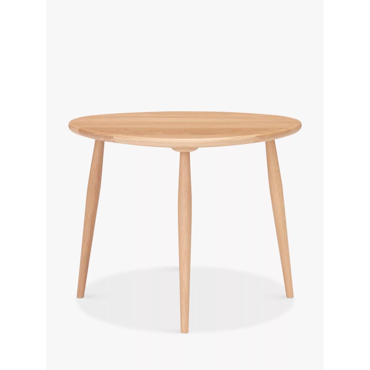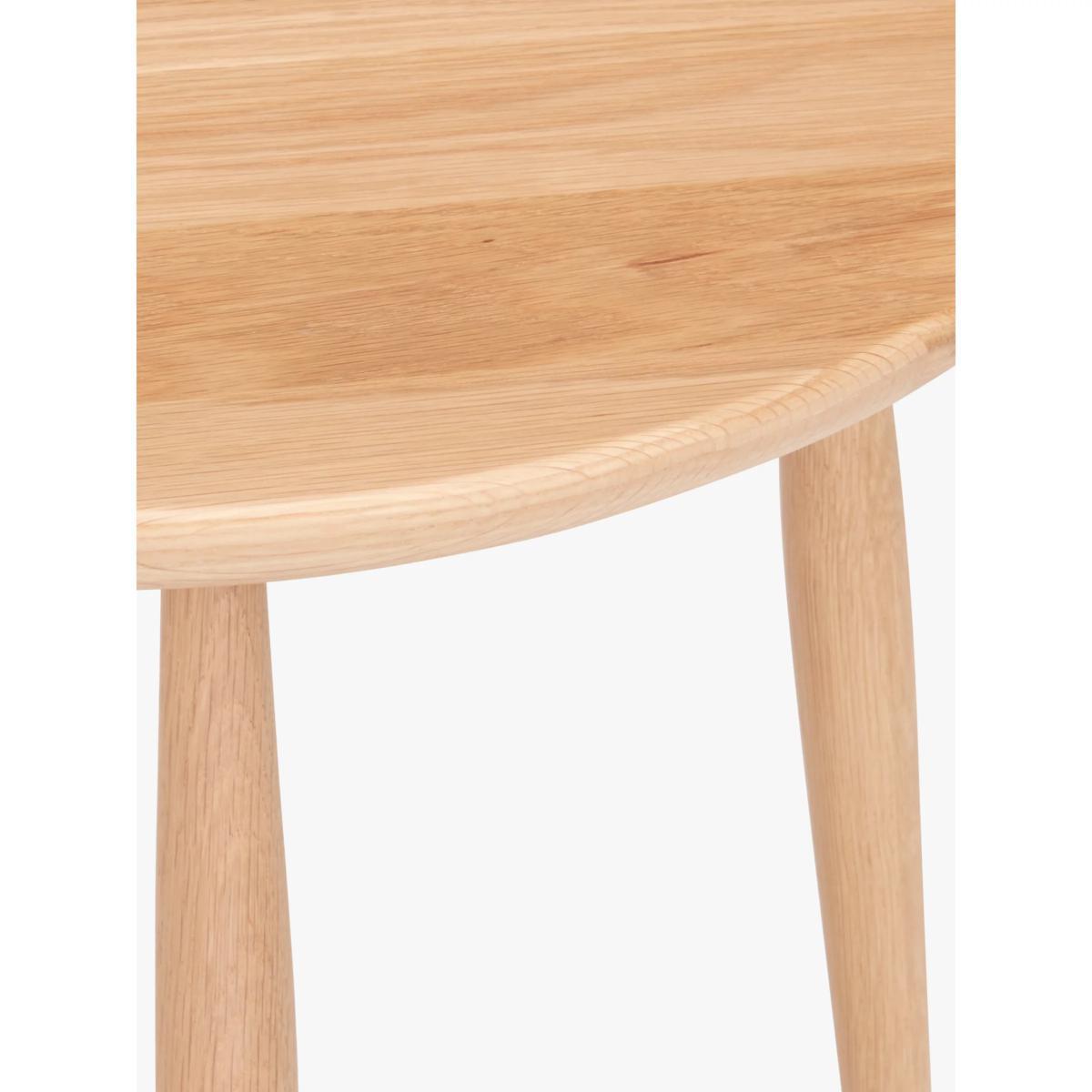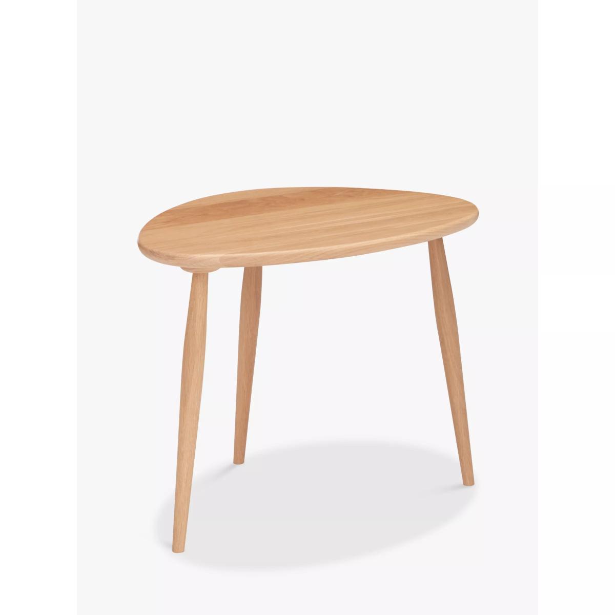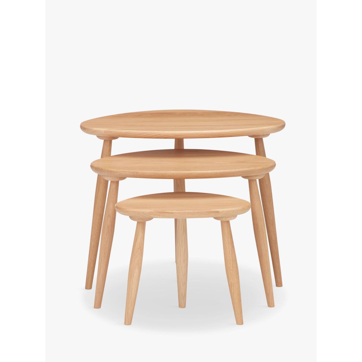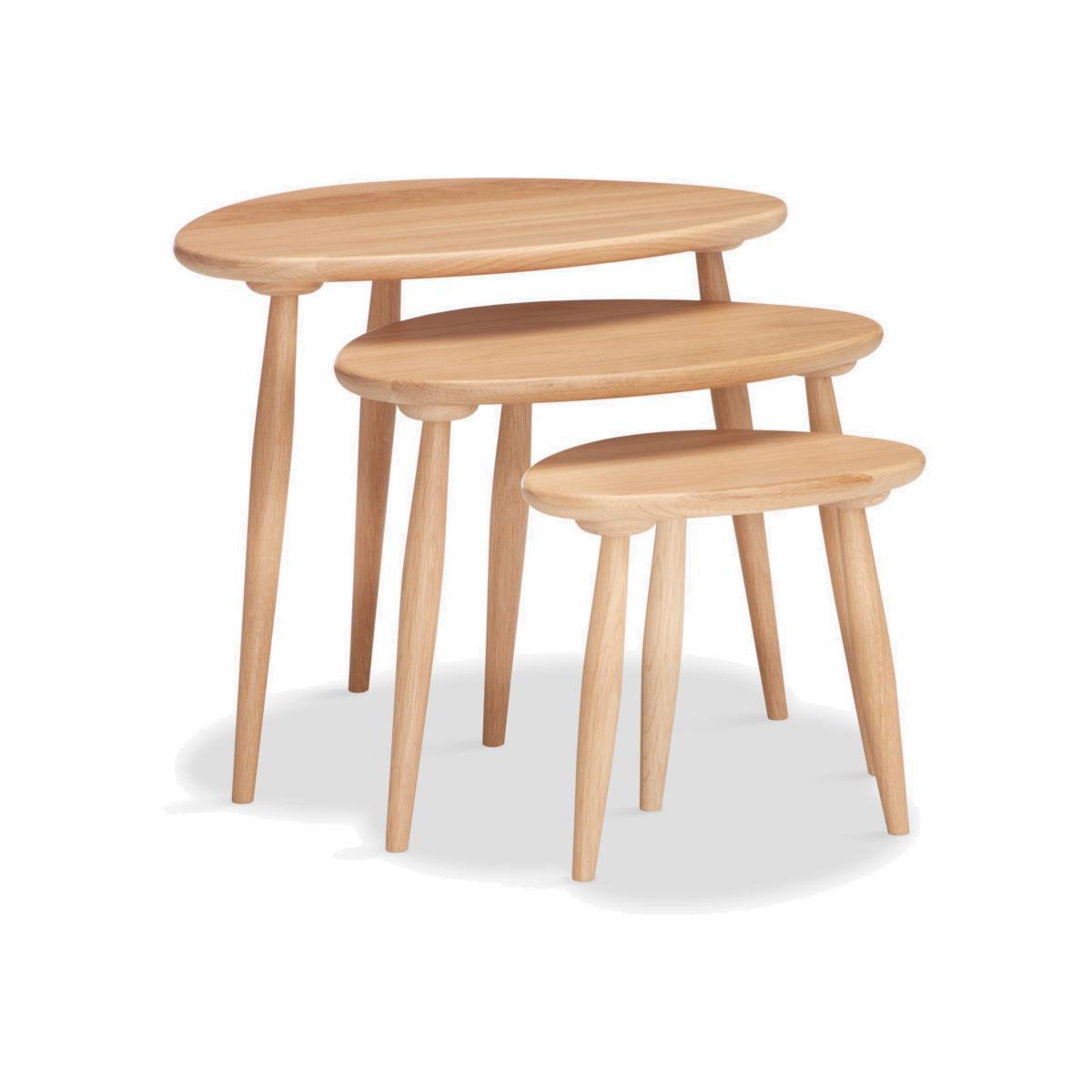 The shape and features of the ercol Shalstone living and dining range highlight ercol's original furniture designs, reinterpreted exclusively for John Lewis & Partners. Showcasing elegant tapered legs, oak spindles and functional storage spaces, each piece is constructed from smooth pale oak in a matt finish. Ideal for smaller spaces, this nest of tables features three tables of different sizes, designed so that one can neatly slot underneath the other. Crafted from solid oak and finished with a lacquer for durability, their natural aesthetic highlights curved edges and tapered legs offering a distinctly clean and versatile design. Want to see it first? You may want to see and get a feel for the furniture in one of our shops before ordering. We'll be able to tell you where the range you'd like to view is on display.