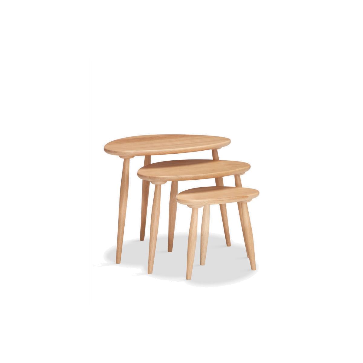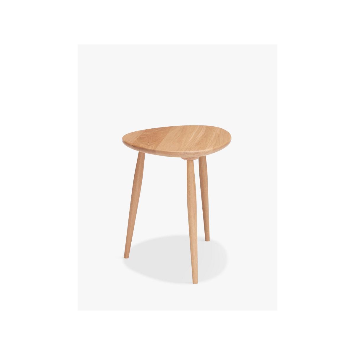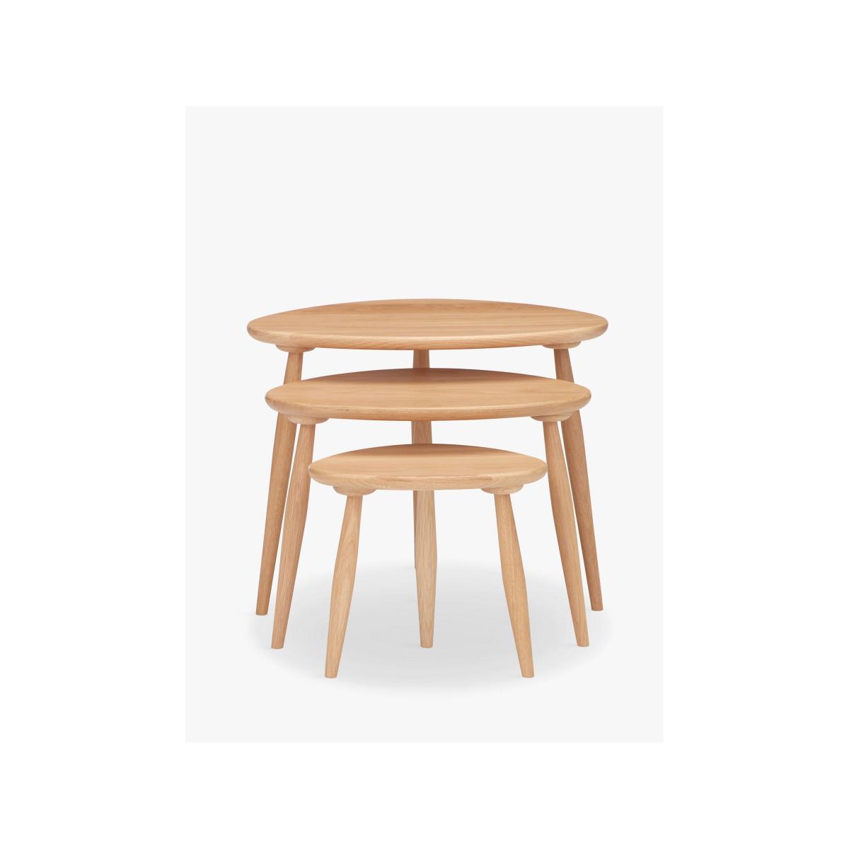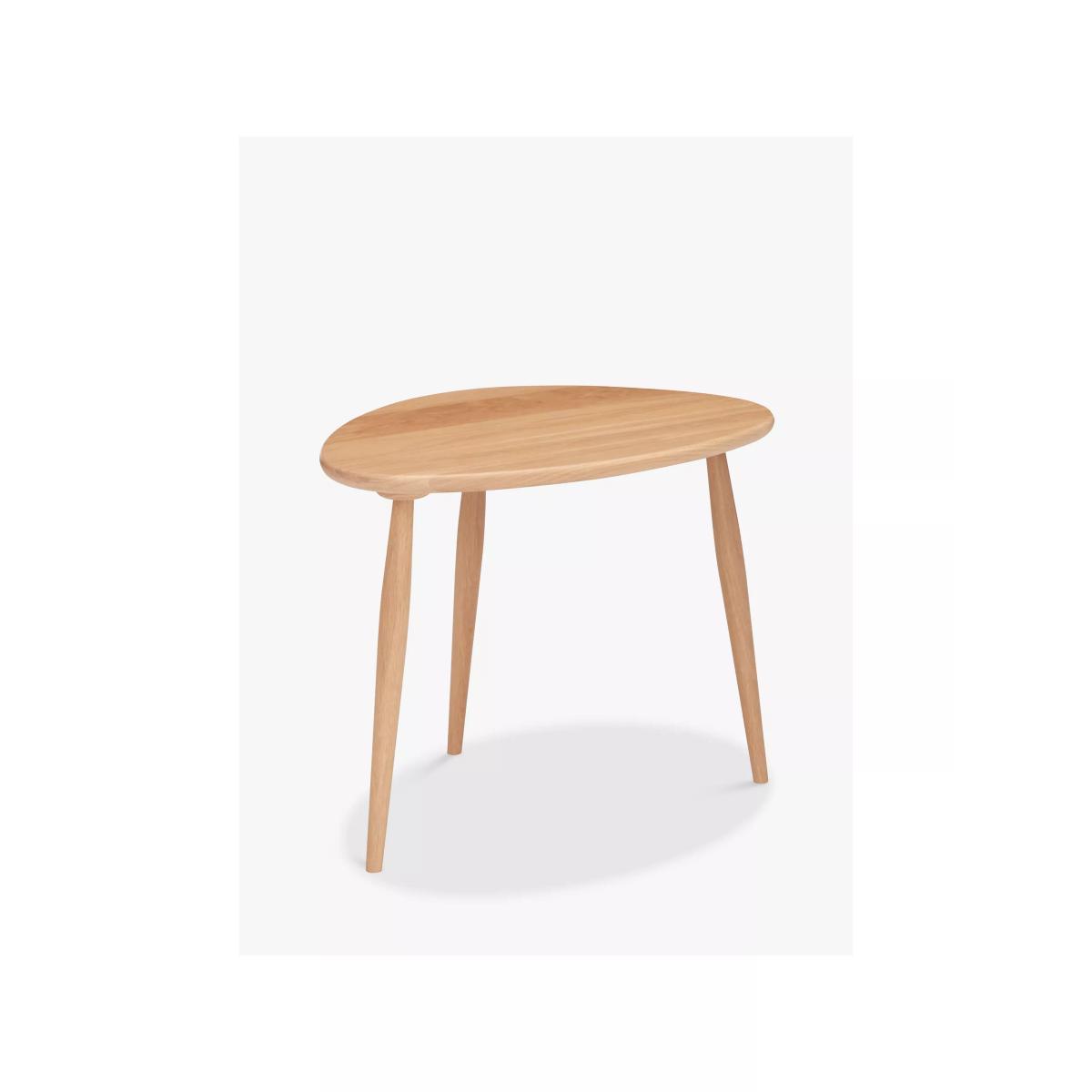 The shape and features of the ercol Shalstone living and dining range highlight ercol’s original furniture designs, reinterpreted exclusively for John Lewis. Showcasing elegant tapered legs, oak spindles and functional storage spaces, each piece is constructed from smooth pale oak in a matt finish. Ideal for smaller spaces, this nest of tables features three tables of different sizes, designed so that one can neatly slot underneath the other. Crafted from solid oak and finished with a lacquer for durability, their natural aesthetic highlights curved edges and tapered legs offering a distinctly clean and versatile design. Want to see it first? You may want to see and get a feel for the furniture in one of our shops before ordering. We'll be able to tell you where the range you'd like to view is on display.