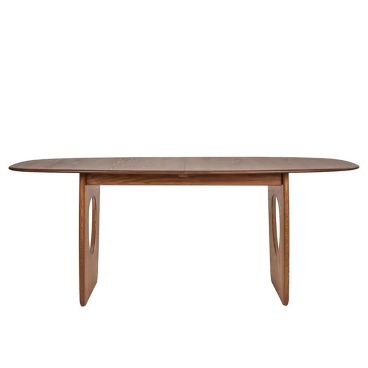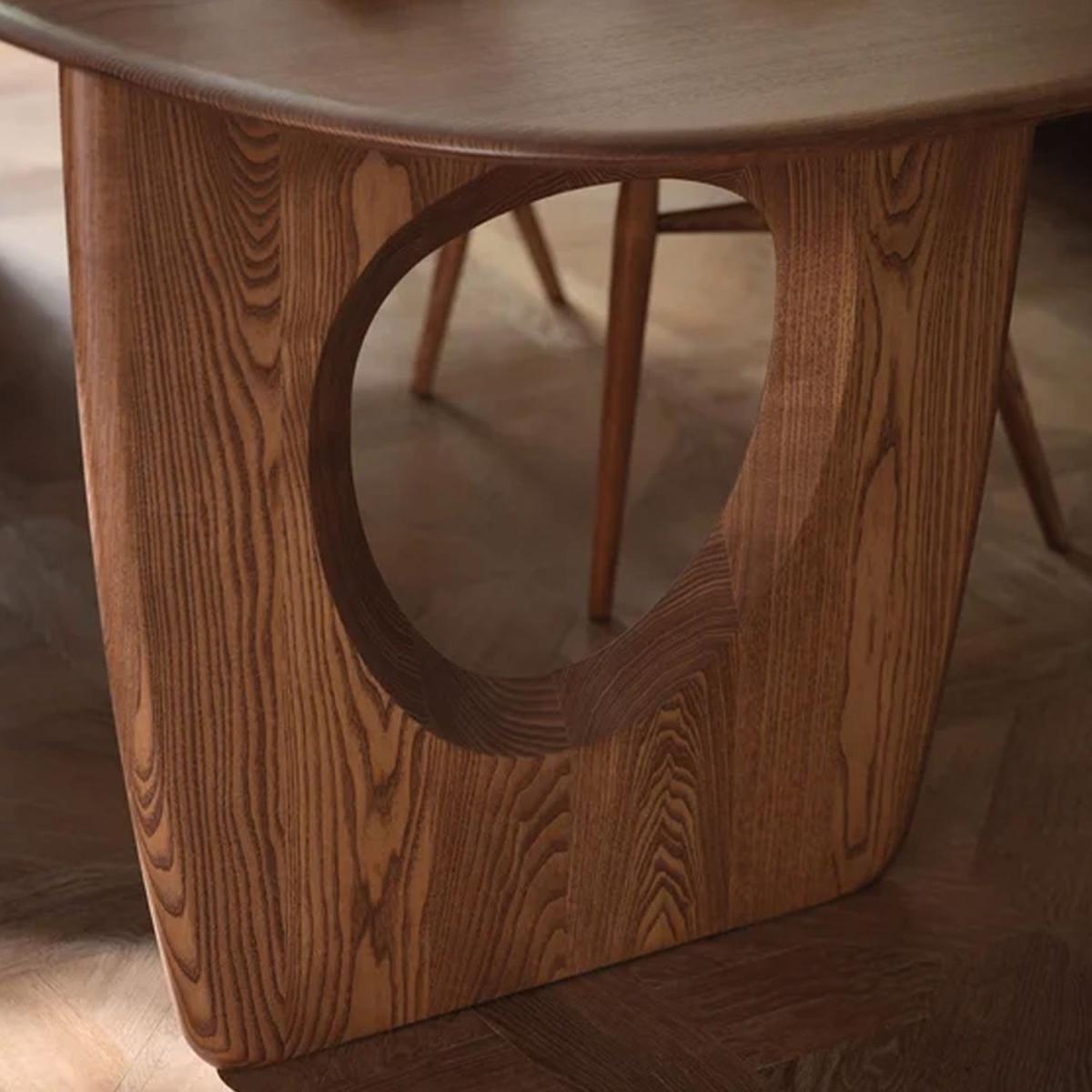 The Ercol Highmoor Extending Dining Table is a striking modern table with retro undertones that will make a statement in any home. When closed, this table seats 6 and easily extends to seat 6-8 people, giving the ability to host more guests for dinner. For maximum versatility and tidiness, the extending leaf stores neatly within the table when not needed. The dining table is made of solid ash with circles sculpted into its legs to showcase the quintessentially Ercol craftmanship.