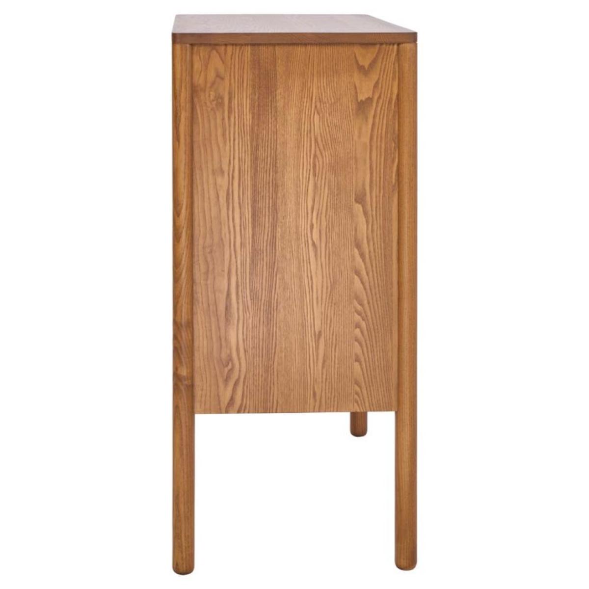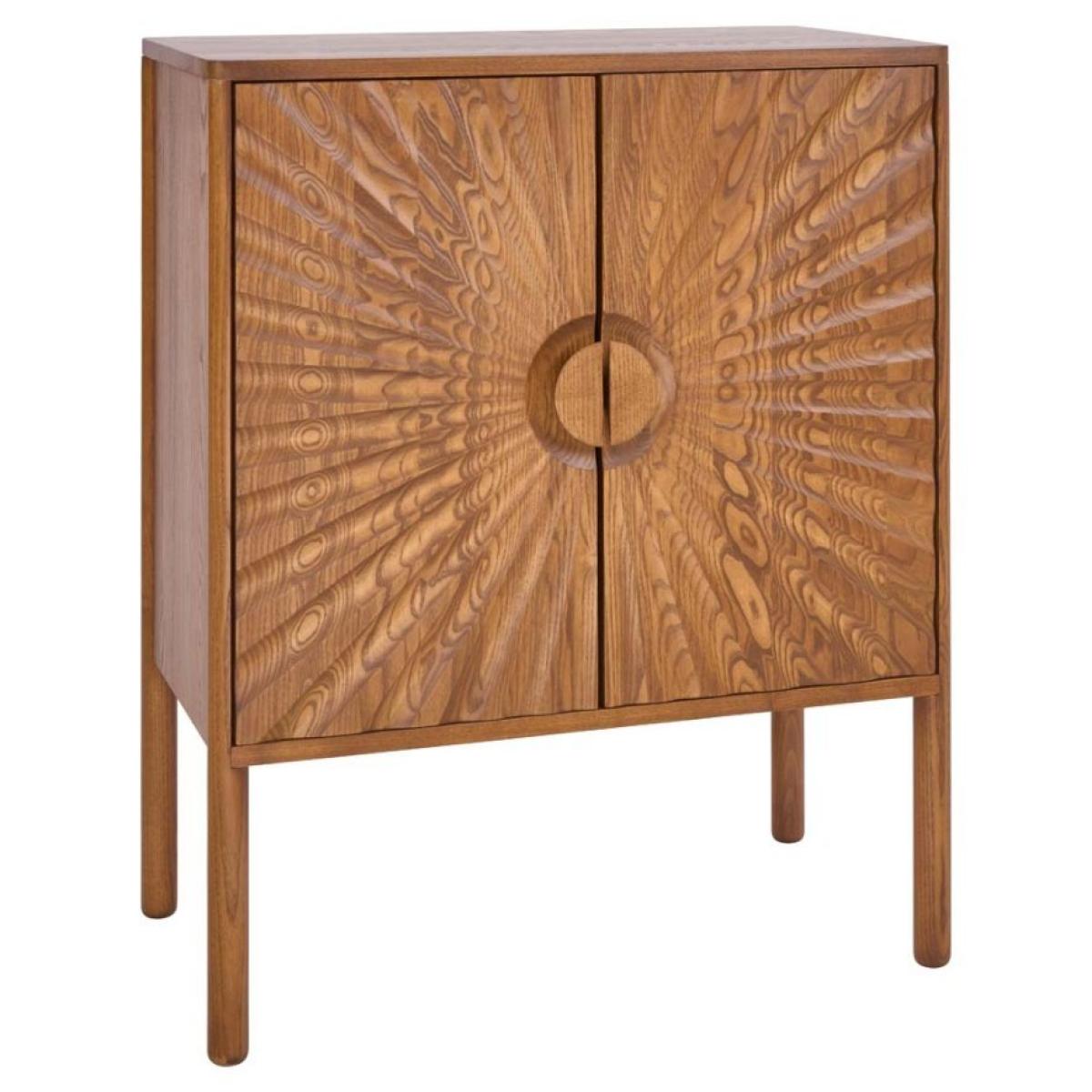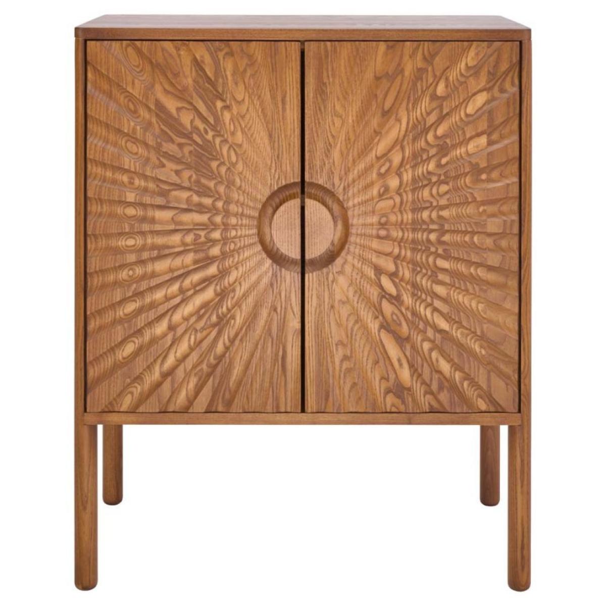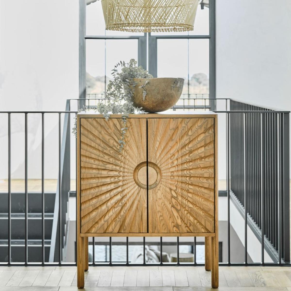 A compact storage piece that can be used to make a statement anywhere in the home. An Ercol take on maximalist - making the most of the solid wood doors, cutting into them to create depth, texture and pattern. A large disk handle sits in a gently dished recess from which the sunburst pattern radiates. (Shown above in Vintage (OG) Wood Finish).